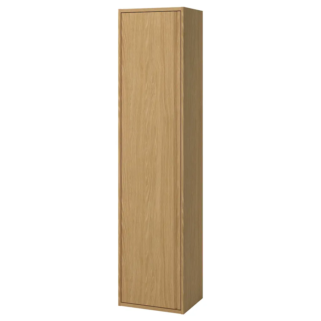 ÄNGSJÖN High cabinet with doors - brown oak effect 18x15x77 ". Generous storage on a narrow space that keeps towels, blow dryer and other bathroom essentials dust-free and out of sight. Hinges with integrated dampers catch the door and close it slowly, silently and softly.