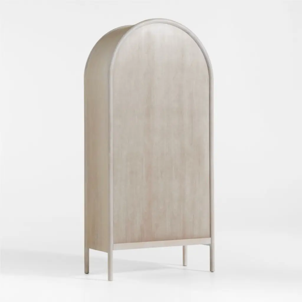The traditional curio cabinet takes a contemporary turn in Annie. Slender bentwood poles round a perfect arch to highlight the white oak showcased in large, flat-front doors. The rich grain is brought into focus with a dreamy whitewash finish. Cleanly integrated into the arcing design, the long, rounded pulls open to reveal one fixed and two adjustable shelves for stashing linens, entryway essentials or dining room serving ware. Our Annie cabinet refreshes household storage with a look that's current and clean-lined.This piece is part of our exclusive collaboration with star designer Leanne Ford. Curated and crafted around the world, the collection brings Leanne's cool, effortless vibe home to you.By choosing FSC ®-certified furniture, you are supporting responsible management of the world's forests.