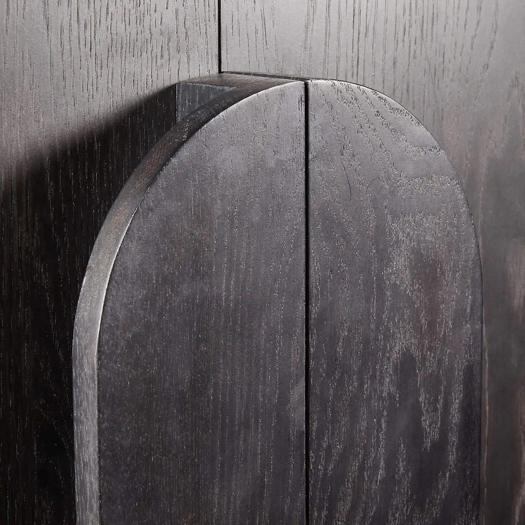 The traditional curio cabinet takes a contemporary turn in Annie. Slender bentwood poles round a perfect arch to highlight the rich grain of white oak showcased in large, flat-front doors and brought into focus with a dark charcoal finish. Cleanly integrated into the arcing design, the long, rounded pulls open to reveal one fixed and two adjustable shelves for stashing bedroom linens, entryway essentials or dining room serving ware. Designed for us exclusively by Leanne Ford, the Annie cabinet refreshes household storage with a look that's current and clean-lined.