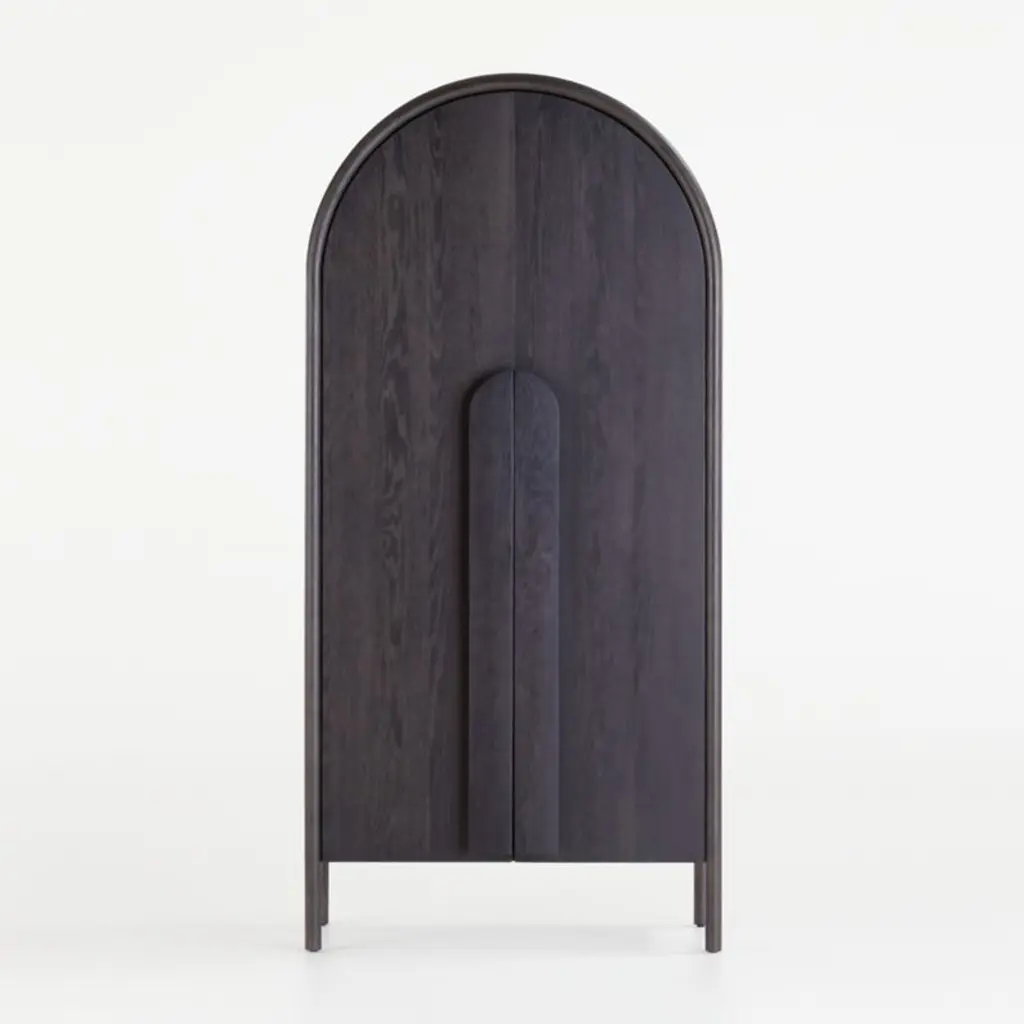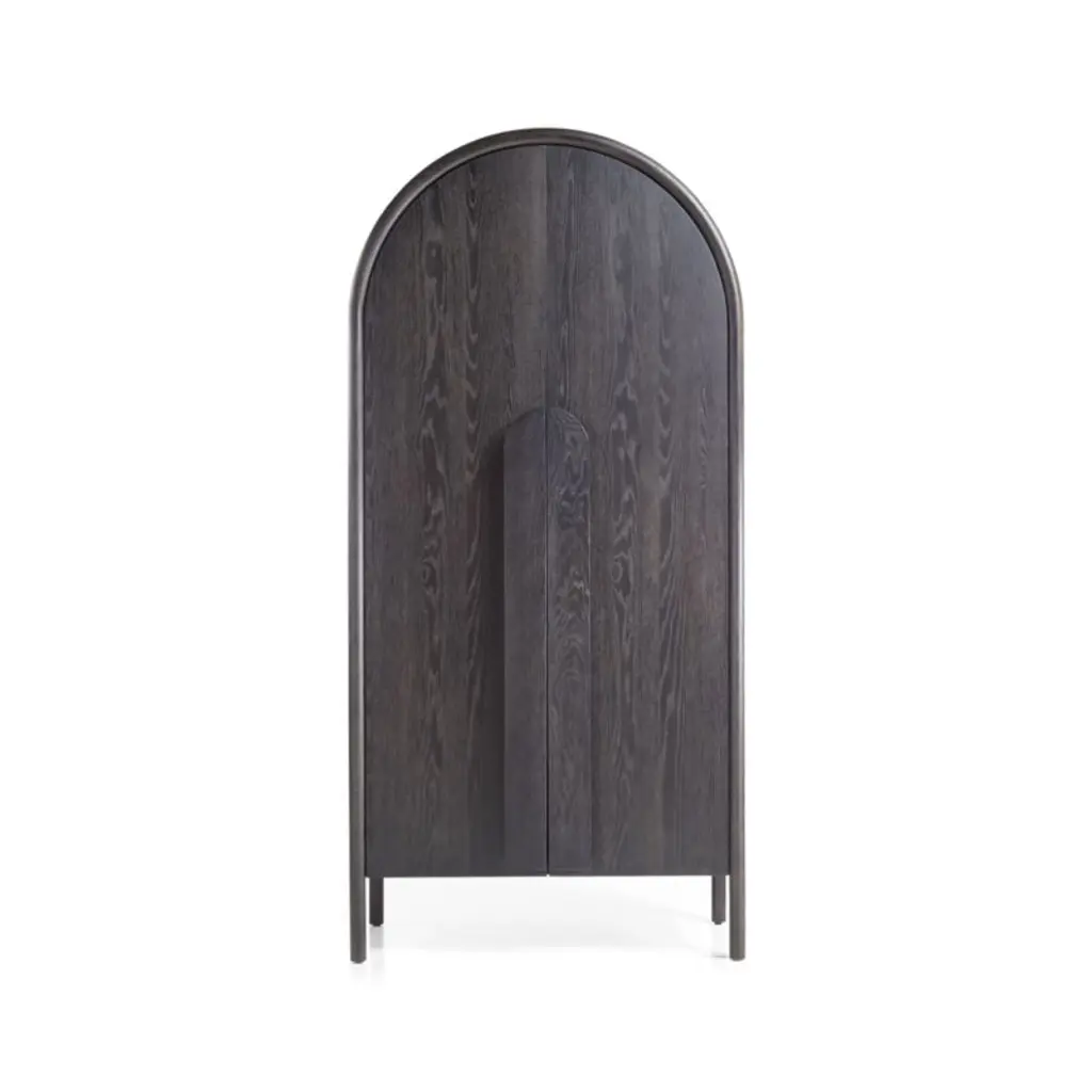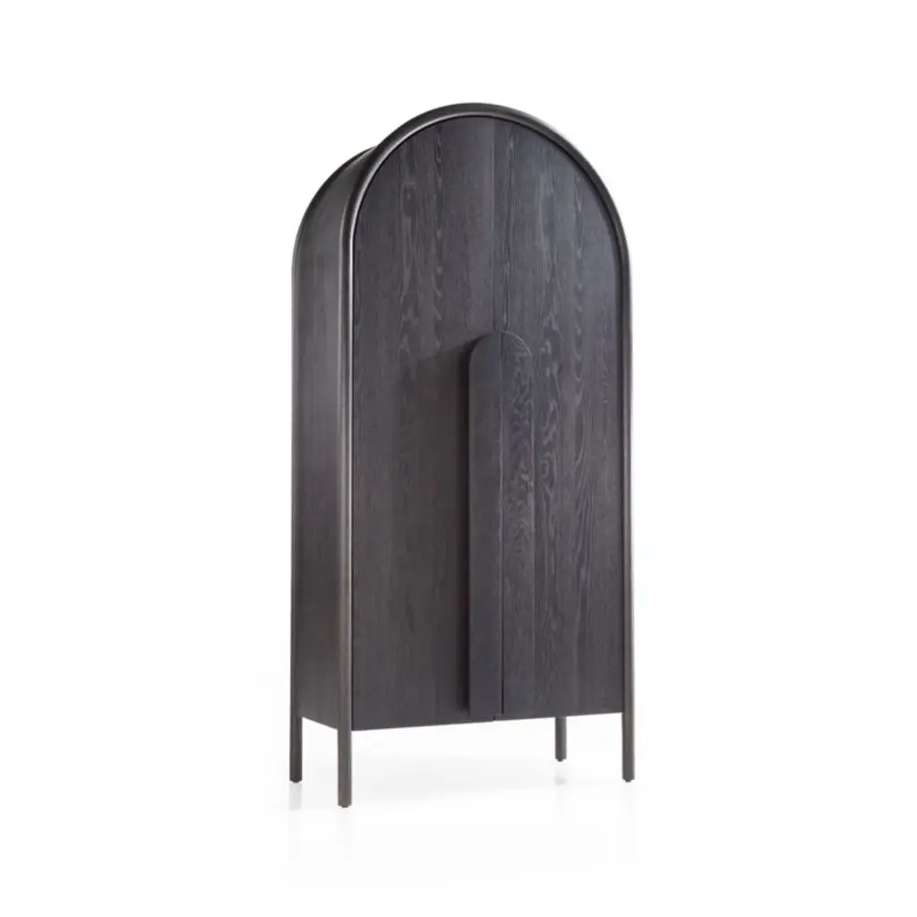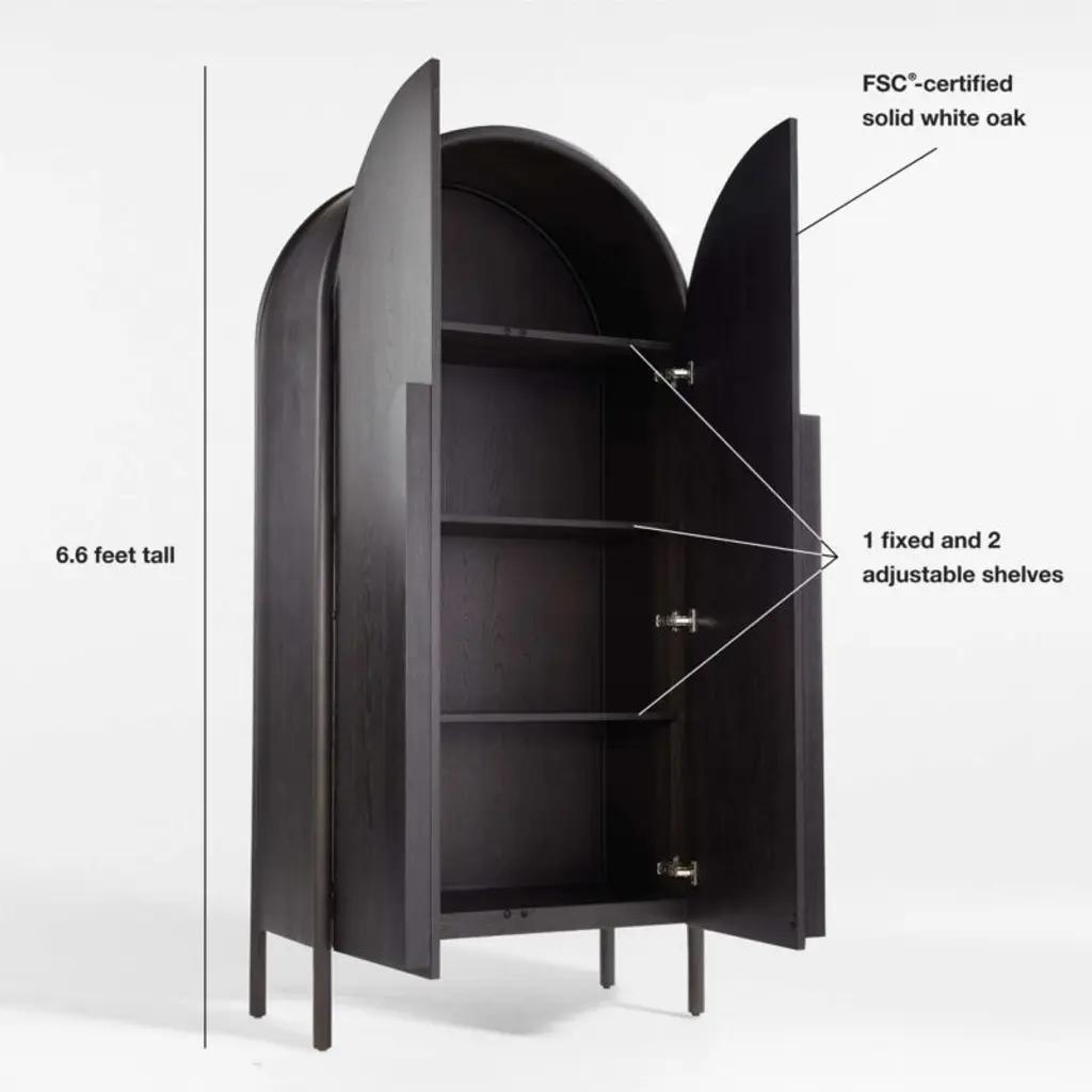 The traditional curio cabinet takes a contemporary turn in Annie. Slender bentwood poles round a perfect arch to highlight the rich grain of white oak showcased in large, flat-front doors and brought into focus with a dark charcoal finish. Cleanly integrated into the arcing design, the long, rounded pulls open to reveal one fixed and two adjustable shelves for stashing linens, entryway essentials or dining room serving ware. Designed for us exclusively by Leanne Ford, the Annie cabinet refreshes household storage with a look that's current and clean-lined.Curated and crafted around the world, our first furniture and decor collaboration with design star Leanne Ford brings her cool, effortless vibe home to you.