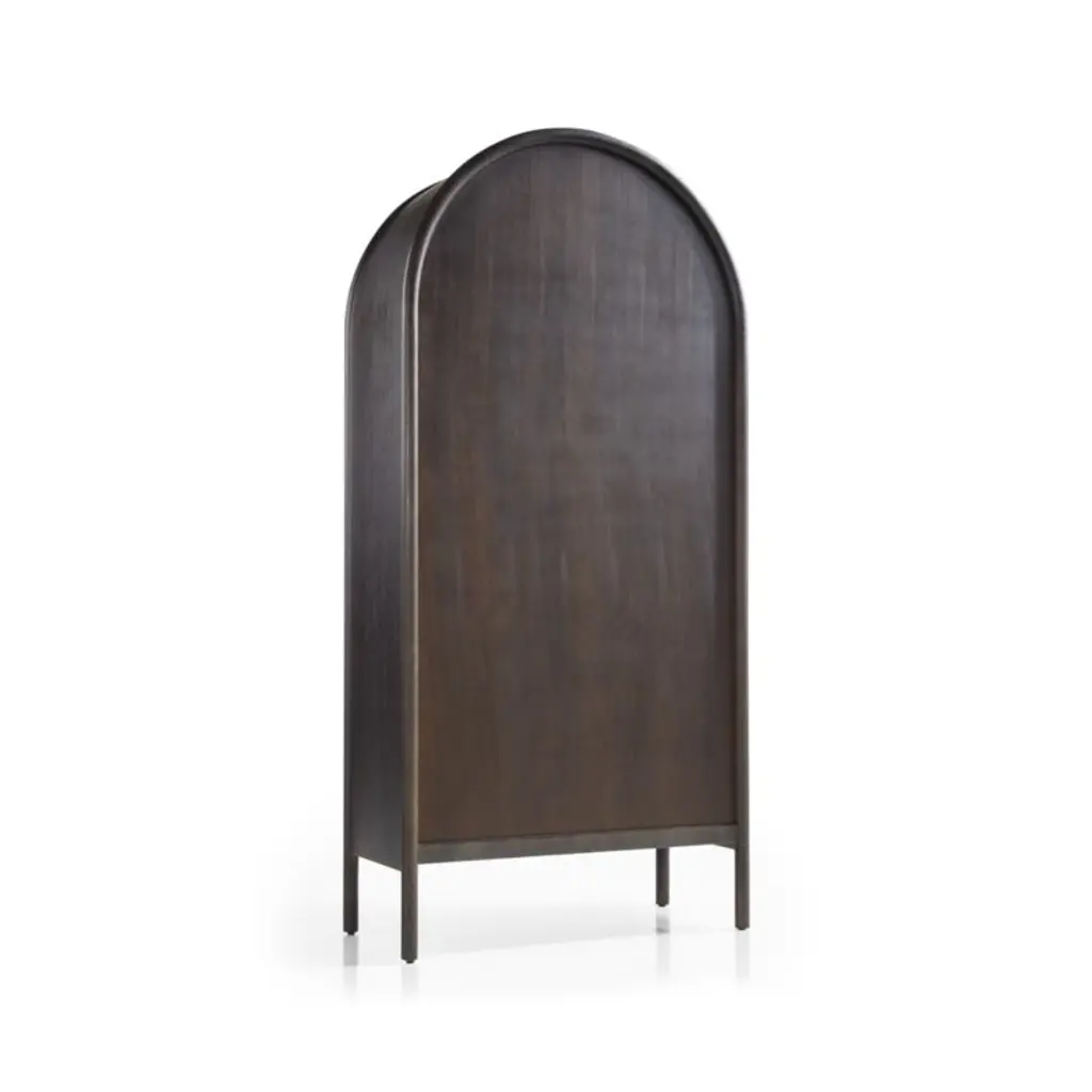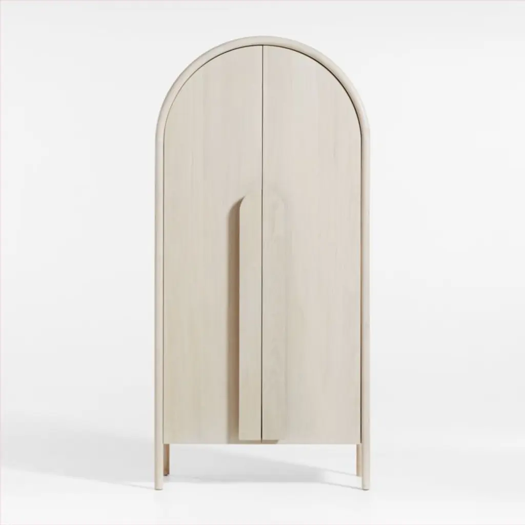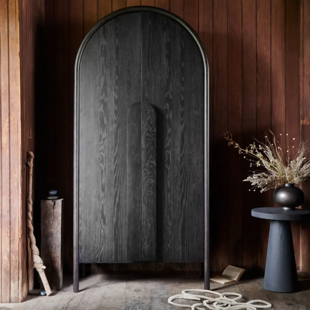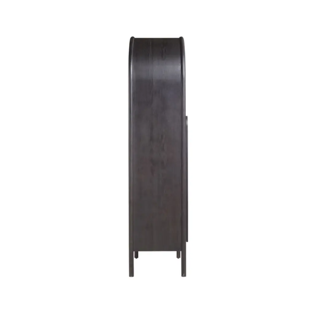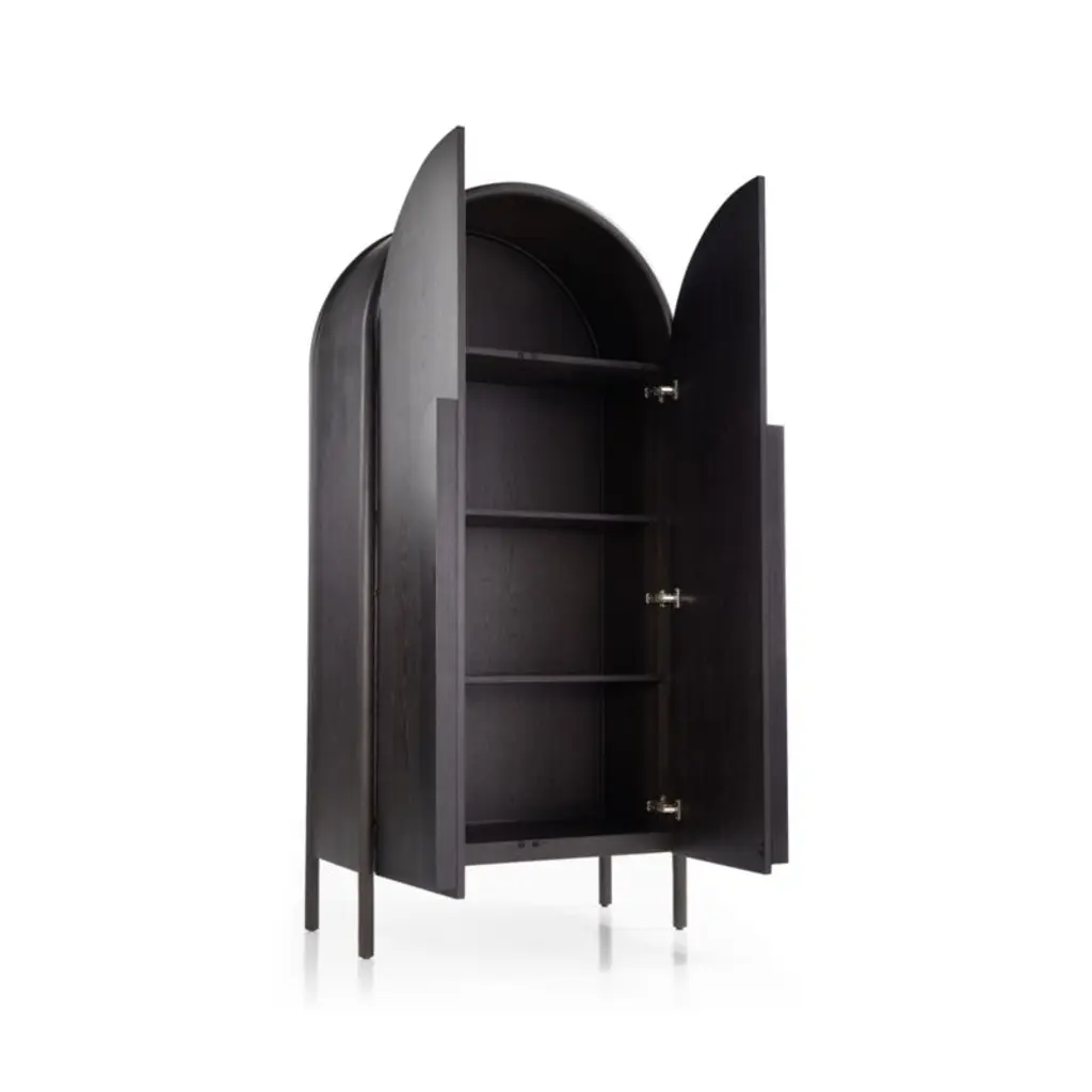 The traditional curio cabinet takes a contemporary turn in Annie. Slender bentwood poles round a perfect arch to highlight the rich grain of white oak showcased in large, flat-front doors and brought into focus with a dark charcoal finish. Cleanly integrated into the arcing design, the long, rounded pulls open to reveal one fixed and two adjustable shelves for stashing linens, entryway essentials or dining room serving ware. Designed for us exclusively by Leanne Ford, the Annie cabinet refreshes household storage with a look that's current and clean-lined.Curated and crafted around the world, our first furniture and decor collaboration with design star Leanne Ford brings her cool, effortless vibe home to you.