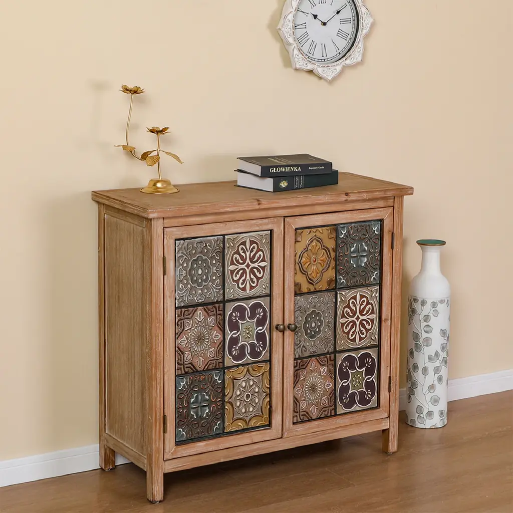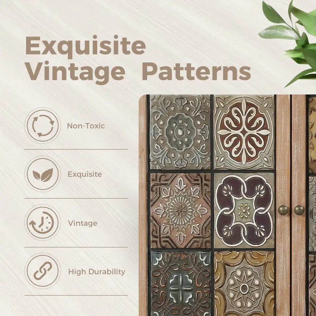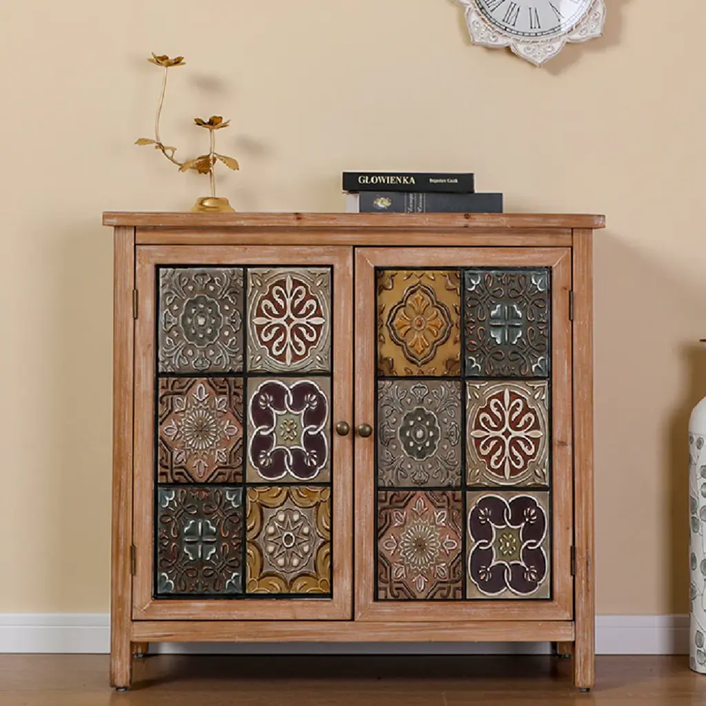 Whether you're looking to add a touch of vintage flair to your home or need a practical storage solution with a distinctive aesthetic, this antique cabinet is a perfect choice for you. Adorning the cabinet's front, the pattern consists of 12 weathered metal blocks displaying different floral meticulously arranged to create a visually striking and charming design.