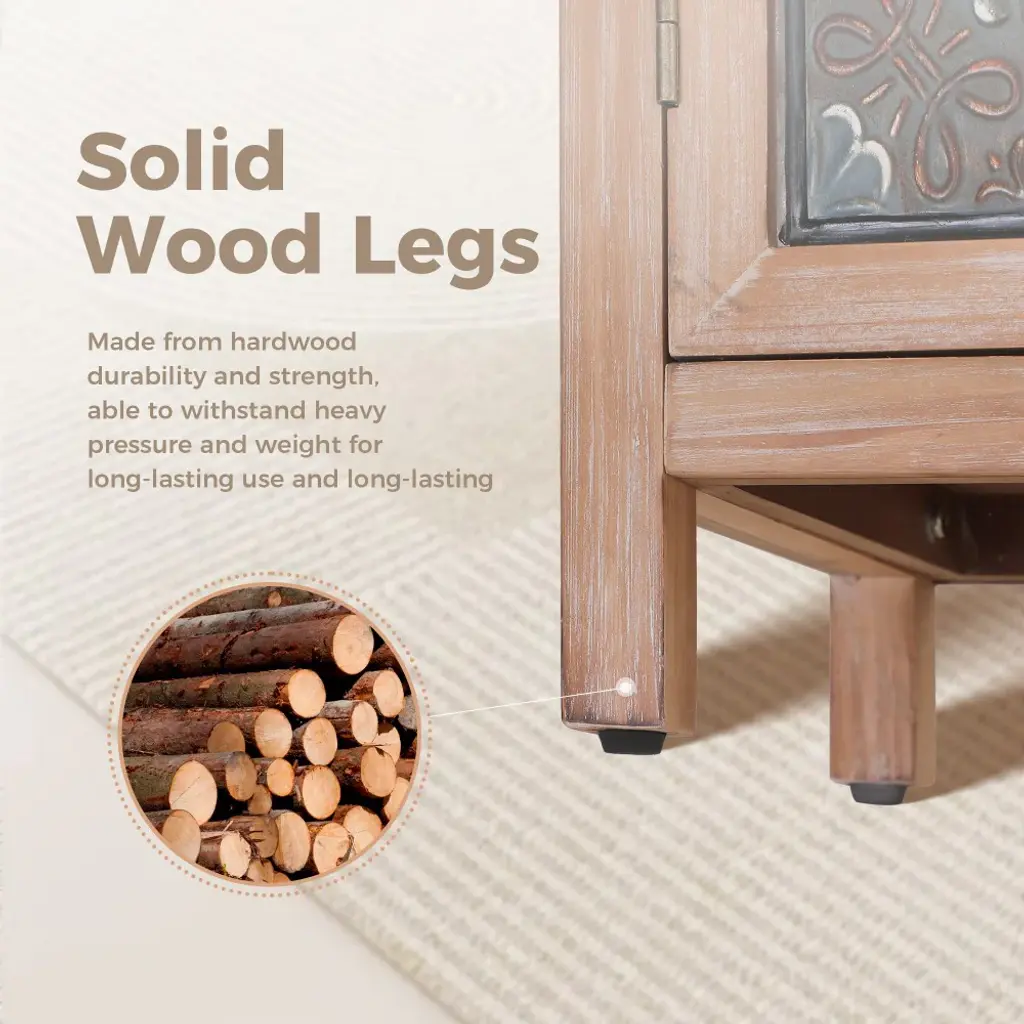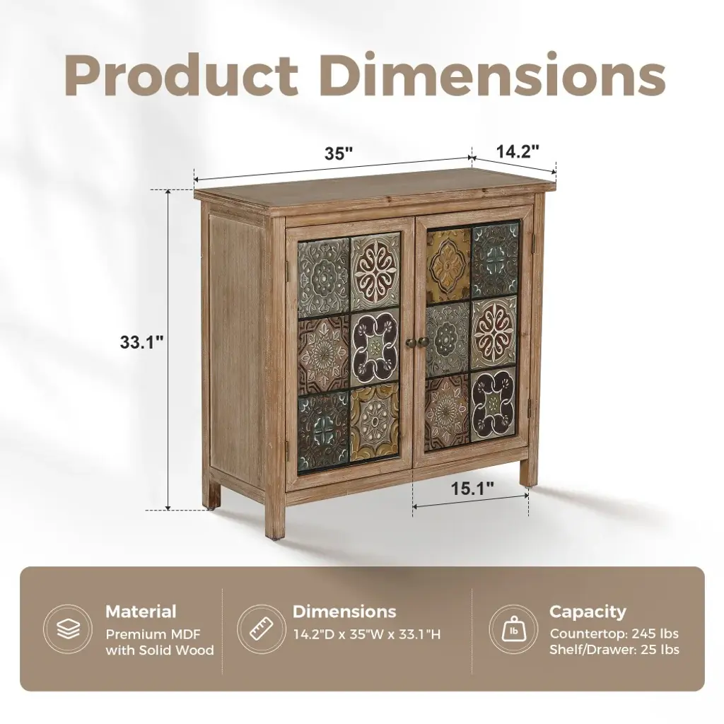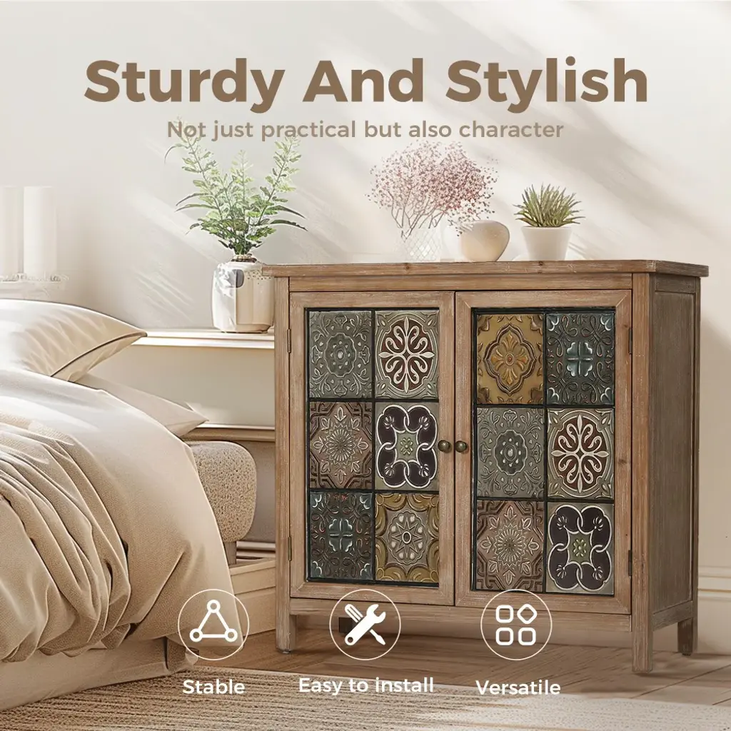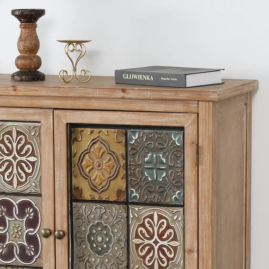 Whether you're looking to add a touch of vintage flair to your home or need a practical storage solution with a distinctive aesthetic, this antique cabinet is a perfect choice for you. Adorning the cabinet's front, the pattern consists of 12 weathered metal blocks displaying different floral meticulously arranged to create a visually striking and charming design.