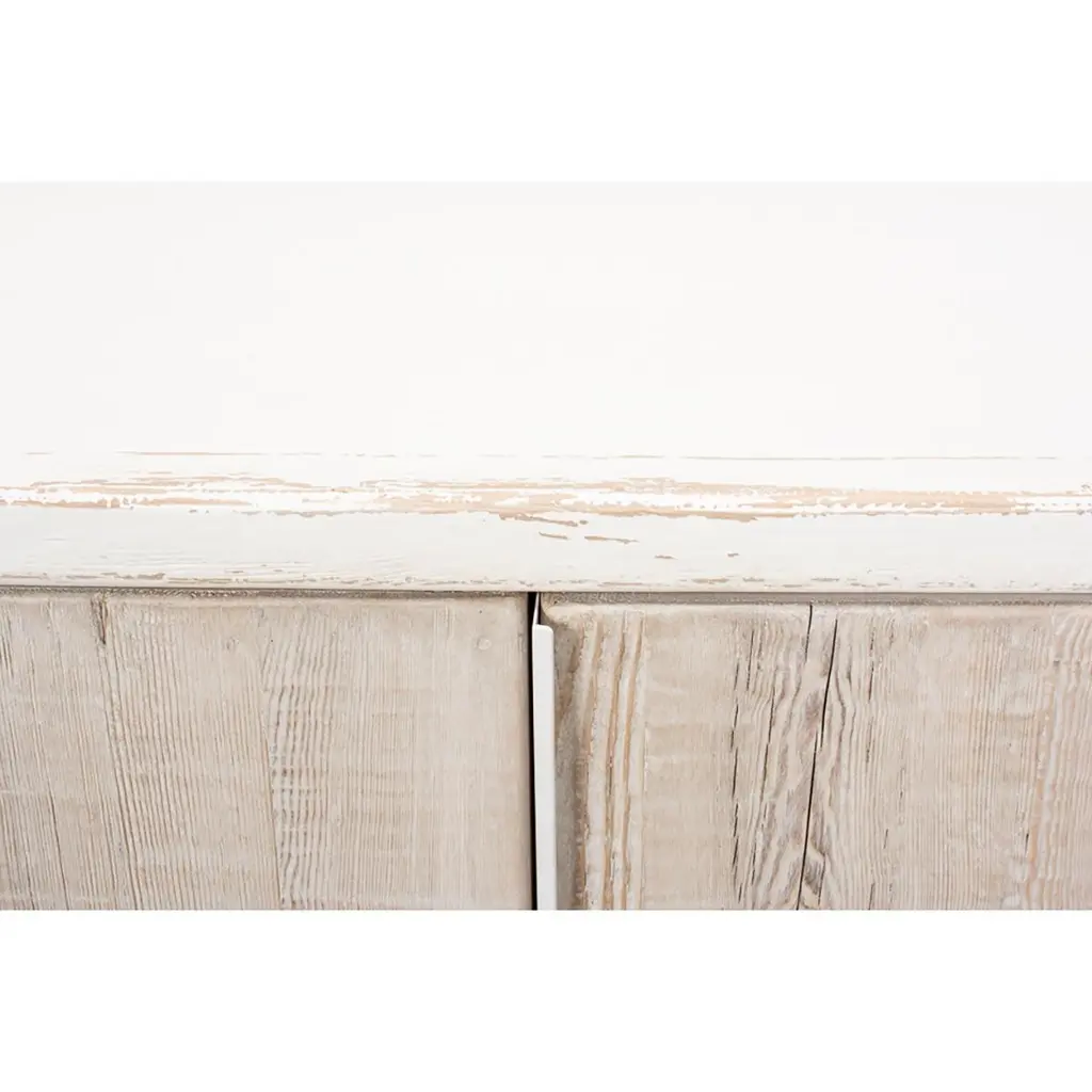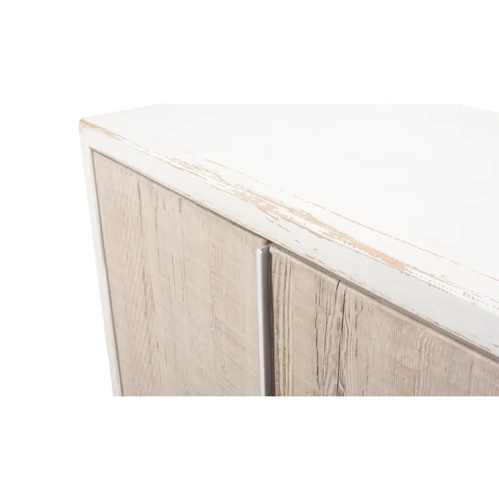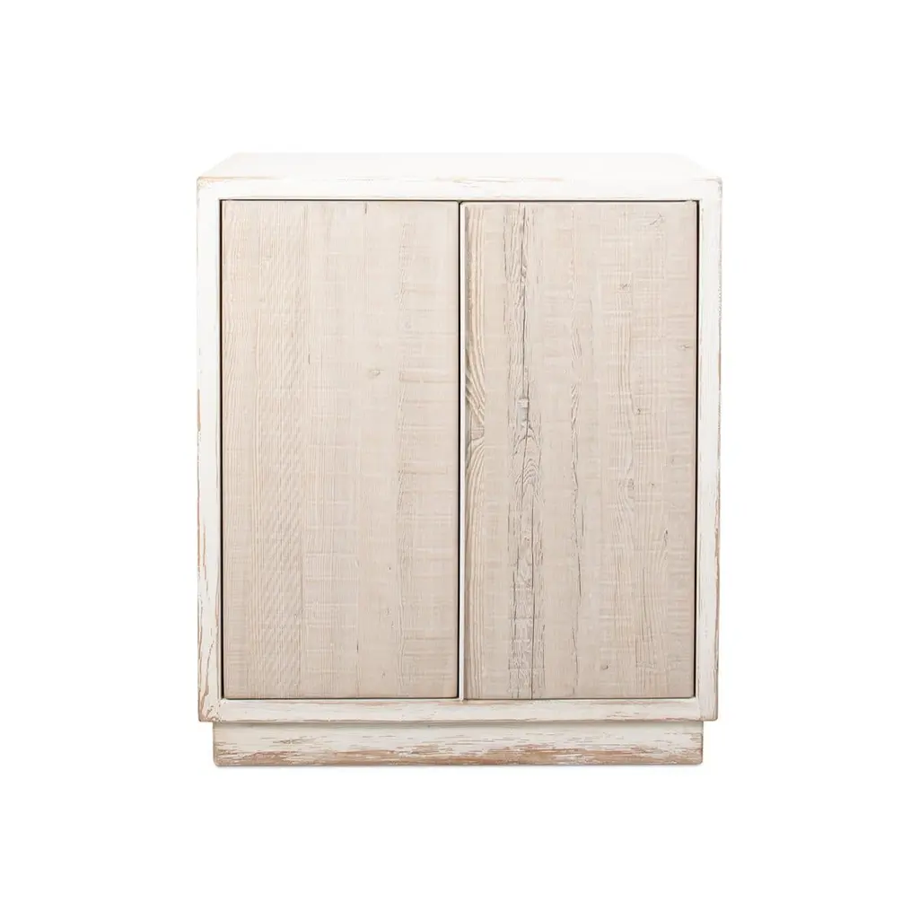 With antiqued white painted pine wood and two weathered finish doors, the interior fitted with one shelf all raised on a square plinth base.Dimensions: 32" W x 18" D x 37" H
