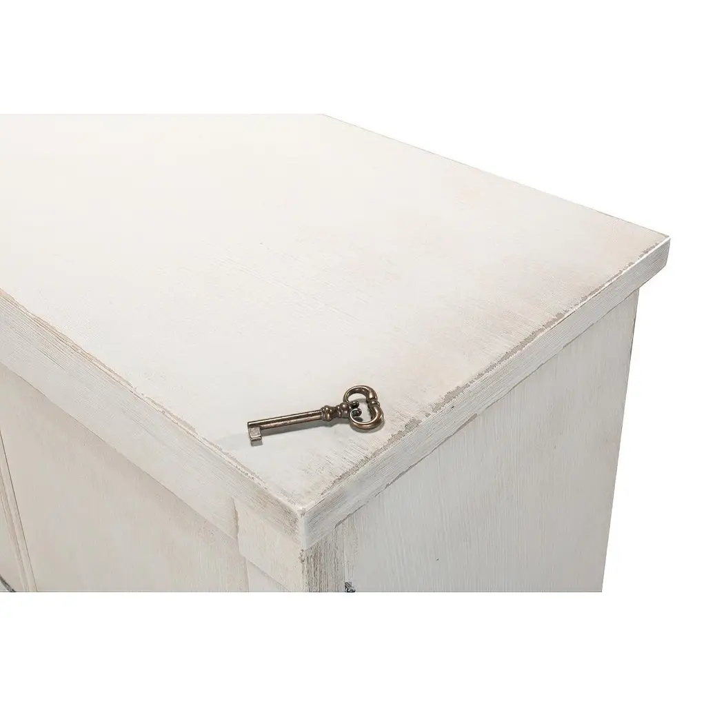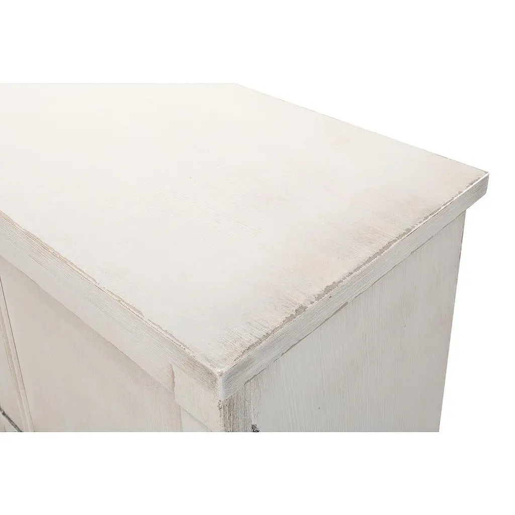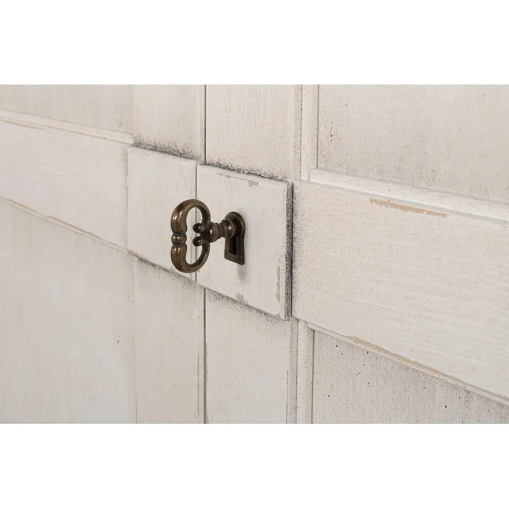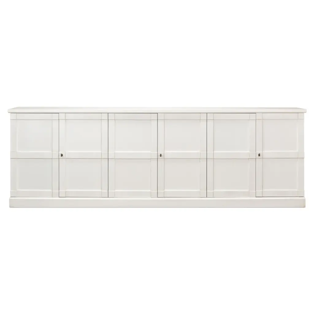 A large antiqued painted buffet cabinet. 112" long with six paneled square framed doors. 15" Deep ideal for storage.Dimensions: 112" W x 15" D x 38" H.