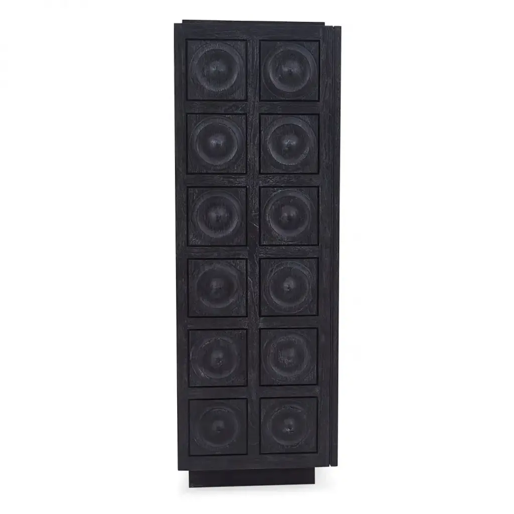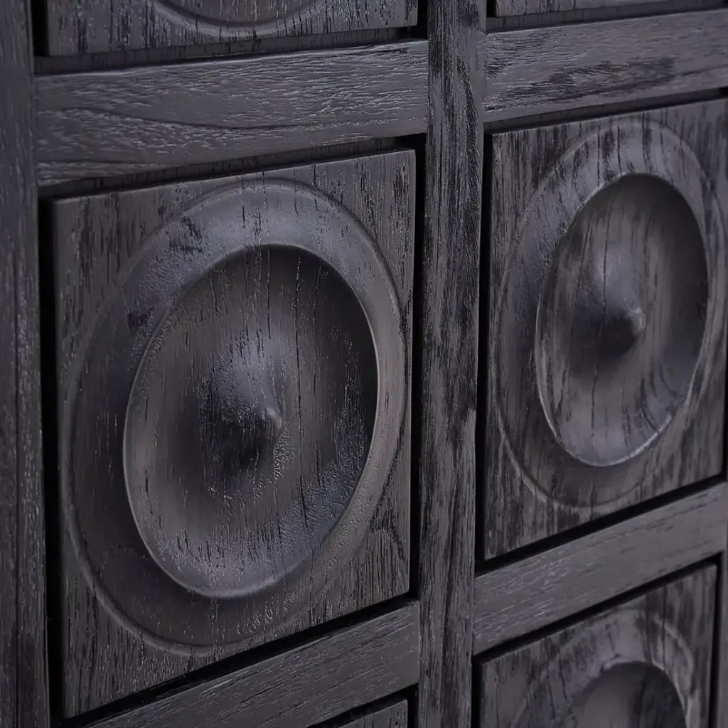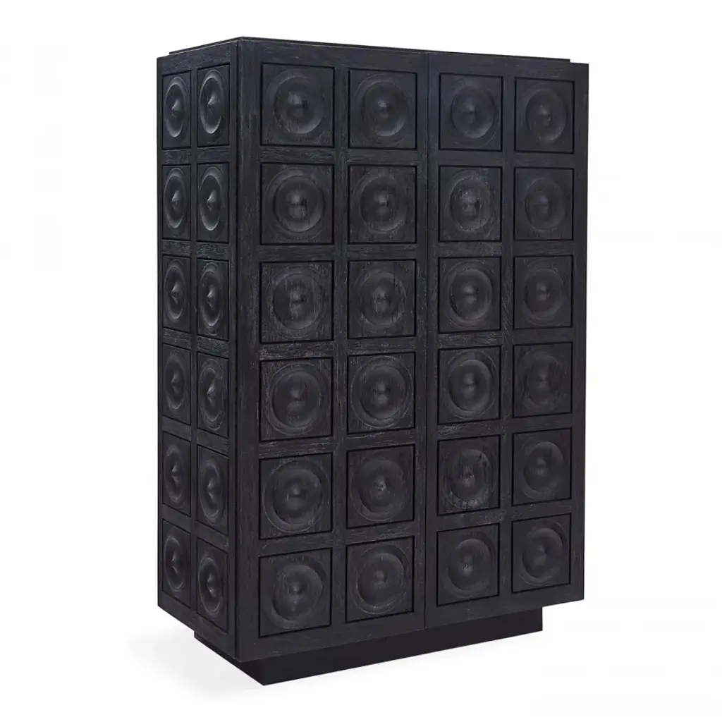 Limed Luxury.An ebonized and limed mindi wood cabinet faced with solid mindi circle tiles. Featuring hidden pulls and an interior fitted with three self-closing drawers and an adjustable shelf.Familiar but fresh, our Antwerp Circles Cabinet is the kind of piece you fantasize about stumbling upon at Paris' Marché aux Puces. Think French '50s limed furniture reimagined for the 21st century. Hardworking, chic, and durable, it's a sublime addition to your entryway or dining room.