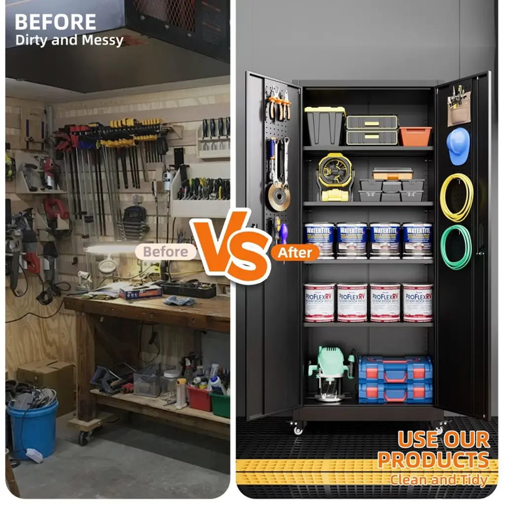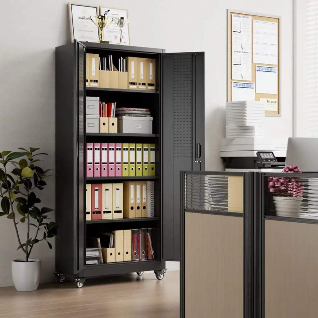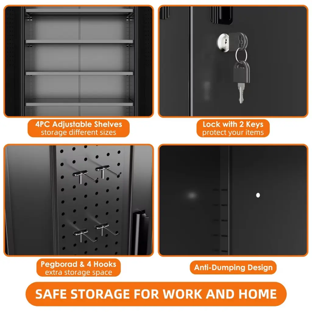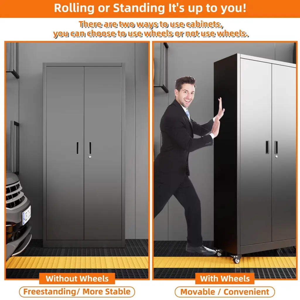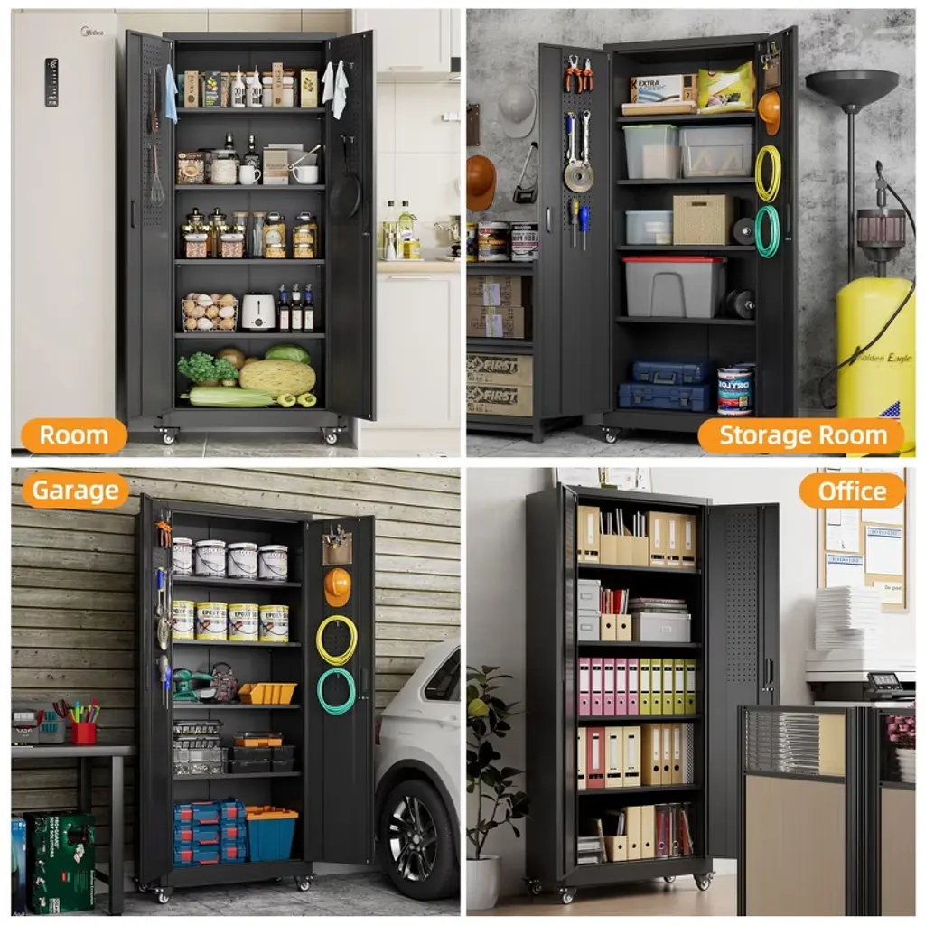 Maximize your storage with mobile versatility! This 73"H black metal cabinet rolls smoothly on 4 lockable wheels (removable for stability). Features 4 adjustable shelves and pegboard doors with 4 hooks for complete organization. Double lockable doors secure contents; scratch-resistant steel endures daily use. Perfect for garage, home office, or basement. Straightforward assembly with included hardware.
