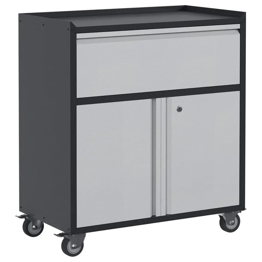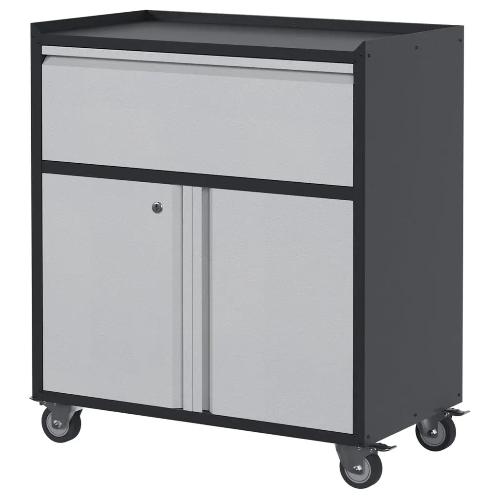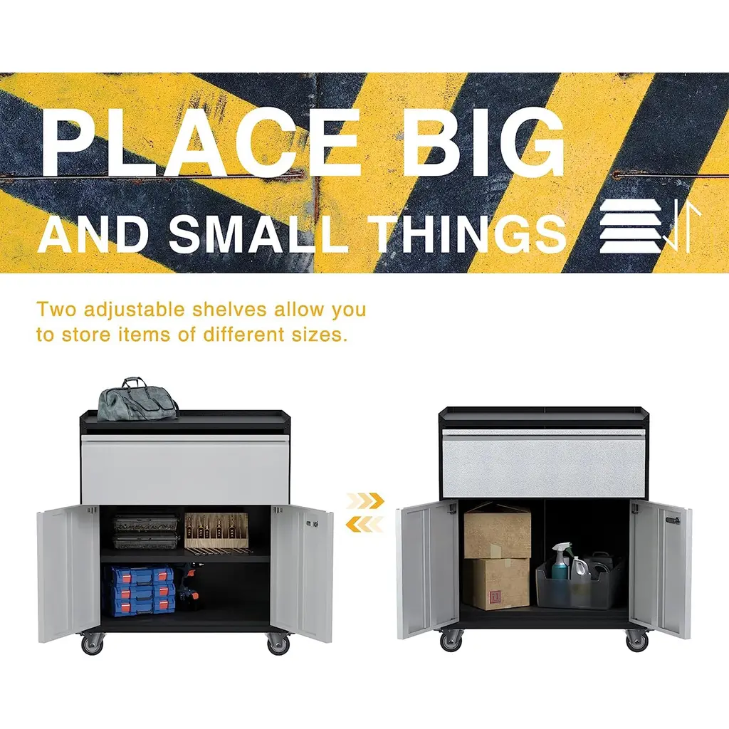 Enjoy a clutter-free and organized space for your garage, office, home, or school with the AOBABO Steel Lockable Wheeled Storage Cabinet with Drawer. This versatile cabinet combines sturdy construction, adjustable shelves, and a sleek design to meet all your storage needs. Keep your items secure and protected with the lockable wheels and doors, ensuring the safety of your valuables and power tools while offering the convenience of easy moving. The sleek and modern design seamlessly blends with any environment so you don't have to worry about redecorating. With adjustable shelves, you can customize the organizer to fit your storage requirements, great for files, art supplies, woodworking tools, and more. The additional drawer is great for easily accessing your essentials. Made from solid steel materials, this cabinet is built to last. Cleaning and maintenance are a breeze with the easy-to-clean surface, allowing you to effortlessly wipe away any dirt or spills. Get ready to experience the convenience and reliability of a well-organized space with the Aobabo Steel Lockable Cabinet with Drawer. Safeguard your valuable belongings with the lockable wheeled storage cabinet with drawer that provides peace of mind and enhanced security Adjustable shelves allow you to configure the cabinet fit to accommodate your unique storage needs Cabinet top features 3 guardrails to keep small items from falling Crafted from sturdy solid steel material ensuring exceptional durability and long-lasting performance Multifunctional all-in-one design with drawer ideal for storing various items such as tools, supplies, files, and much more Easy-to-clean surface makes maintenance a breeze, simply wipe away any dust or spills to keep it looking pristine Lockable wheels and doors ensure that your tools and equipment stay safe and secure while offering the convenience of easy moving Maximum weight capacity: 160 pounds (80 per shelf) Material: Steel Color: Black/Grey Dimensions (L x W x H): 30.31 x 18.11 x 35.33 inches Weight: 78.1 pounds Manufacturer warranty: 30-day warranty