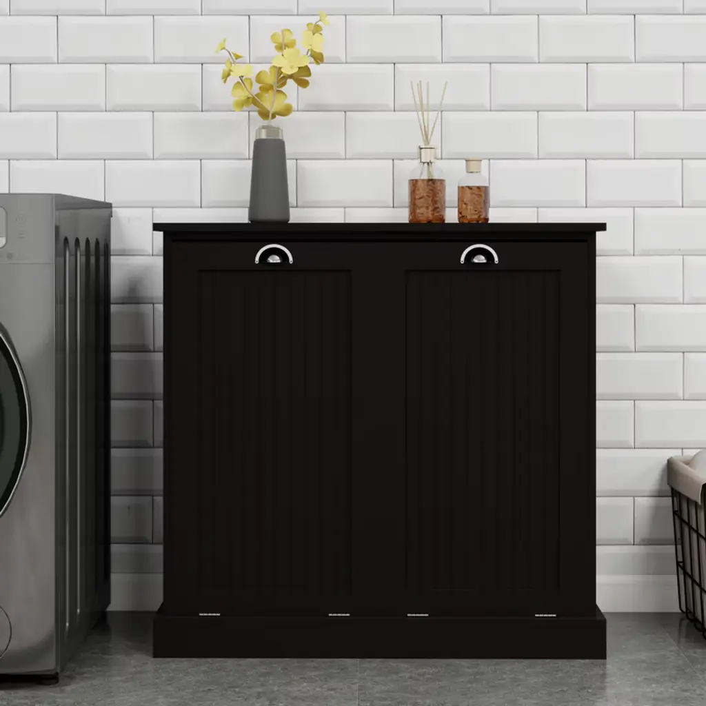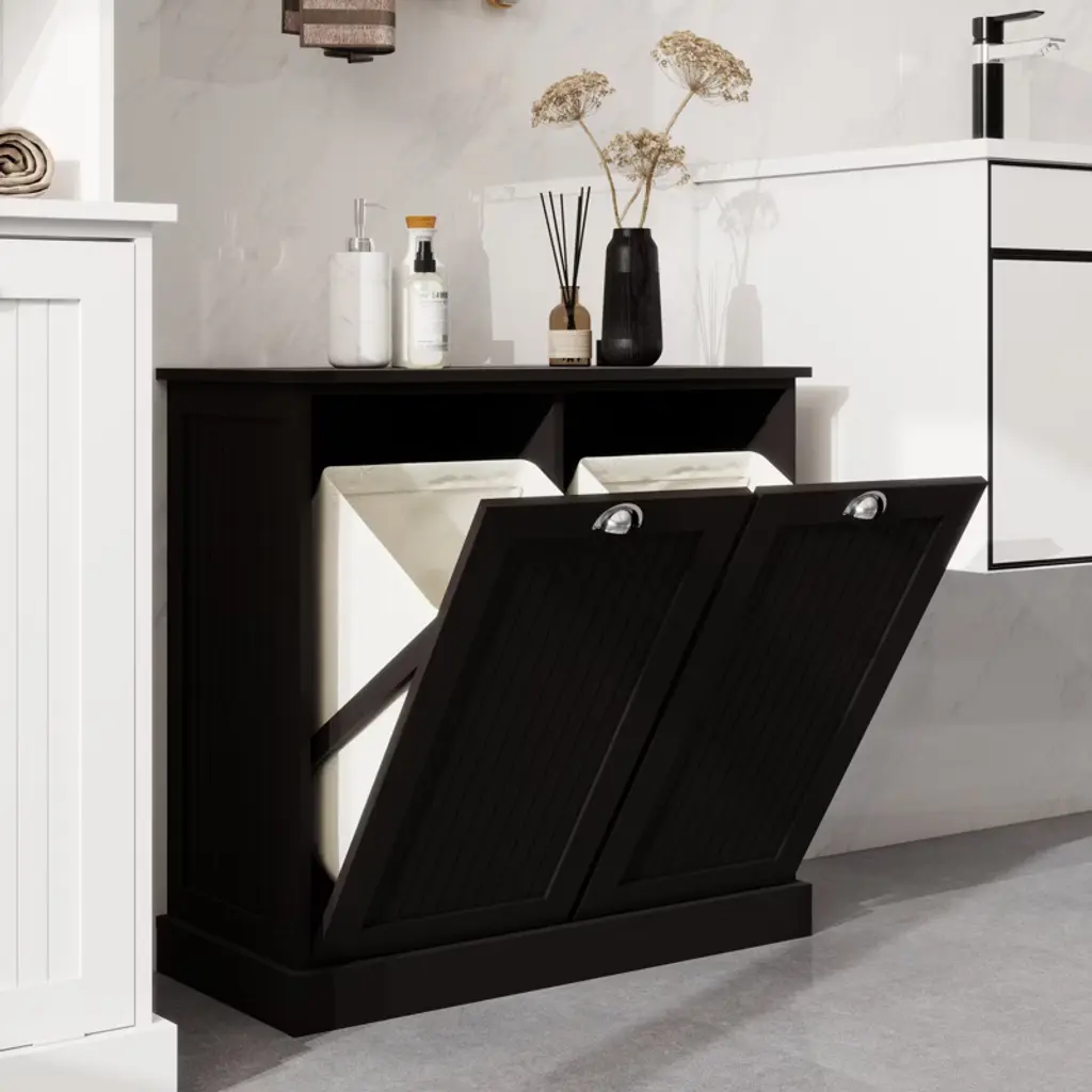 This laundry sorter cabinet features a stylish design that complements various home décors, with a moisture-resistant, non-deforming structure built to last. It includes two compartments with removable cloth bags for easy sorting and discreet storage of laundry and towels. Pre-cut, pre-drilled components and included hardware ensure quick, hassle-free assembly.