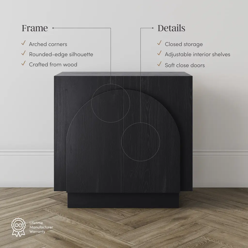 We can't take our eyes off the Iris storage cabinet! With its graceful arched corners and a rounded-edge silhouette, the Iris offers a seamless blend of mid-century charm and modern functionality. Finished in a rich Black Oak, this piece includes closed storage with an adjustable interior shelf to adapt to your needs. Perfect for elevating your entryway, organizing your home office, or adding a touch of sophistication to your living space. The smooth lines and understated design make the Iris an irresistible choice for any contemporary home.