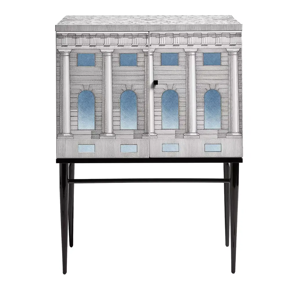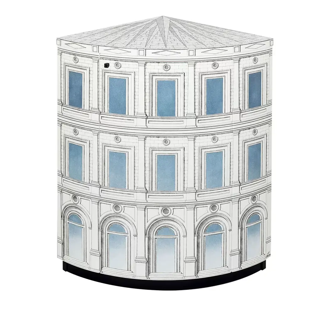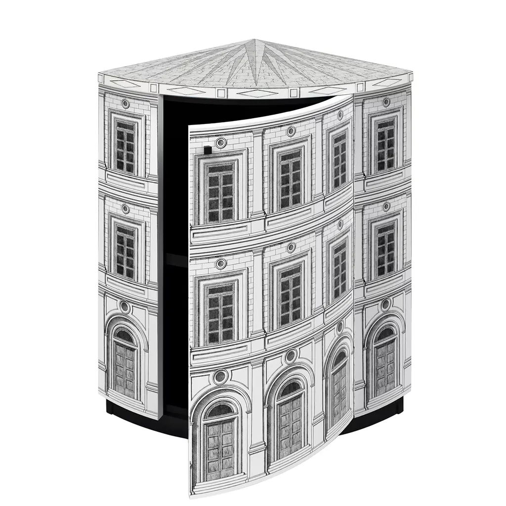 Designed to be placed in the corner of a room, this piece of furniture - silkscreened and lacquered by hand - still manages to become the center of attention thanks to the power of its decoration, inspired by Italian Neoclassical architecture. Any minor discrepancies between similar creations are the result of artisanal production methods and attest to the uniqueness of each product.