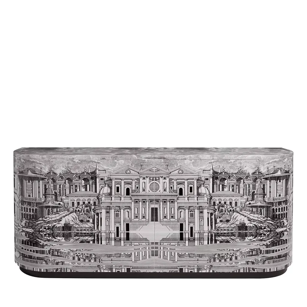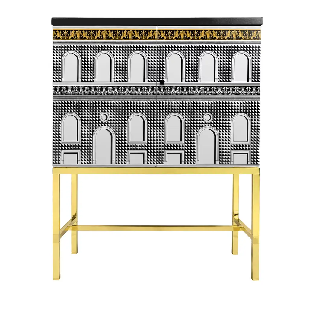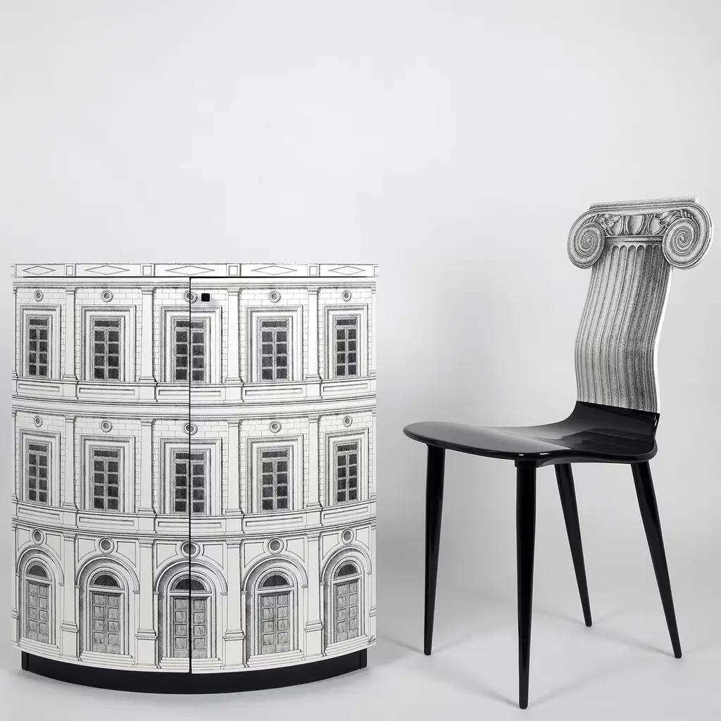 Designed to be placed in the corner of a room, this piece of furniture - silkscreened and lacquered by hand - still manages to become the center of attention thanks to the power of its decoration, inspired by Italian Neoclassical architecture. Any minor discrepancies between similar creations are the result of artisanal production methods and attest to the uniqueness of each product.