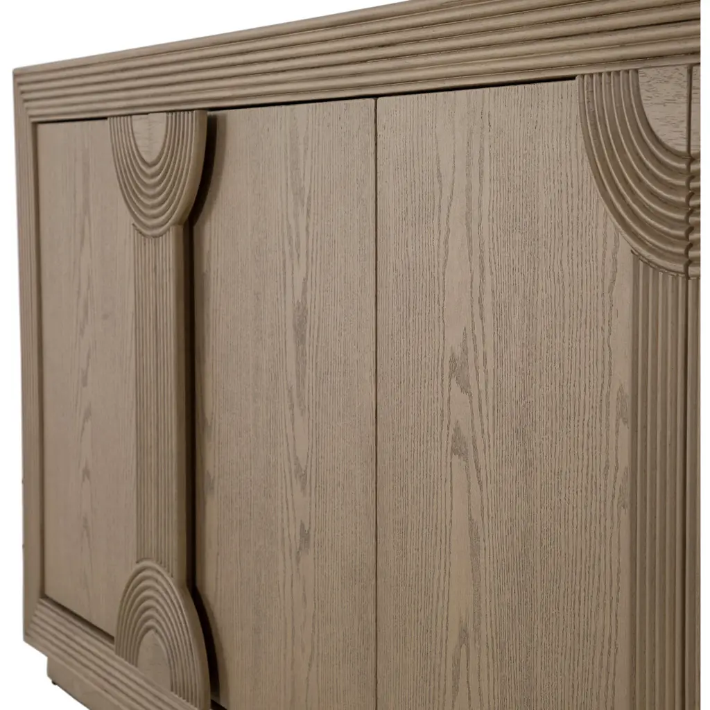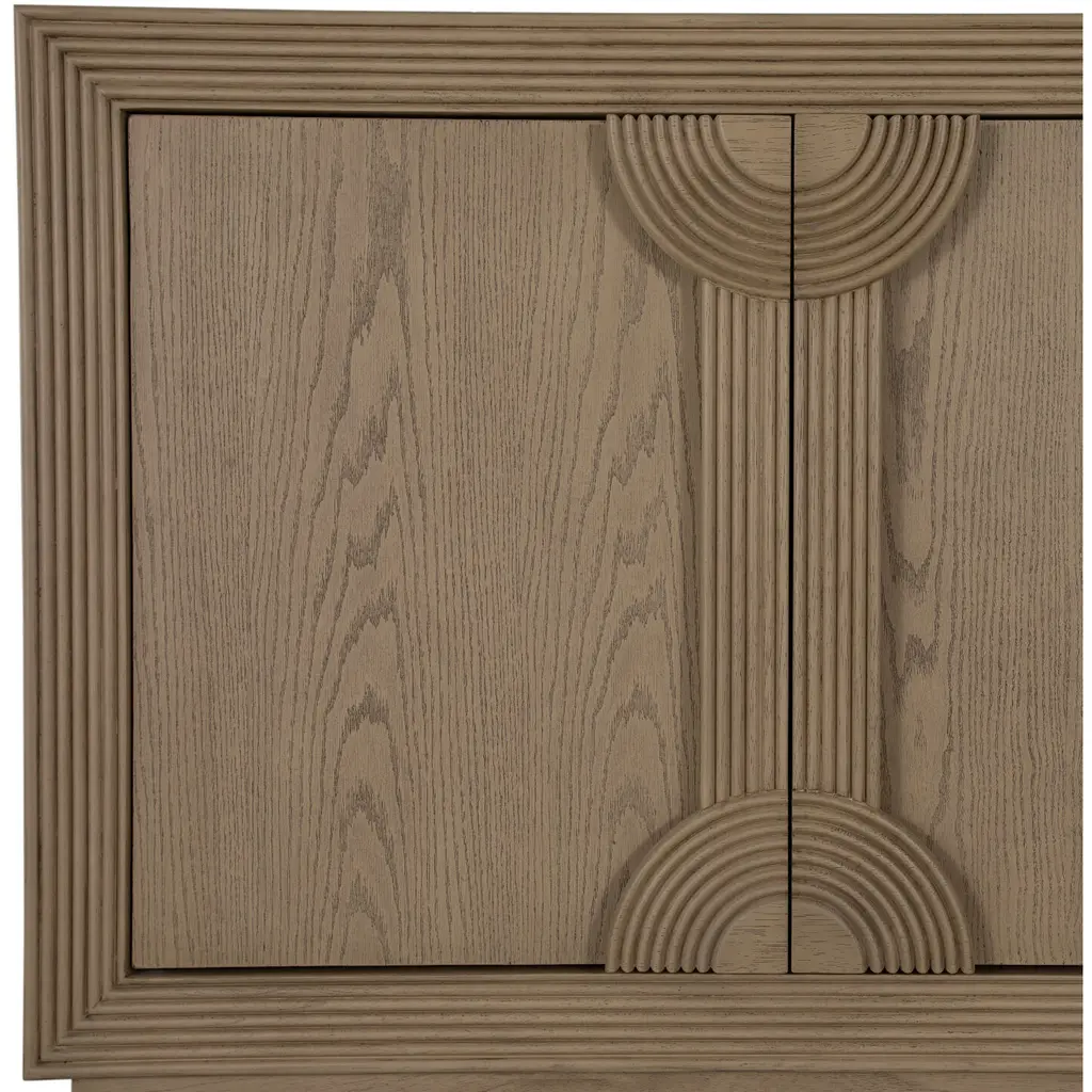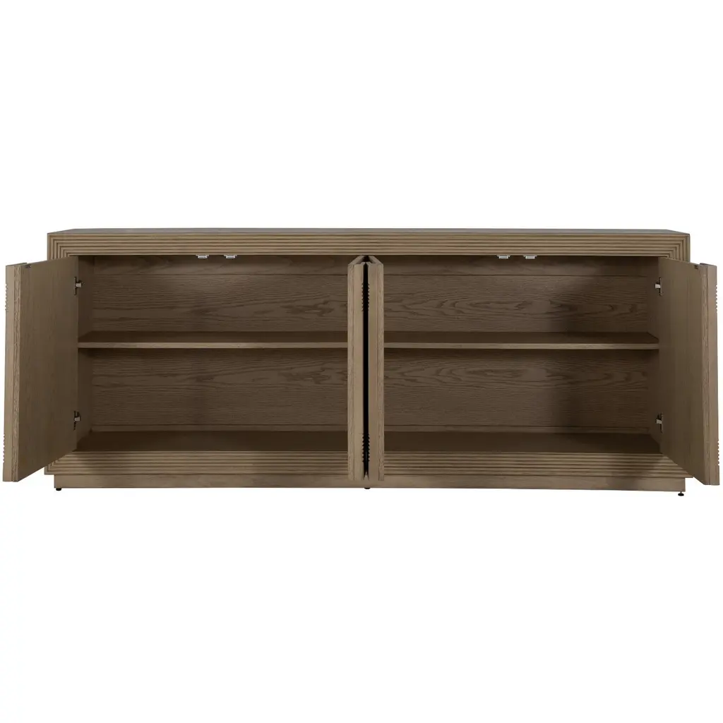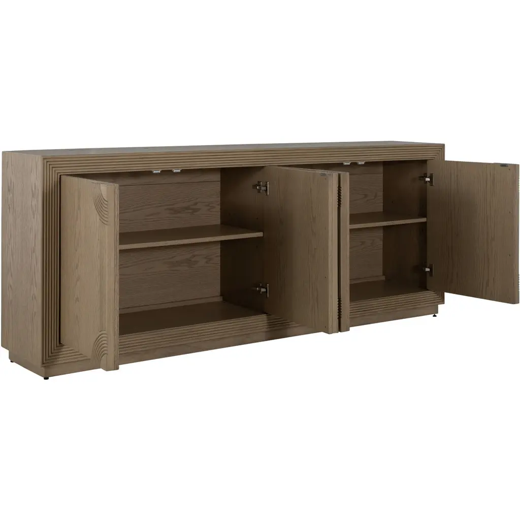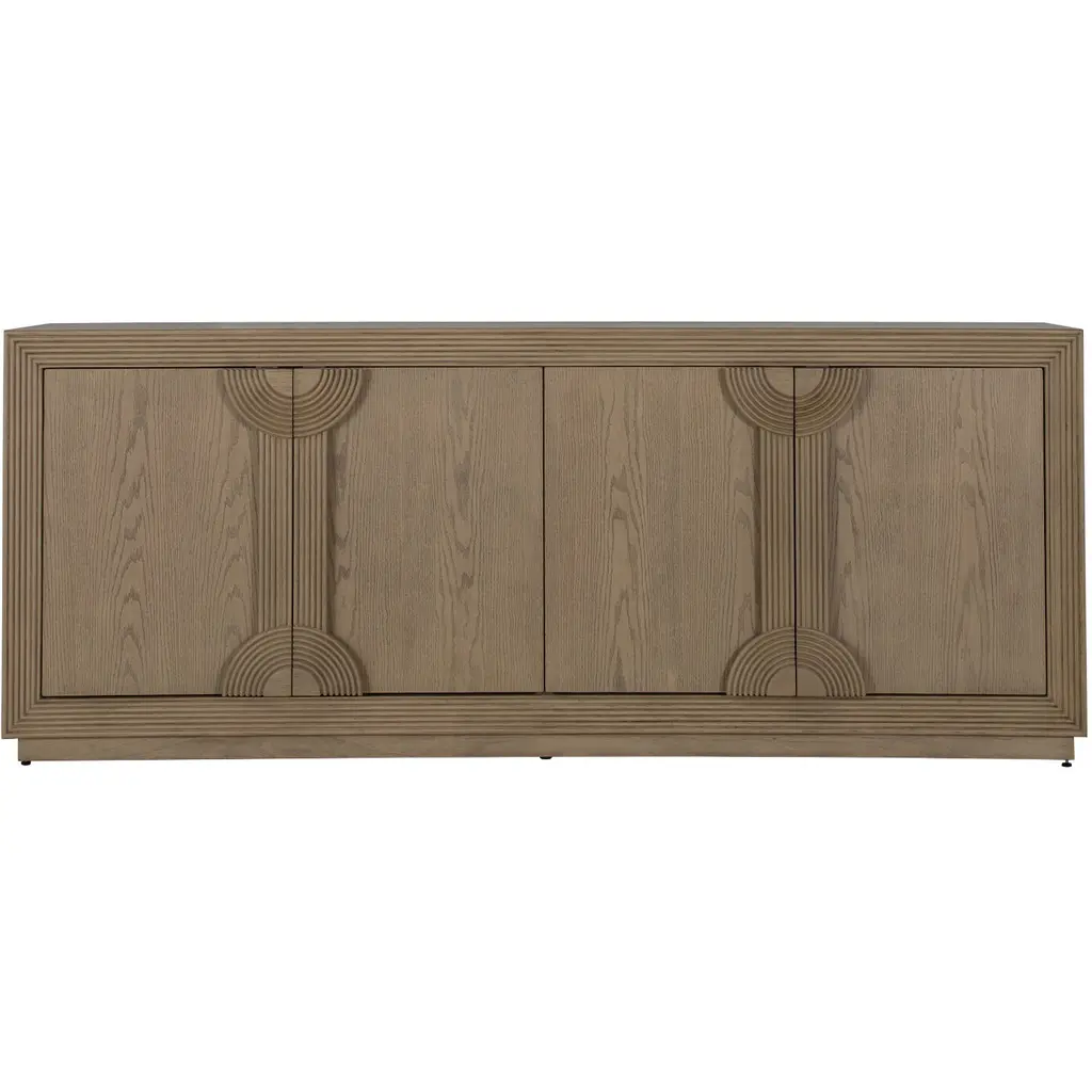 The Aero Sideboard features clean lines with a simple silhouette, adorned with distinctive geometric patterns that double as handles for access to the generous storage space inside. The warm, natural finish gives the sideboard a subtle and refined elegance, in contrast to the black finish, which offers a more dramatic look. The Areo Sideboard is a great storage solution for living, or dining spaces. This product uses natural or handmade materials, so variations in color and pattern are to be expected and celebrated.