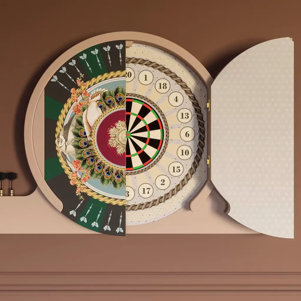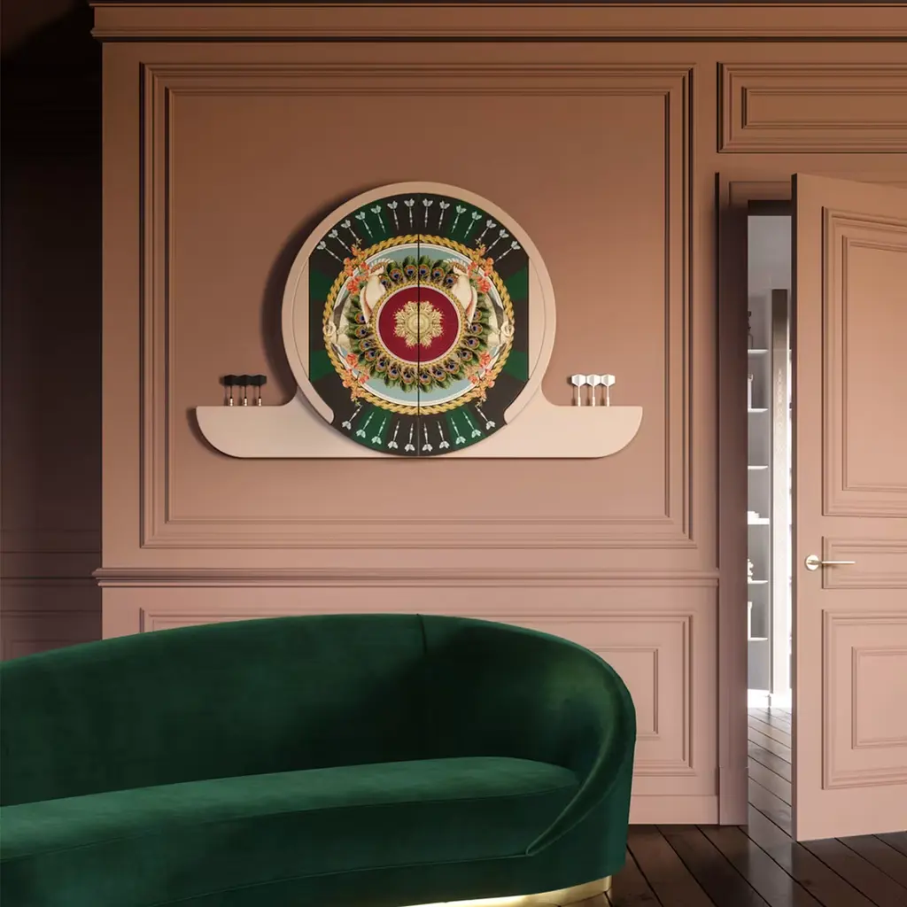 The Argo Circus Dartboard Cabinet features a modern, eccentric design with surrealistic illustrations on its two doors. Inside, it houses a regulation target made of African Sisal, a natural fiber that allows to avoidance of permanent holes. A printed foam with a geometric pattern, placed around the target and on the inside of the doors, protects the cabinet from unlucky shots. The darts cabinet also includes two sets of darts (6 pieces) neatly placed in specific lateral spaces.
