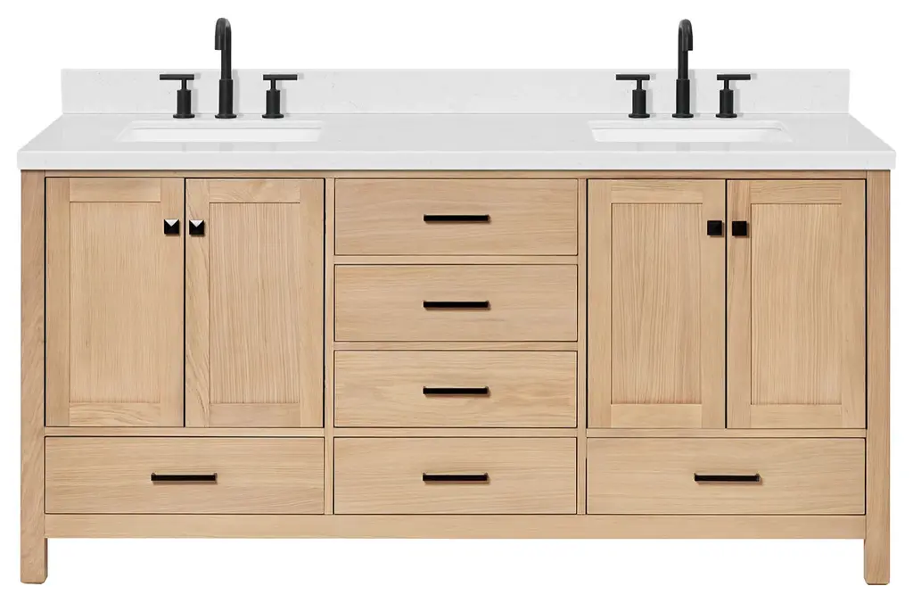 The Cambridge vanity with hardwood frame is the perfect choice for those looking for a contemporary bathroom vanity that will be the center focal point for your updated bathroom. Featuring shaker style doors and flat panel drawers, this bathroom vanity will be sure to highlight any bathroom environment and create a luxurious spa-like experience in anybody’s home. Included Components: Covered under Ariel's 3 year limited warranty Wood vanity cabinet with 4 doors and 6 drawers Quartz vanity top with two sinks and backsplash Faucet is not included and must be purchased separately Cabinet Features: Constructed from wood providing a lifetime of durability Free standing installation - vanity is seated on the floor with wall anchors, providing a functional design 4 door design provides easy access to storage space 6 full extension drawers with soft-close slides allows for organized storage Soft close drawer slides operate on smooth ball-bearings and prevent drawers from slamming shut Vanity cabinet includes matching decorative hardware Vanity will need to be assembled Vanity Top Features: Quartz vanity top includes two sinks 6 pre-drilled faucet holes per basin Each sink features its own rectangular single basin workspace Center drain location provides optimal draining capability Equipped with an overflow drain to help prevent spillage Vanity top includes matching backsplash Cabinet Specifications: Cabinet Width: 72" (left to right) Cabinet Height: 34-1/2" (top to bottom) Cabinet Depth: 21-1/2" (front to back) Number of Doors: 4 Number of Drawers: 6 Vanity Top Specifications: Vanity Top Width: 72-1/4" (left edge to right edge) Vanity Top Depth: 22" (front edge to back edge) Backsplash Height: 4" Number of Basins: 2 Sink Dimensions: 8"H x 20"W x 15"L Sink Basin Dimensions: 17-1/4" L x 12" W x 6-1/2" D Number of Faucet Holes: 6 Faucet Centers: 8" (distance between the installation holes for the faucet handles)