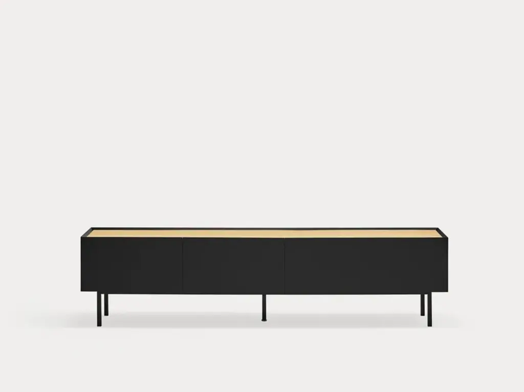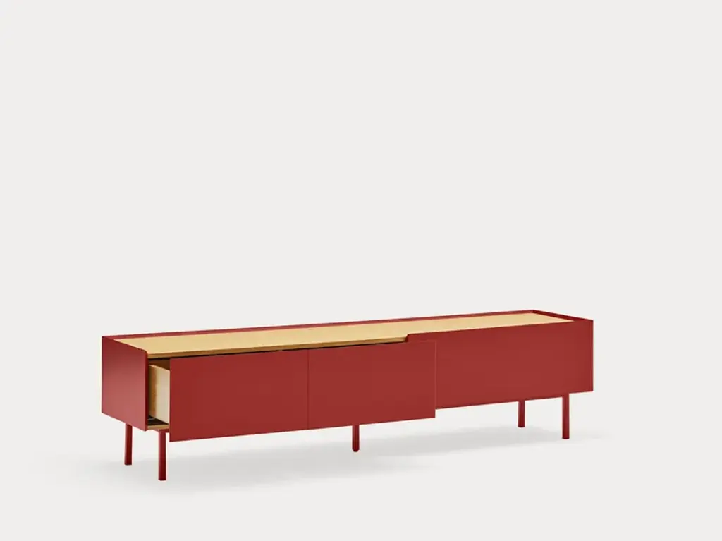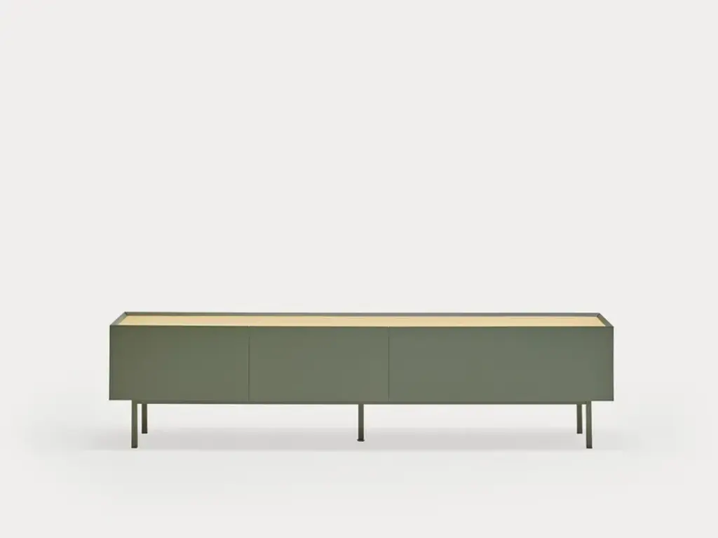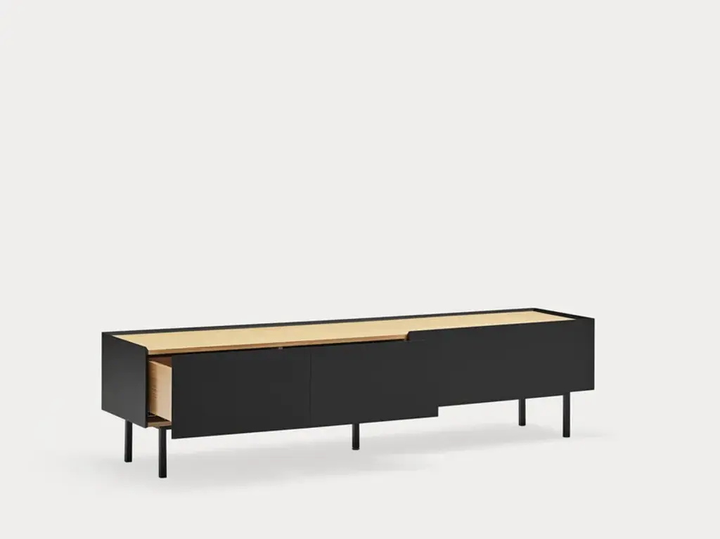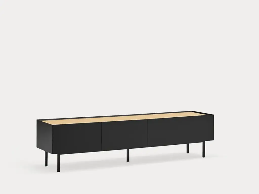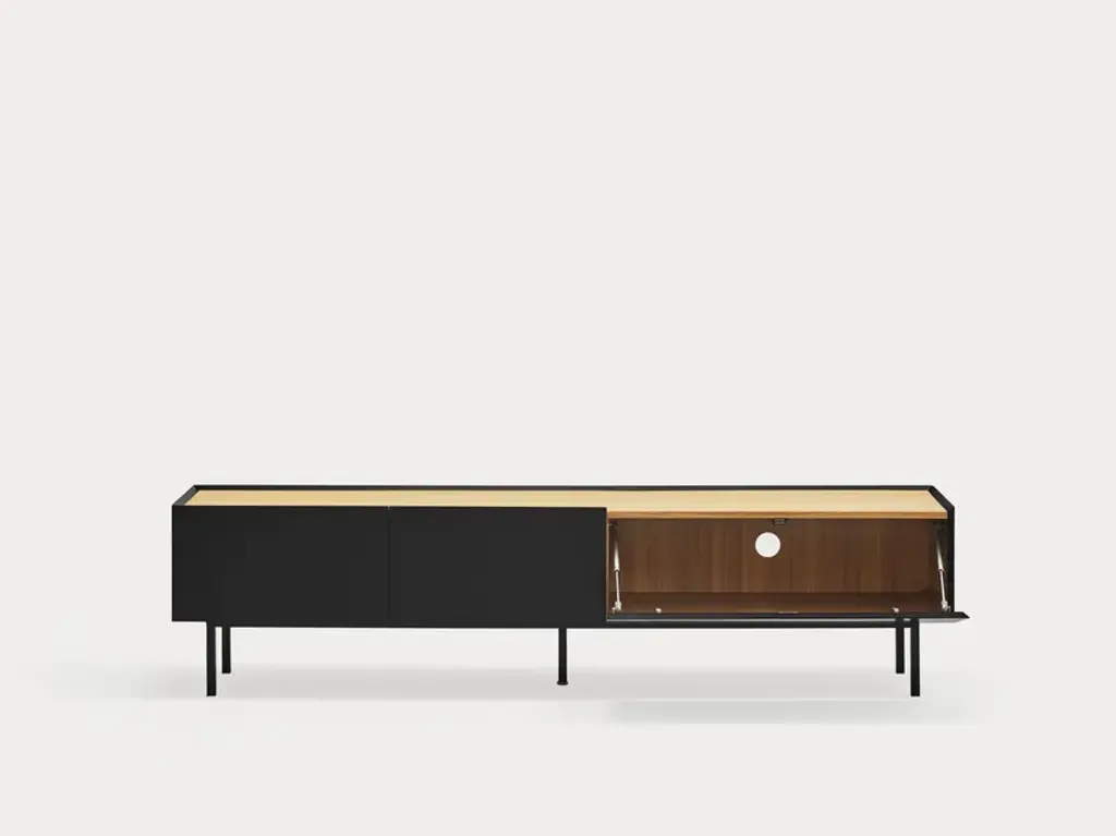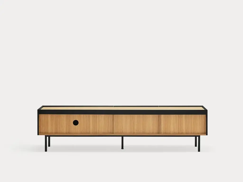 Valley is a MDF veneered in oak or walnut tv cabinet and it has several finishes for the metal coating of the top. It has three doors with push opening, shelf inside to organize all electronic devices and two drawers that complement the storage options.The name of this collection is defined by its great characteristics, making it special by itself. Creating the form Arista as a handle enable to transmit the essence of the collection as a particular element of the furniture.