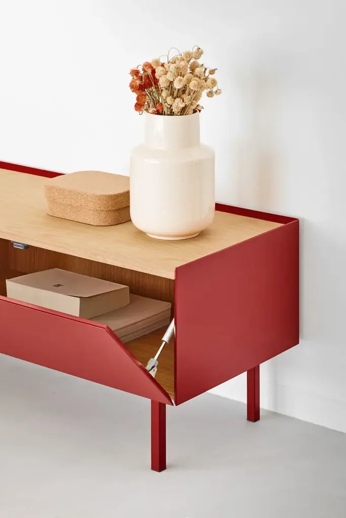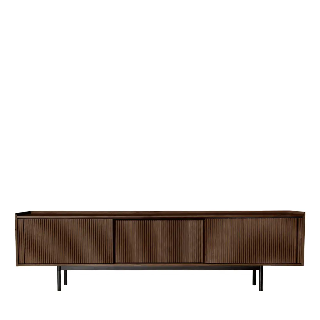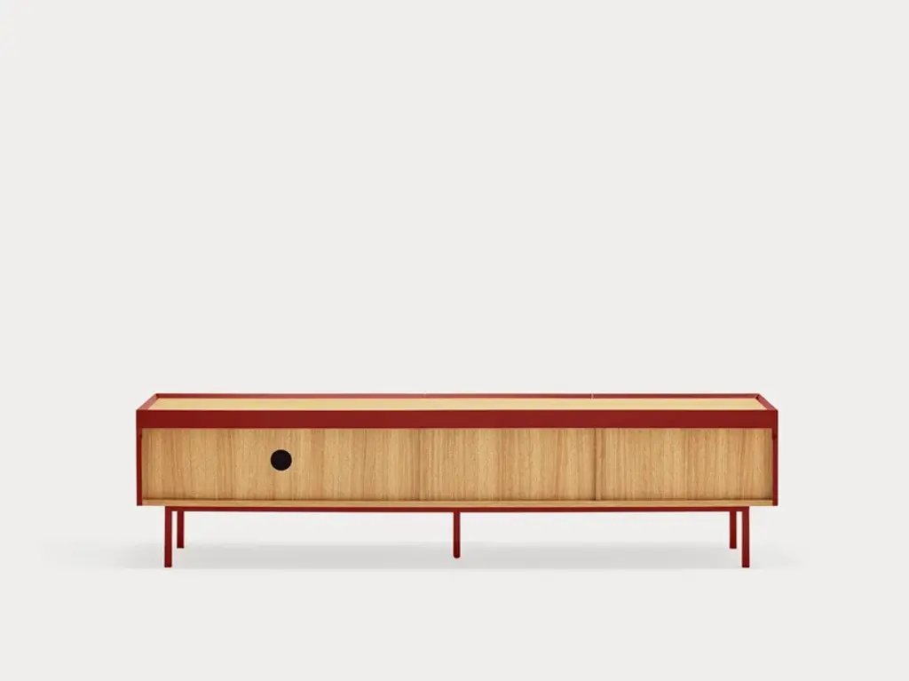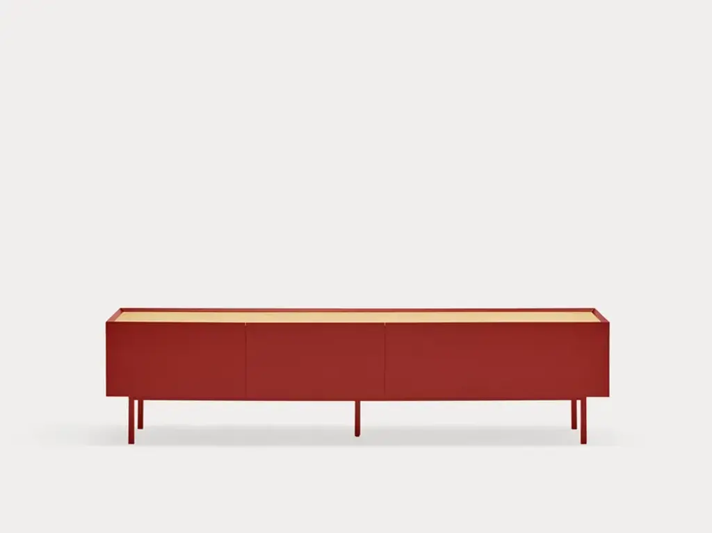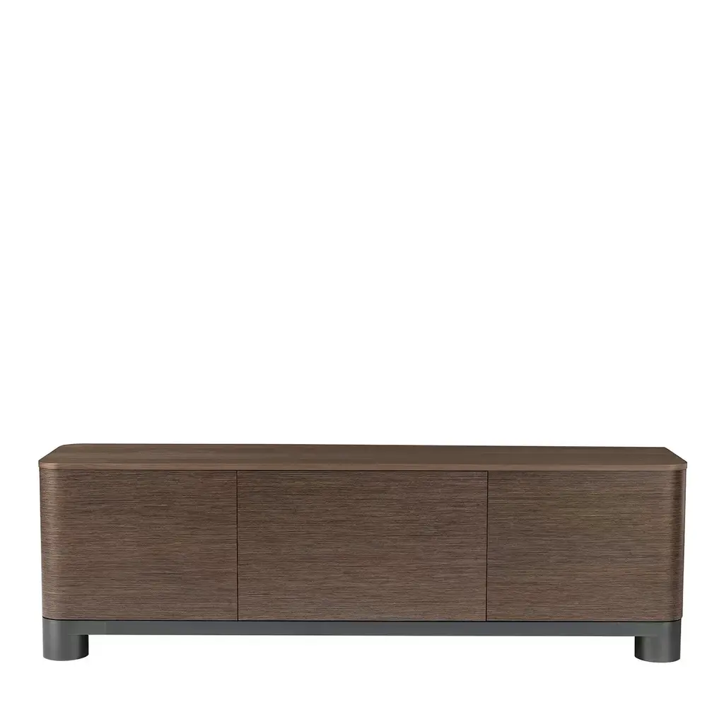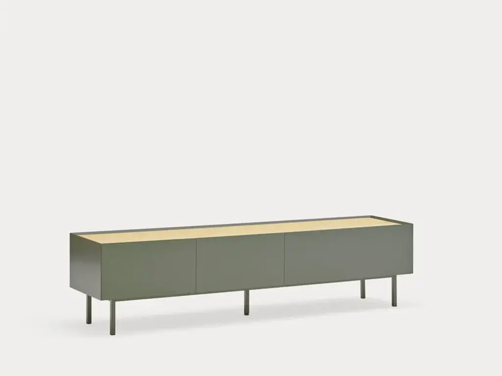 Valley is a MDF veneered in oak or walnut tv cabinet and it has several finishes for the metal coating of the top. It has three doors with push opening, shelf inside to organize all electronic devices and two drawers that complement the storage options.The name of this collection is defined by its great characteristics, making it special by itself. Creating the form Arista as a handle enable to transmit the essence of the collection as a particular element of the furniture.