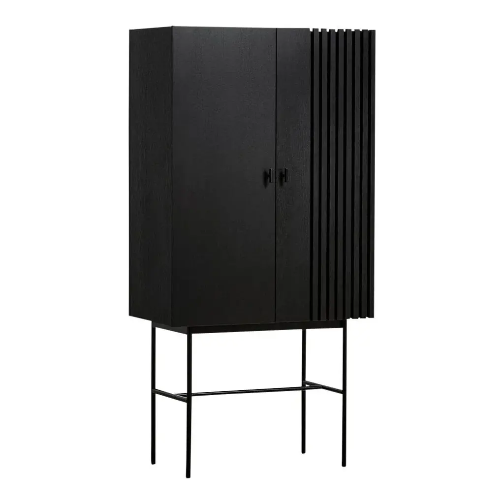 The series of sideboards is inspired by the wooden slate cladding found in modern architecture. With its geometric shape and horizontal slates, Array creates a strong visual effect from catching both light and shadow in the depth of the slates. The illusion of transparency is intended to create a feeling of growing curiosity as you get a glimpse of what is hidden behind the closed doors. The sleek legs lift the sideboards from the ground creating an elegant contrast between the solid wooden cabinet on top and the thin metal construction underneath.