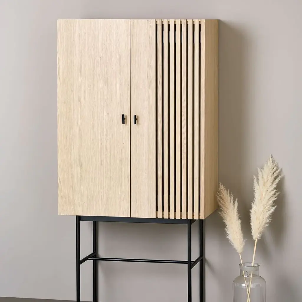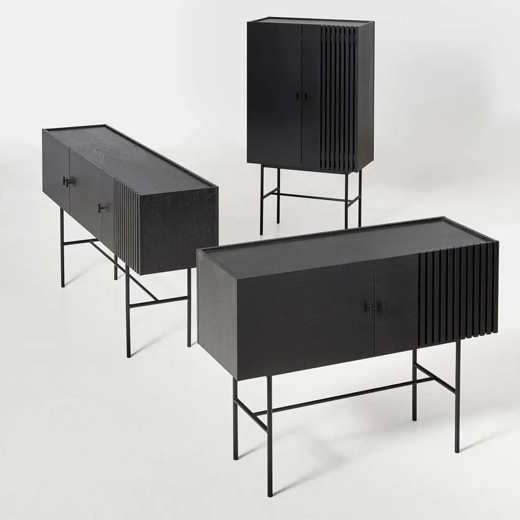 The series of sideboards is inspired by the wooden slate cladding found in modern architecture. With its geometric shape and horizontal slates, Array creates a strong visual effect from catching both light and shadow in the depth of the slates. The illusion of transparency is intended to create a feeling of growing curiosity as you get a glimpse of what is hidden behind the closed doors. The sleek legs lift the sideboards from the ground creating an elegant contrast between the solid wooden cabinet on top and the thin metal construction underneath.