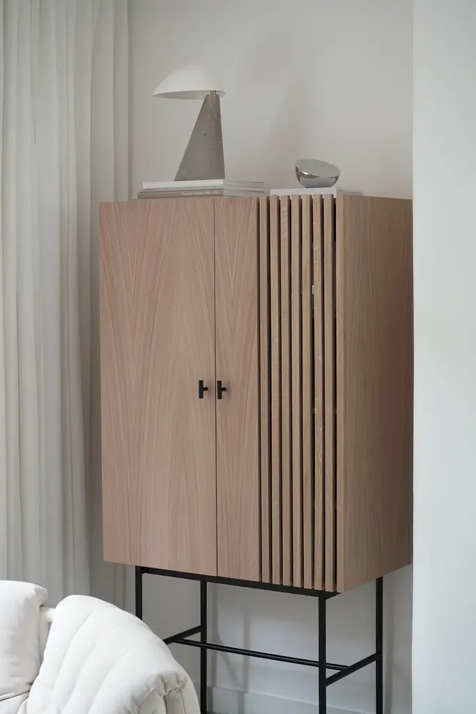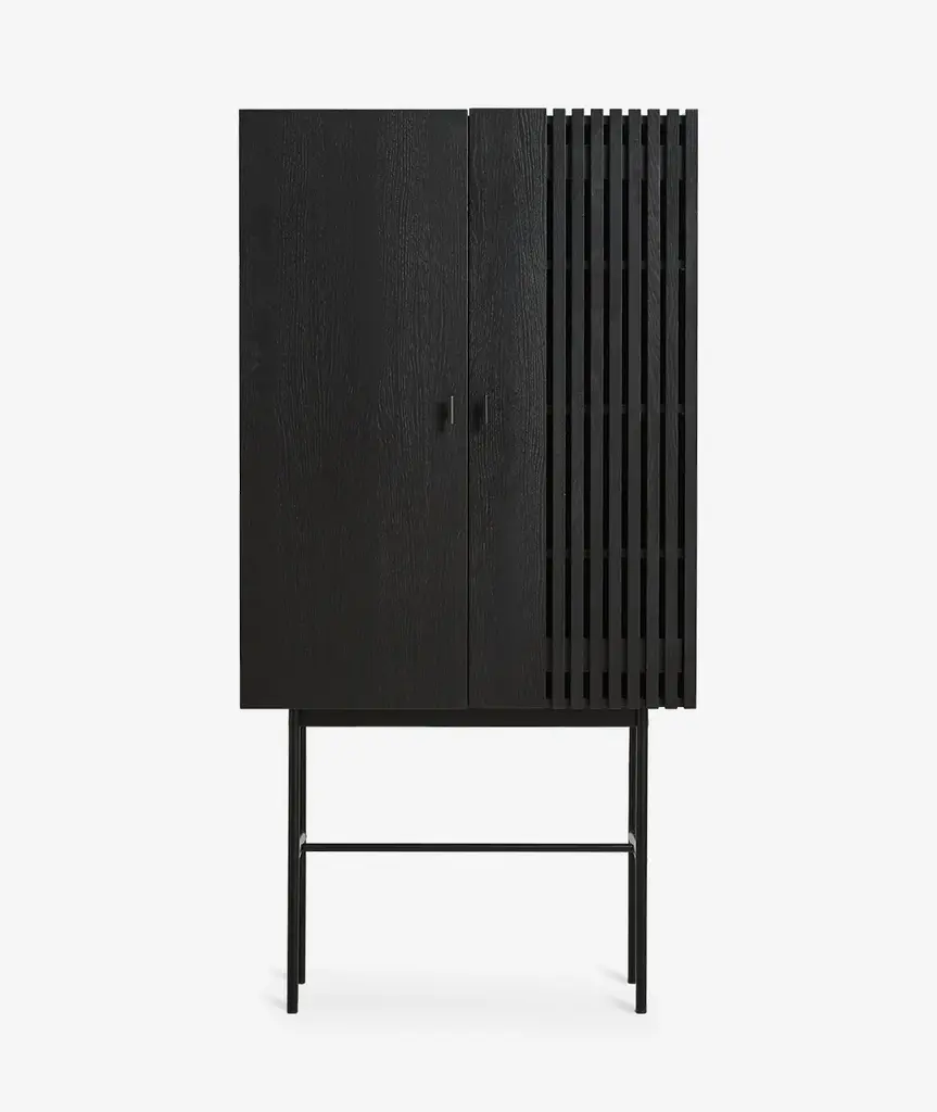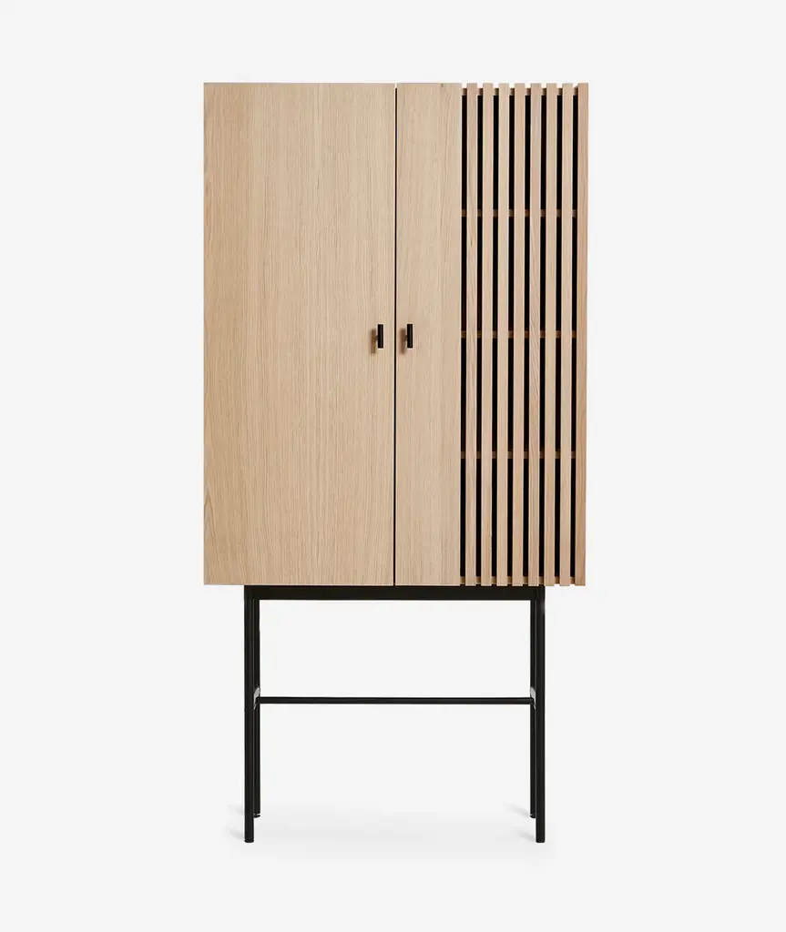 The Array series is inspired by the wooden slate cladding found in modern architecture. With its geometric shape and horizontal slats, it creates a strong visual effect from catching both light and shadow in the depth of the slats. The sleek legs lift the sideboards from the ground creating an elegant contrast between the solid wooden cabinet on top and the thin metal construction underneath. Soft closing doors make the cabinet both functional and delicate.