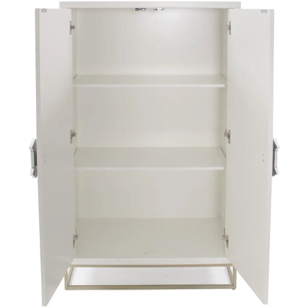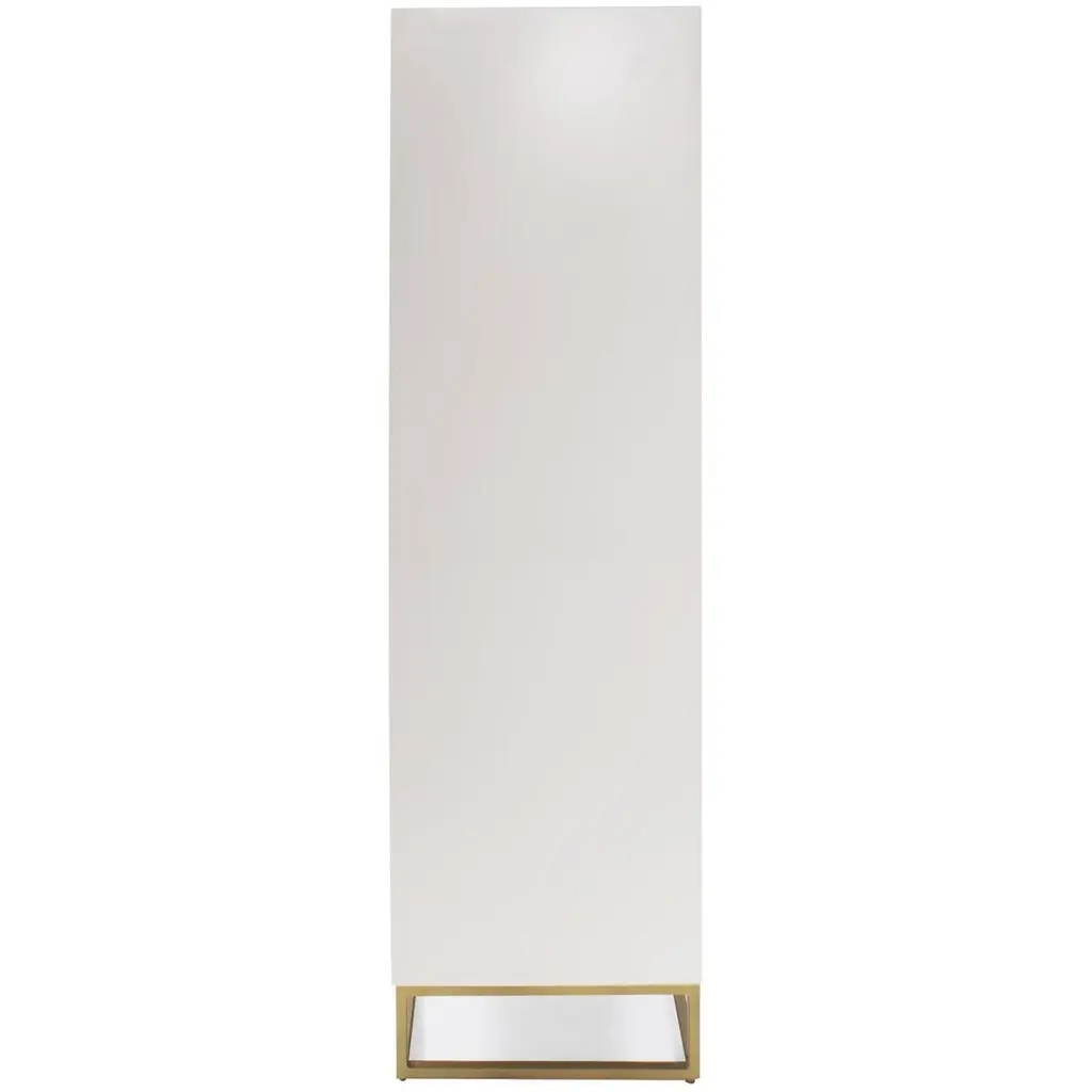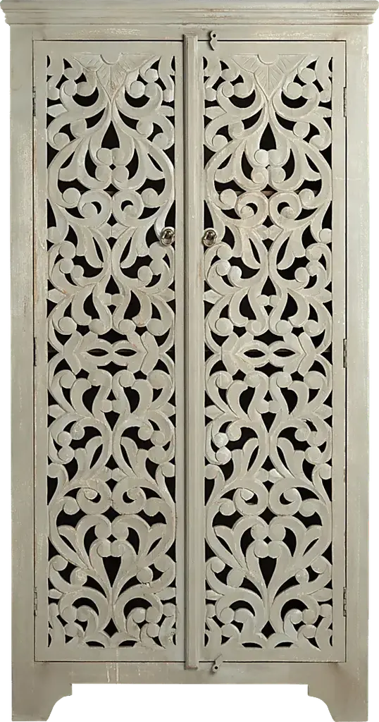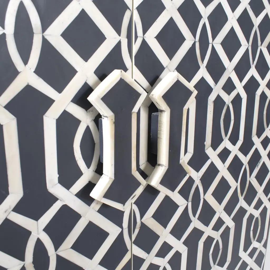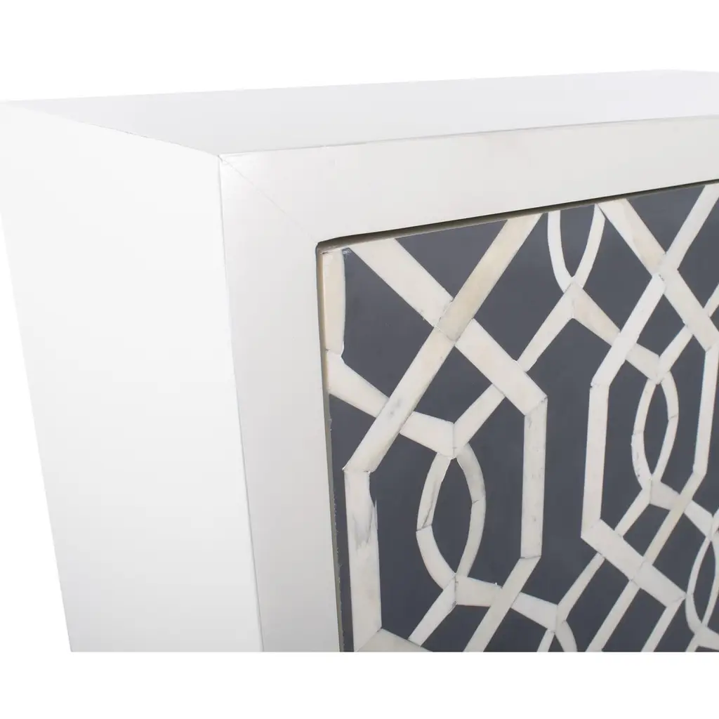 This striking cabinet showcases a soothing ivory exterior that exudes understated sophistication, resting atop a sturdy gold iron stand that adds a touch of opulence. The front of the cabinet features a delicate lattice pattern in elegant grey and ivory hues, creating a sense of balance and harmony. With two spacious shelves and ample storage space, this cabinet is as practical as it is visually captivating, offering a perfect solution for organizing and displaying your treasured items. Whether gracing your living room, dining area, or bedroom, this piece is a testament to the enduring beauty of thoughtful design, inviting you to elevate your decor with a touch of timeless luxury and versatility.