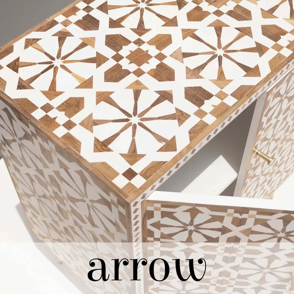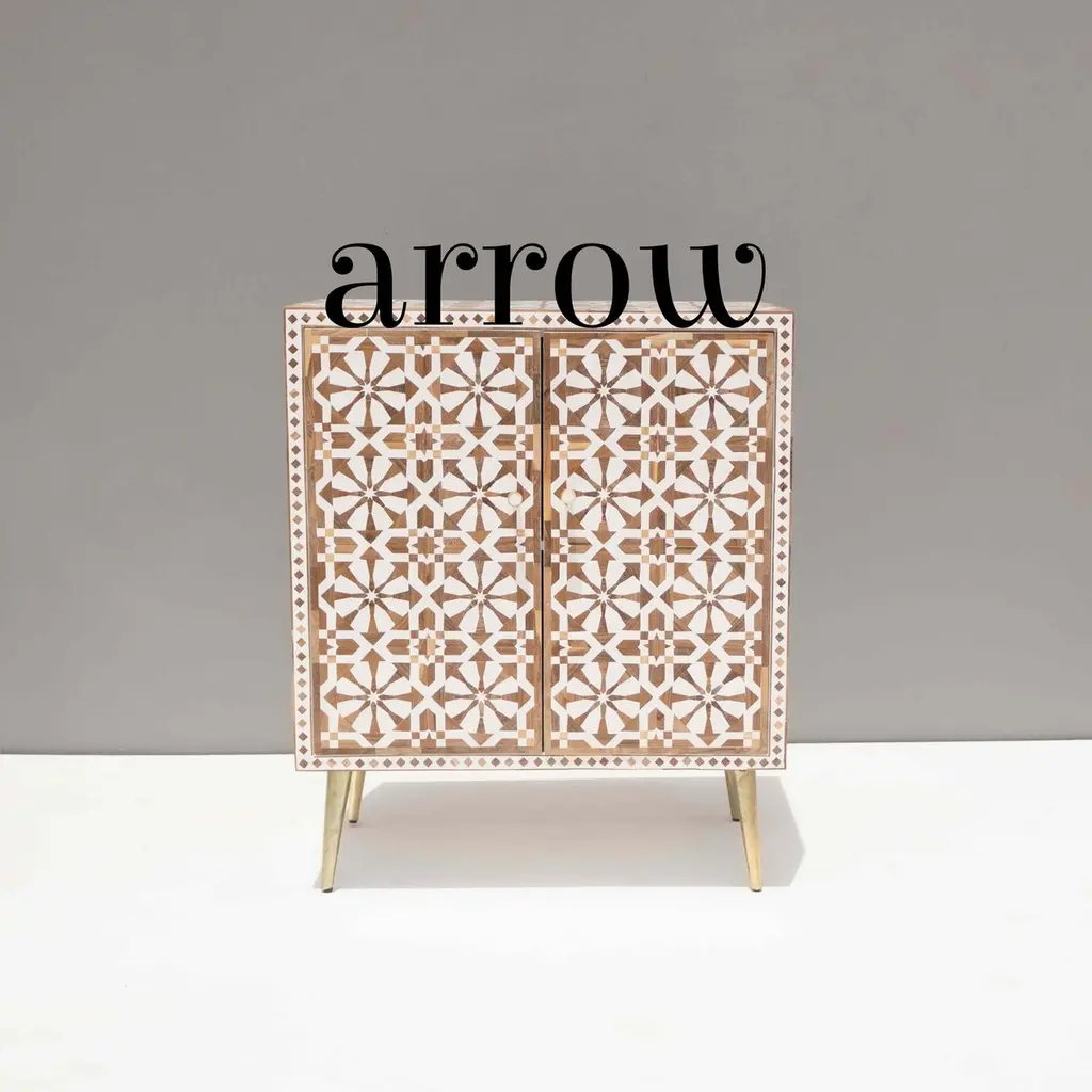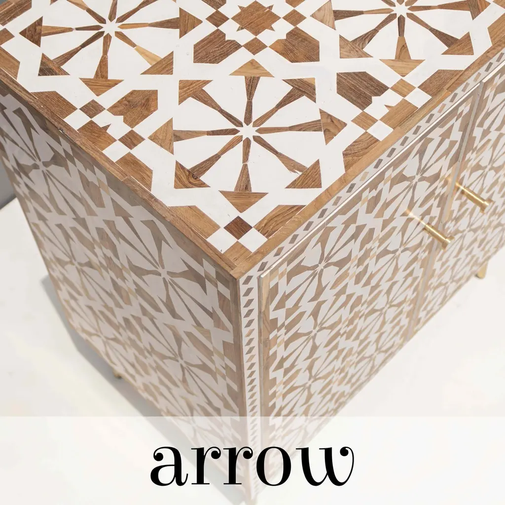 This stunning cabinet is handmade, featuring intricate teak wood inlay arrow patterns look spectacular. The cabinet is not only visually stunning but also highly functional offering ample storage space for your essentials. Crafted to last for generations, this dresser is an heirloom piece that will be cherished for years to come. Add a touch of luxury to your home with our Teak Wood Inlay Cabinet! If you wish to customize the color of the dresser, inlay pattern, the paint color please feel free to reach out to us. We would be happy to make a custom piece just for you.Details: 1. Materials used: Solid Wood and Teak Wood.2. Wipe with a damp cloth. Avoid chemical-based cleaning solutions.3. Avoid exposure to direct sunlight.4. Made in India.5. It will require minimal assembly of knobs and legs. Assembly kit provided with the shipment.6. As the piece is handmade please expect slight colour variations.7. The texture and finish of the furniture are natural.8. Brass Knobs.9. Manufacturing time: 2-3 weeks. Shipping time: 1-2 weeks.10. Ships from India.