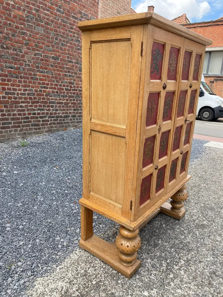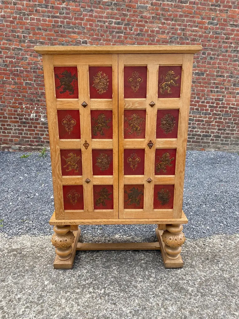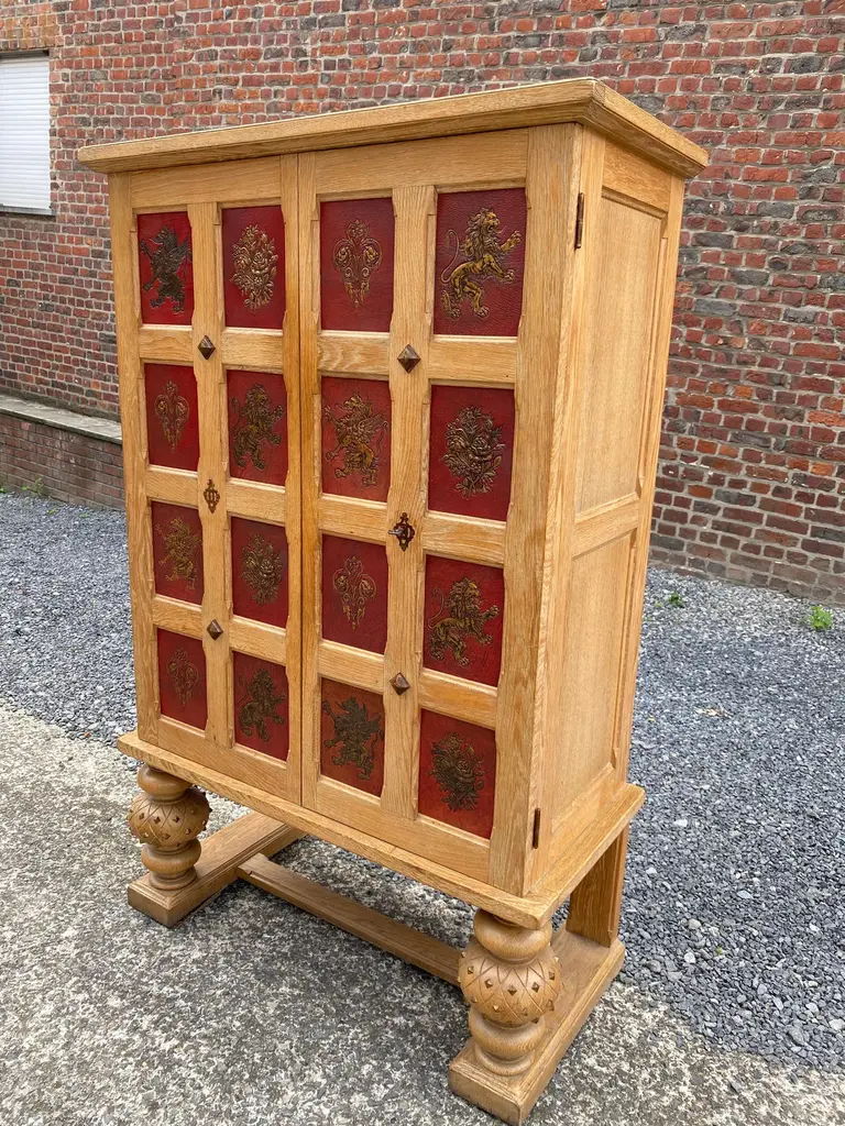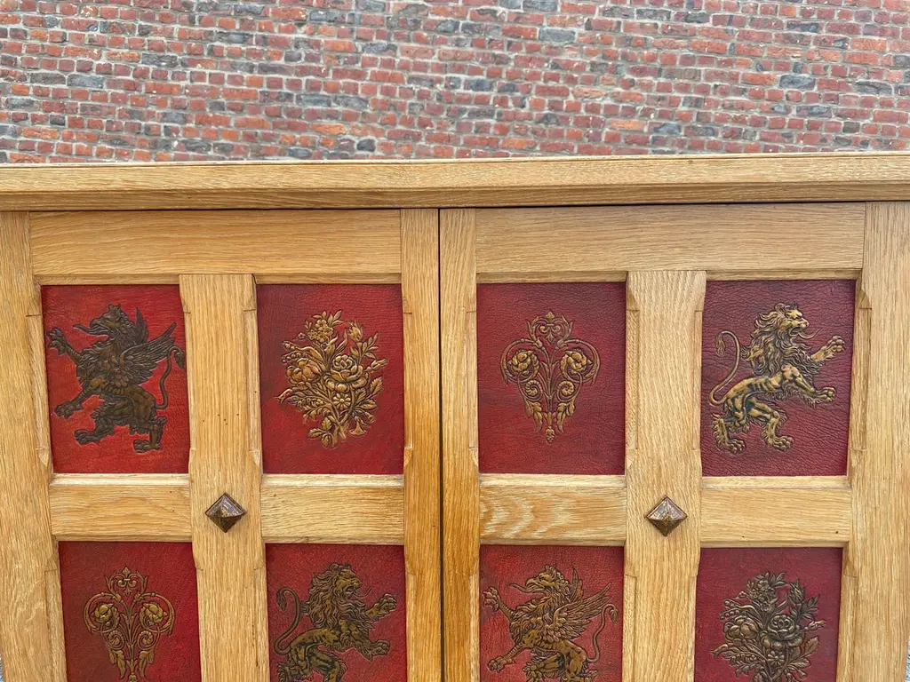 Art Deco cabinet in oak and embossed and gilded leather, circa 1940-1950.
