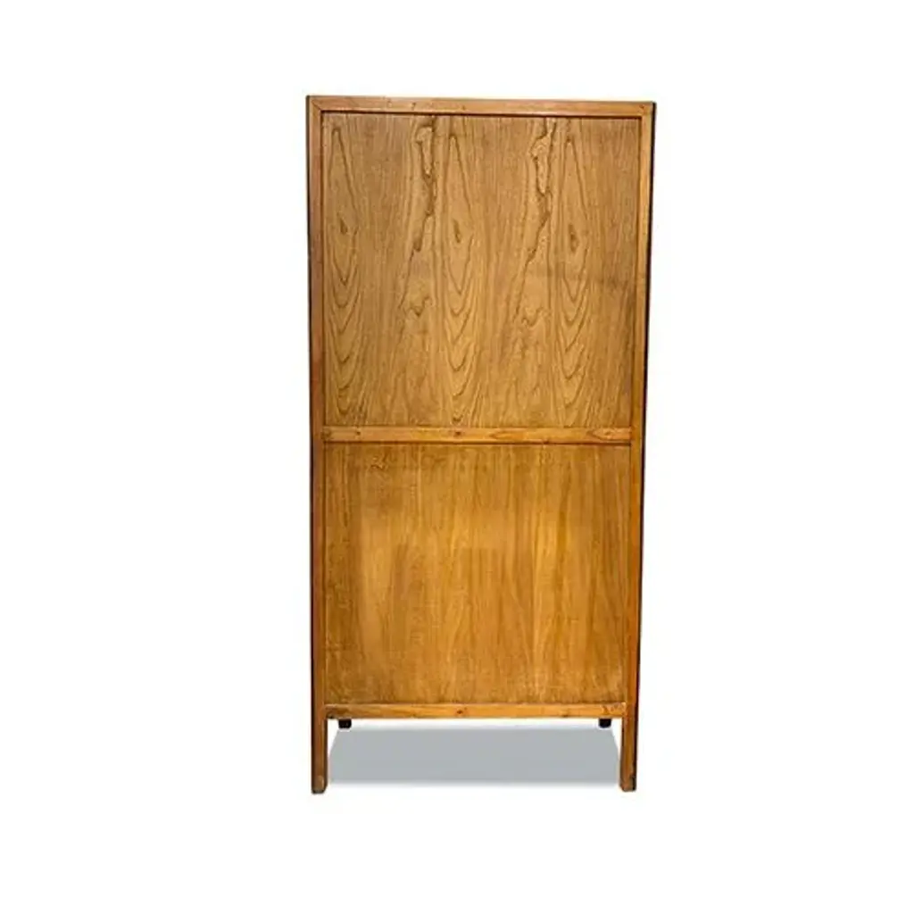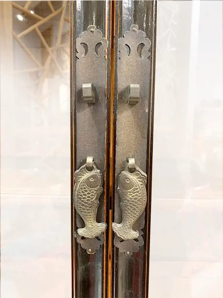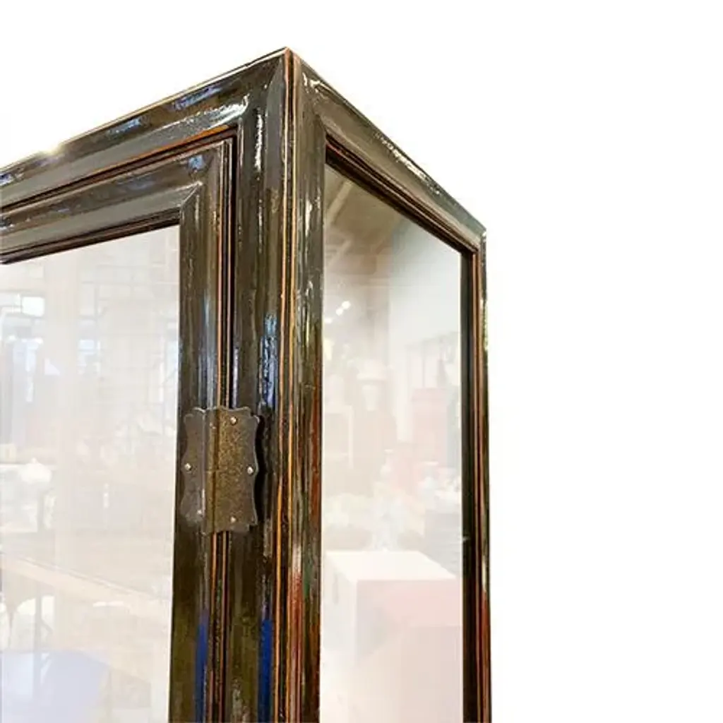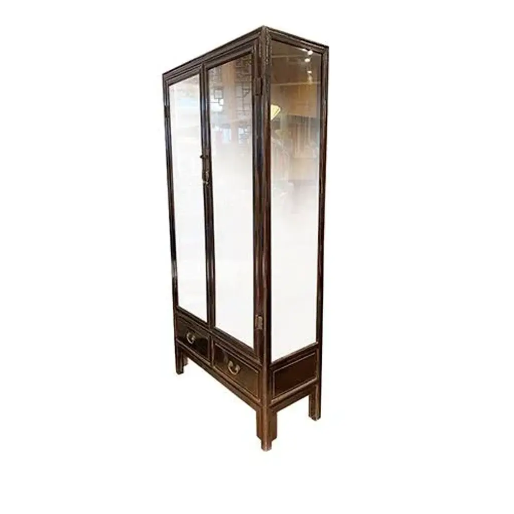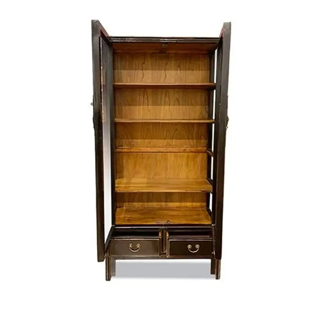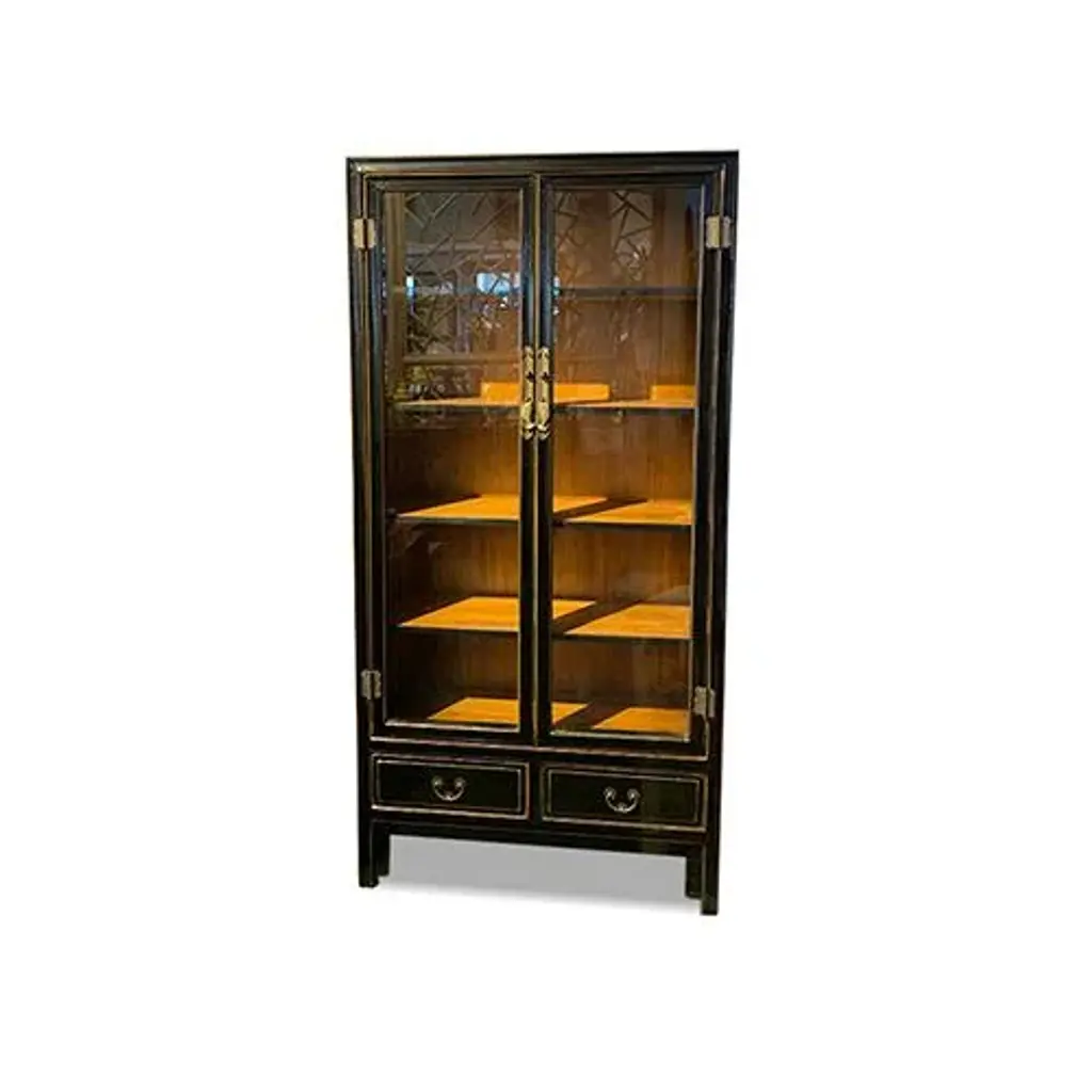 Asian Black Lacquer Display Cabinet is made out of Elm wood. It has 2 drawers and 2 glass doors with 3 removable shelves. The side of the cabinet is also glass. It is all handmade with orange edging around the cabinet frame and door. It has a lots of storages. Dimensions: 35"W x 15"D x 74.5"H