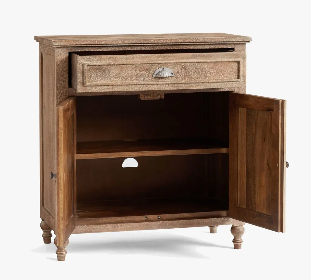 Perfect for an small space entryway, this petite cabinet fits global style into a compact footprint. Molding details, turned feet and a fluted drawer pull add a romantic touch. A light finish highlights the natural beauty of the mango wood’s grain and hue, which vary slightly from piece to piece. Wire cutouts make it the perfect spot for a quick charge or a digital assistant speaker.