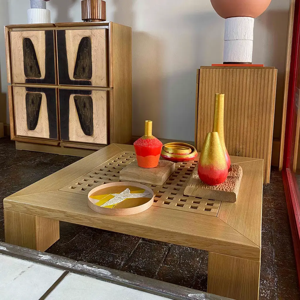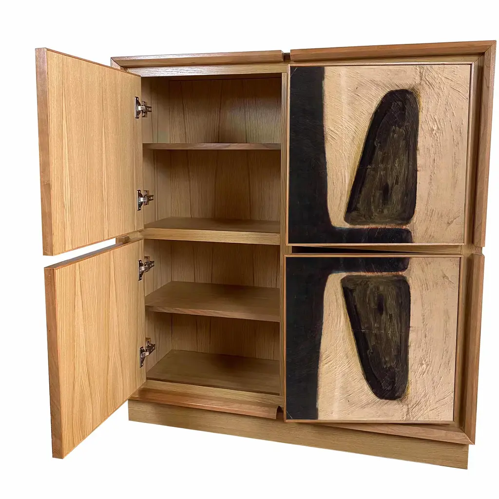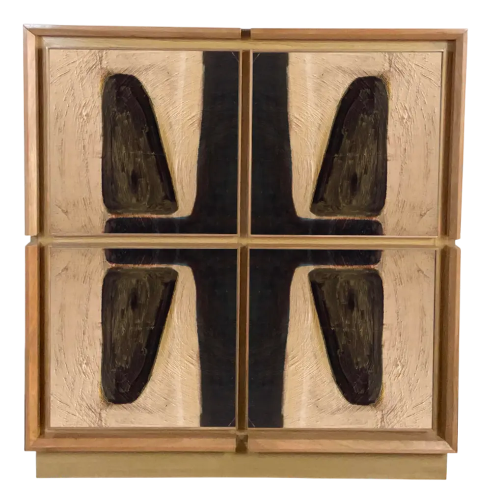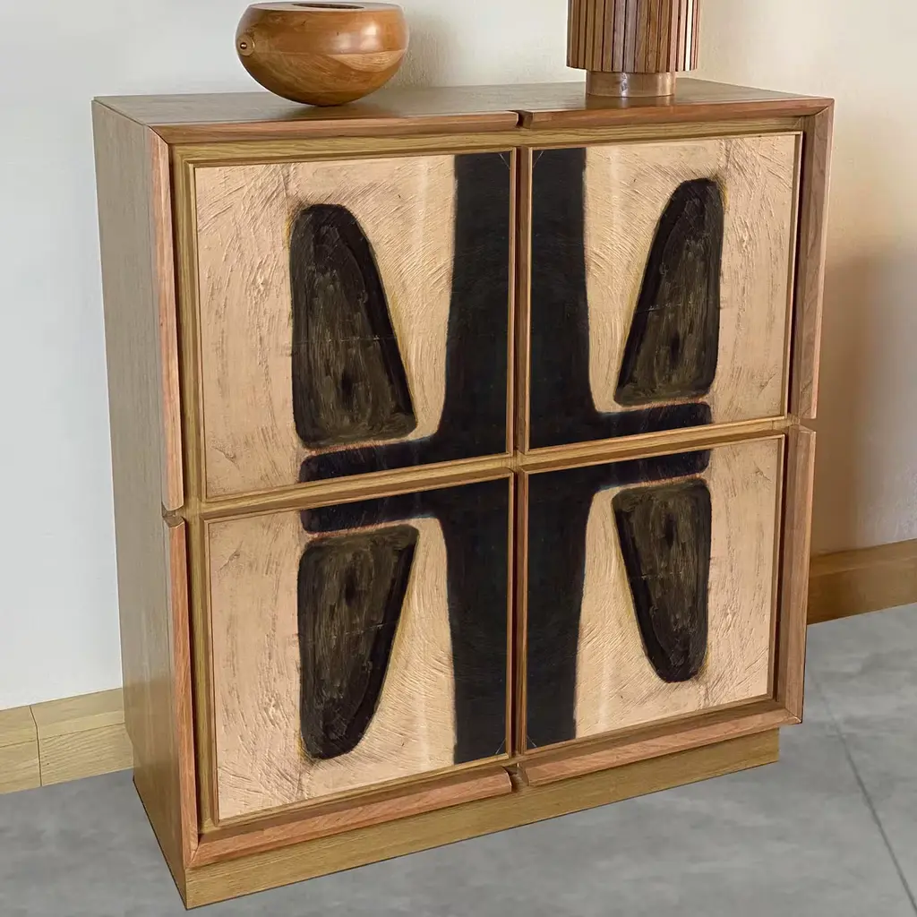 Showcasing a splendid abstract design inspired by Ferdinando Meccani's oil paintings from the '60s and '70s, this cabinet is a one-of-a-kind design from a limited edition series of 10 pieces created by Mascia Meccani in 2022. Handcrafted of durmast finished in cherry and walnut, it is painted by hand with deft expertise. Customizable in size and wood essence upon request, please consult the Concierge for further details.