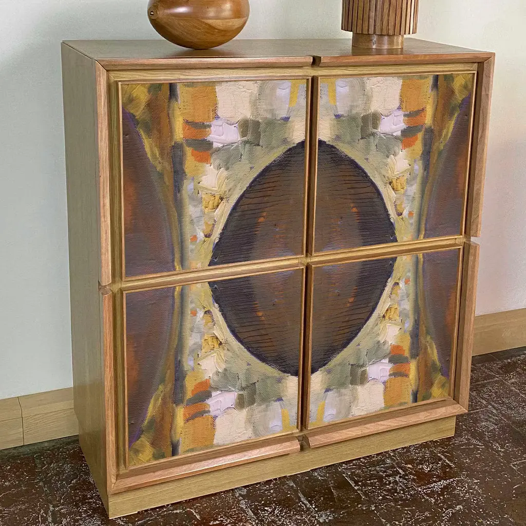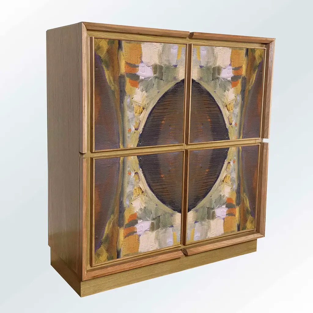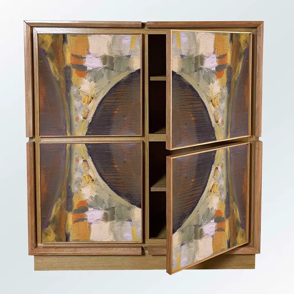 A stupendous embodiment of the meeting point between art and artisanship, this gorgeous cabinet belongs to a limited edition of 10 numbered pieces created by Mascia Meccani in 2022. Fashioned of durmast finished in cherry and walnut essences, it is painted by hand drawing inspiration from Ferdinando Meccani's oil paintings from the '60s and '70s. It is customizable in wood essence and size, please inquire with the Concierge for details.