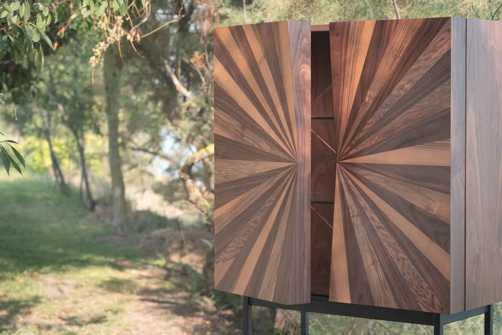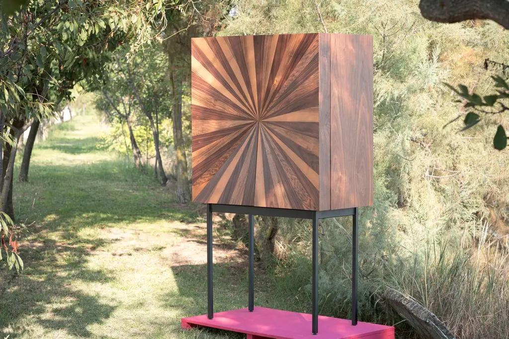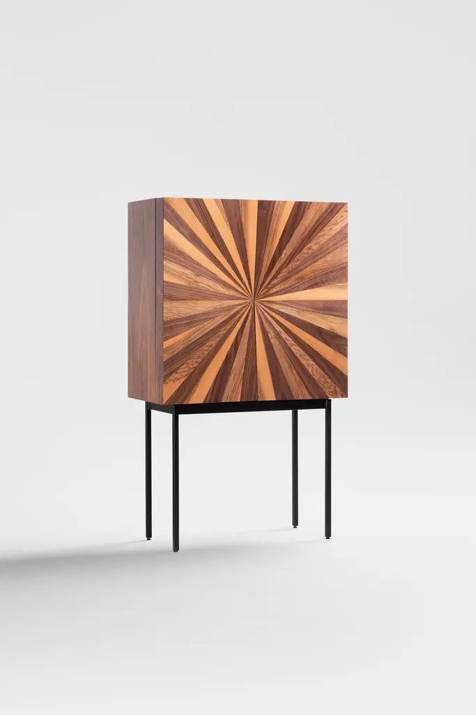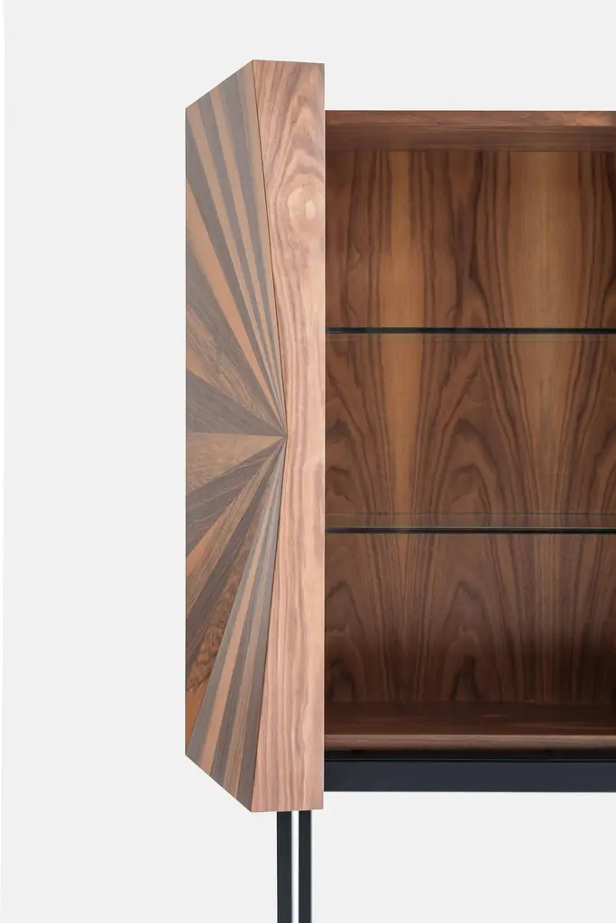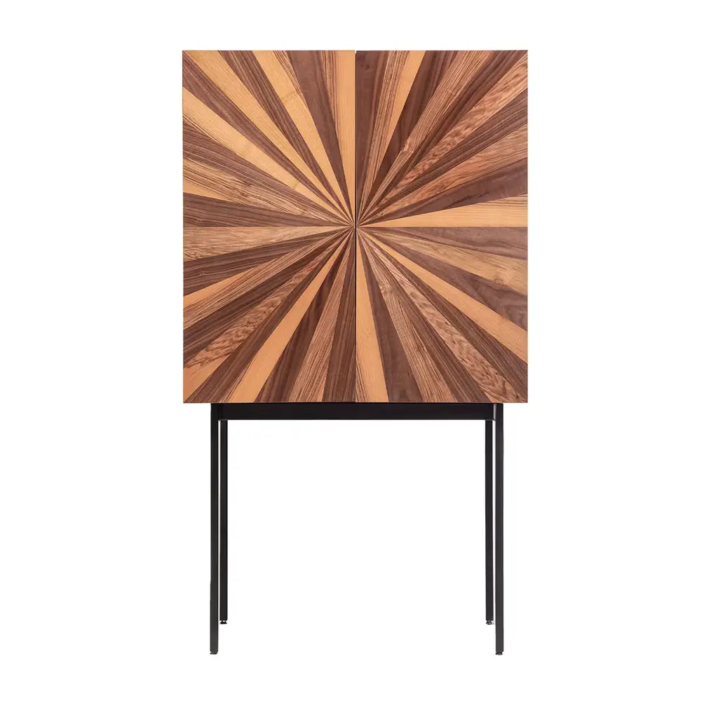 Can you tame a star? The textural nature of wood lights up through a kaleidoscope of different species arranged in a sunburst: the optical effects represented by the stone inlay work present in the churches and palazzi of Venice. A hybrid piece of furniture which aims to both fill the role of container, while also functioning as a sculptural element, the custodian of dreams and desires. Functional and decorative at the same time, Astro – designed by Venetian design studio DEBONADEMEO – bears testament to the very high manufacturing and cabinetry skill of MEDULUM, applied in this case to the creation of a trunk for contemporary furnishing. The slender metal structure, designed as a pedestal of museum memory, supports a streamlined volume which exalts the natural look of the wood it is composed of. The geometric rhythm of the sunburst wedges hides the perimeter of the door, which allows the item to open up, revealing an internal storage compartment organised with metal shelves. The shape of the door itself, which is splayed towards the centre, lends a dynamic effect to the composition, almost anamorphic depending on where it is viewed from.In this collection, the design duo Luca De Bona and Dario De Meo continue their topic of research into optical effects created using inlay work, investigated in a series of furniture pieces previously developed for the Venetian brand.DIMENSIONI / DIMENSIONS: W100 x H172 x D50 cmMATERIALI / MATERIALS: Veneered wood, matt black painted metal,steel shelves.FINITURE / FINISHES AVAILABLE: European walnut, Canaletto Walnut, matt black painted metal legsDESIGNERDebonaDemeoPRODUCTION YEAR2022.
