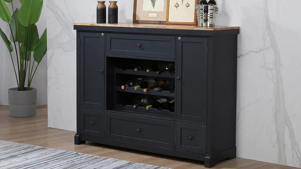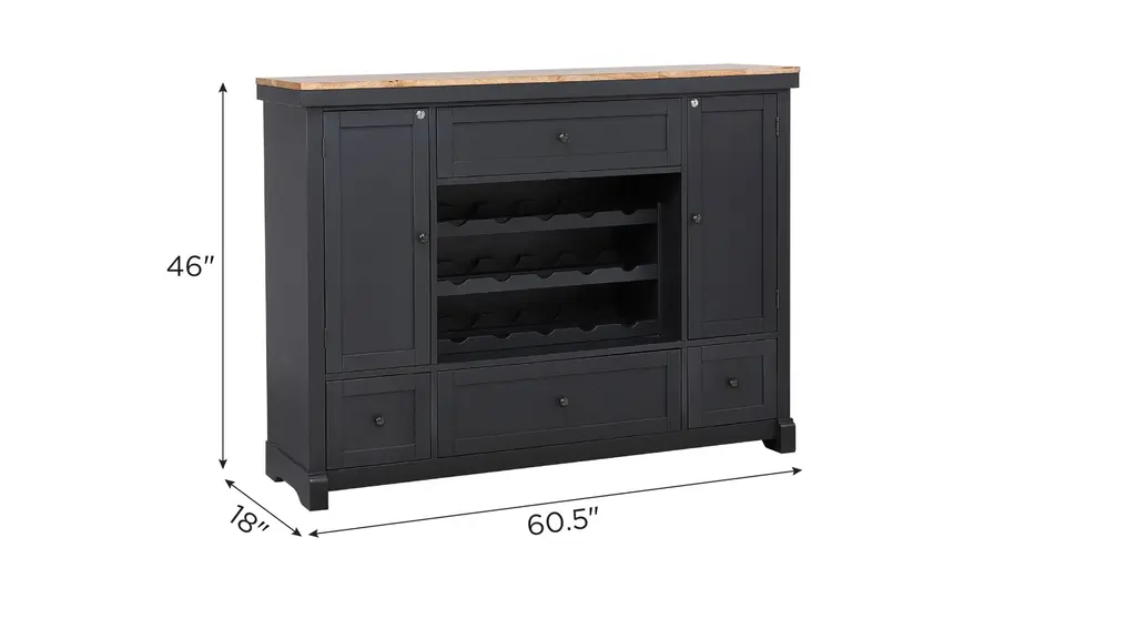 Autumn Winds Spirit Cabinet features wine rack, large full extension stemware drawer, locking doors and adjustable shelves, Natural all wood Spirit Cabinet with black body.