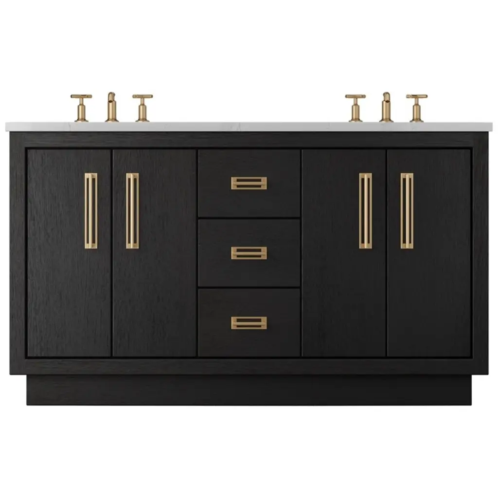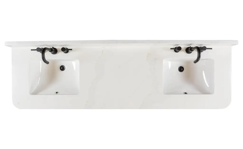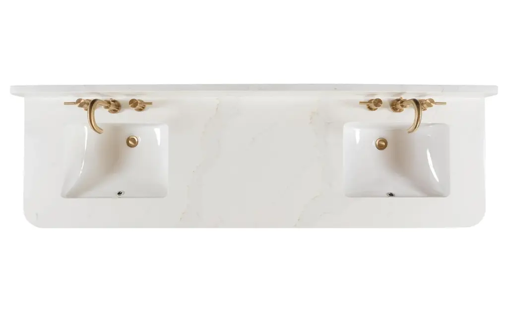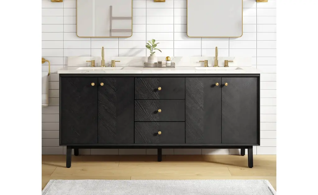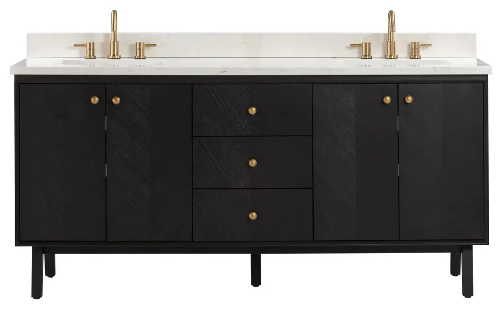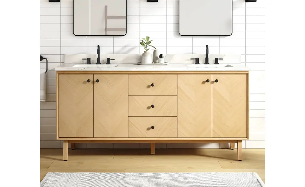 Add allure to your bathroom with the Adele 73" double vanity set by Avanity. The cabinet features a gorgeous finish with subtle chevron patterns gracing the flat-panel doors. The solid wood frame provides durability, and the pre-installed hardware complements the beauty of the real wood grain. The spacious cabinet, three pull out drawers, and two interior drawers provide ample storage for your toiletries and accessories, while the soft-close hinges and glides ensure smooth and quiet operation. An integrated power strip contains dual electrical and USB. The quality Calacatta quartz top and rectangular undermount sinks are easy to maintain and easy on the eyes. Whether you want to create a rustic, farmhouse, or modern look, Adele will dazzle in any bathroom style you choose. Included Components: Covered under Avanity's 1 year limited warranty Solid wood and MDF veneer vanity cabinet with 4 doors and 5 drawers Quartz vanity top with two vitreous china sinks and backsplash Faucet is not included and must be purchased separately Cabinet Features: Constructed from oak wood providing a lifetime of durability Free standing installation - vanity is seated on the floor with wall anchors, providing a functional design 4 door design provides easy access to storage space 5 full extension drawers with soft-close slides allows for organized storage Soft close drawer slides operate on smooth ball-bearings and prevent drawers from slamming shut Vanity cabinet includes matching decorative hardware Vanity will need to be assembled Vanity Top Features: Quartz vanity top includes dual undermount sinks constructed of vitreous china 3 pre-drilled faucet holes per basin Each sink features its own rectangular single basin workspace Rear drain location increases available space under the sink Equipped with an overflow drain to help prevent spillage Vanity top includes matching backsplash Cabinet Specifications: Cabinet Width: 72" (left to right) Cabinet Height: 34-3/16" (top to bottom) Cabinet Depth: 21-1/8" (front to back) Number of Doors: 4 Number of Drawers: 5 Vanity Top Specifications: Vanity Top Width: 73" (left edge to right edge) Vanity Top Depth: 22" (front edge to back edge) Backsplash Height: 4" Number of Basins: 2 Sink Dimensions: 7-11/16"H x 15"W x 20"L Sink Cutout Length: 17-1/8" (left to right) Sink Cutout Width: 12" (front to back) Sink Basin Dimensions: 18-1/8" L x 13" W x 6-5/16" D Number of Faucet Holes: 3 Faucet Centers: 8" (distance between the installation holes for the faucet handles)