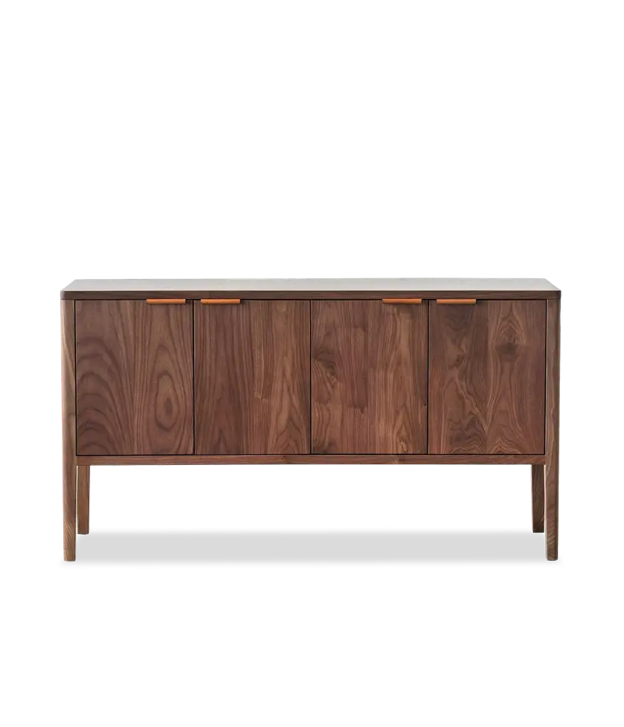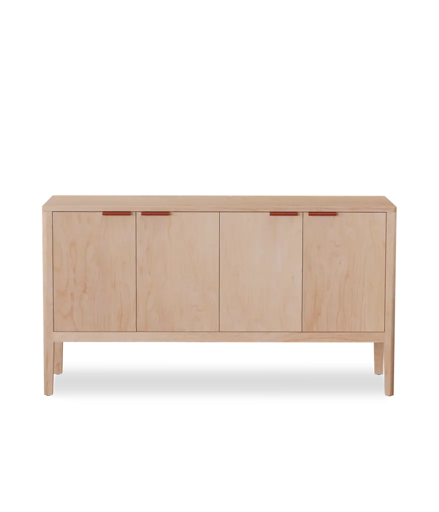 The Avers media cabinet features vertical grain doors. It's petite size lends itself to smaller spaces, but can also double as a credenza in the dining room. Custom leather pulls, designed and made in Chicago. Two adjustable shelves and cord cutouts for your media organization needs. Doors have soft close hinges.
