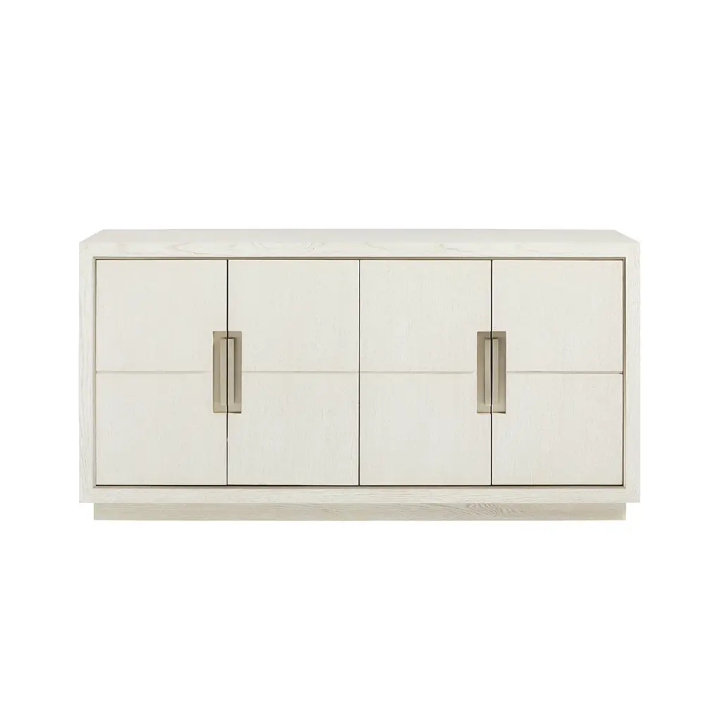 Our Avery Series is constructed in casual white washed oak finish with a subtle hand applied wire brush finish to add additional character and depth to the finish. Inspired by clean-line post-modern forms the Avery series is as at home in a Miami Beach apartment as it is in a Hamptons beach house. The four-door cabinet with its subtle nickel accents is extremely versatile with ample storage for a dining room or can easily work in a foyer or as an entertainment console in a fabulous great room.The Avery collection also includes a three drawer chest and a two door nightstand(sold separately). Ships In 4-5 Weeks Cord management White Washed Oak finish This image is for illustrative purposes only. The colors shown are accurate within the constraints of lighting, photography, and the color accuracy of your screen.