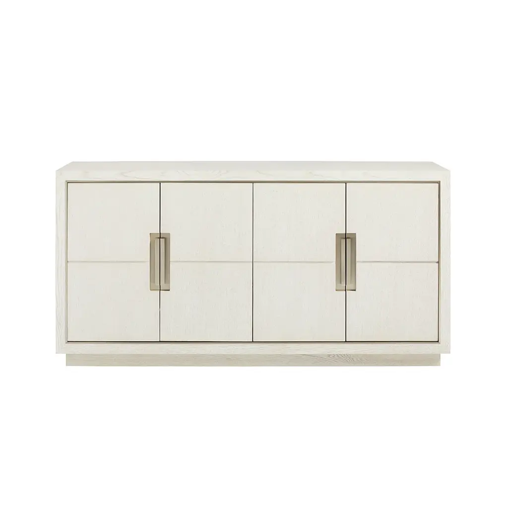 Our Avery Series is constructed in casual white washed oak finish with a subtle hand applied wire brush finish to add additional character and depth to the finish. Inspired by clean-line post-modern forms the Avery series is as at home in a Miami Beach apartment as it is in a Hamptons beach house. The four-door cabinet with its subtle nickel accents is extremely versatile with ample storage for a dining room or can easily work in a foyer or as an entertainment console in a fabulous great room.The Avery collection also includes a three drawer chest and a two door nightstand(sold separately). Ships In 4-5 Weeks Cord management White Washed Oak finish This image is for illustrative purposes only. The colors shown are accurate within the constraints of lighting, photography, and the color accuracy of your screen.