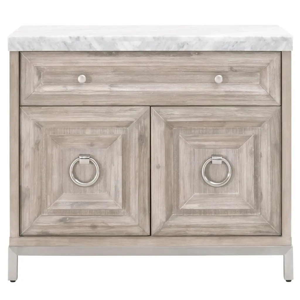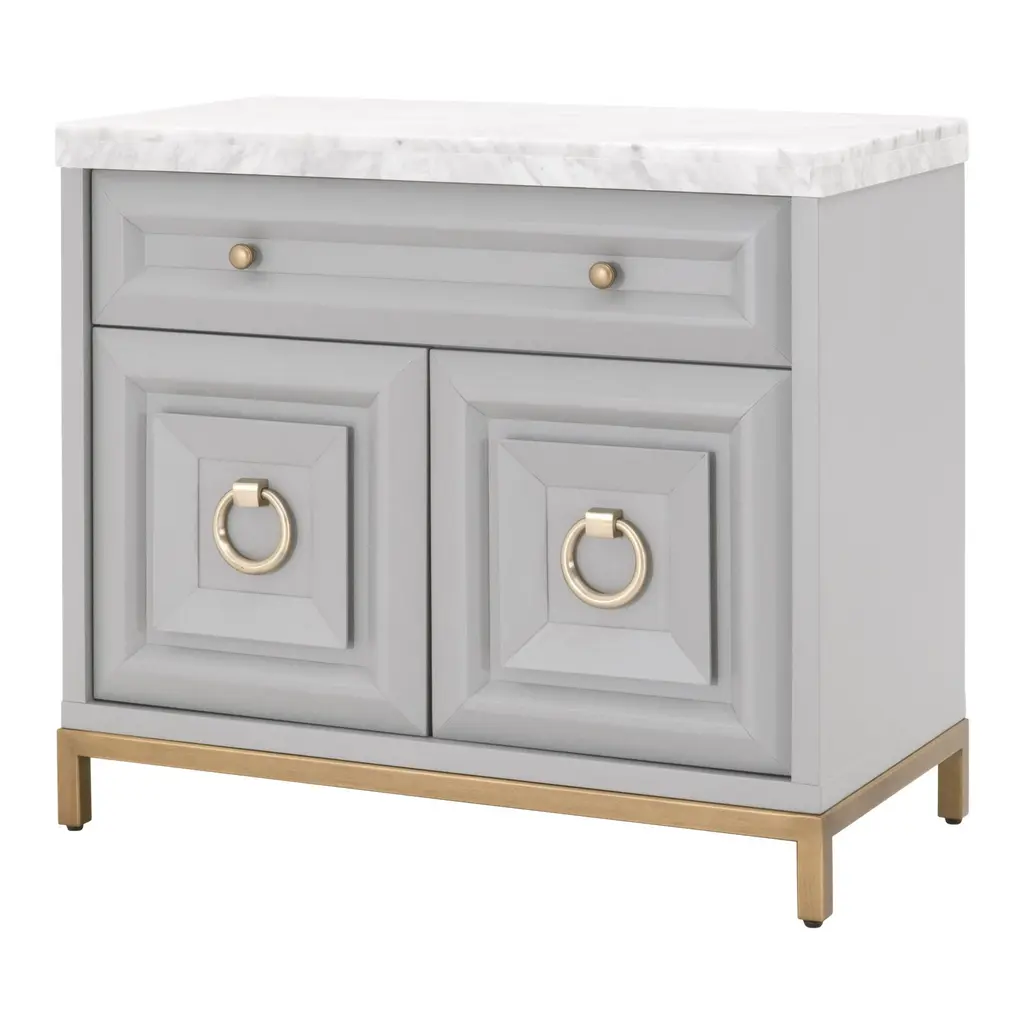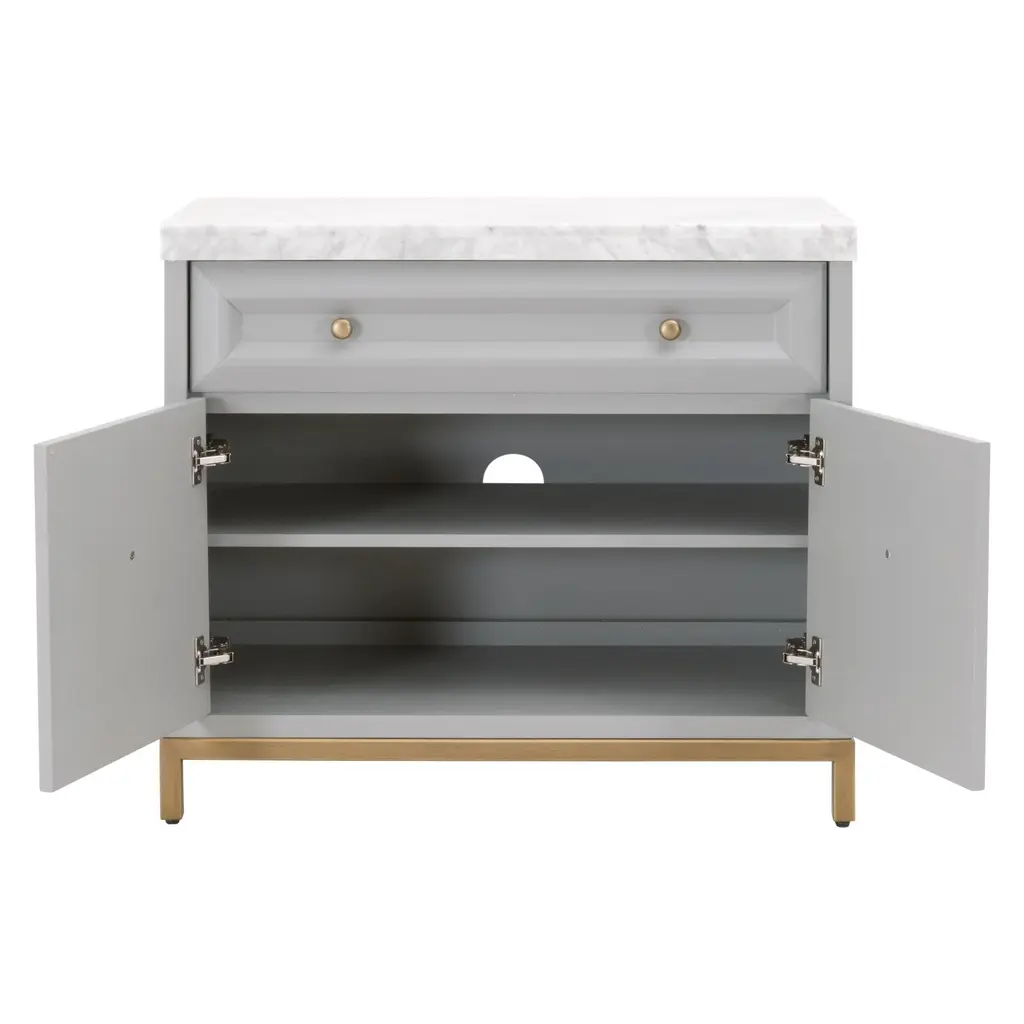 This gorgeous marble-topped media chest can function as a nightstand, media center, or accent cabinet. It is constructed with gray and white Italian marble and dove gray colored wood with brushed gold hardware. The back has a single hole, which is useful for cord management and tucking away unsightly wires. A felt-lined drawer and cabinet with adjustable shelving allow for ample storage space within this transitional-style cabinet. This would make a beautiful addition to any living room, bedroom or foyer.