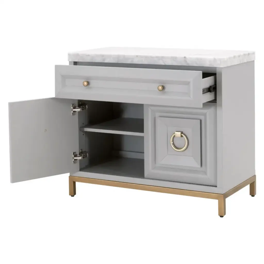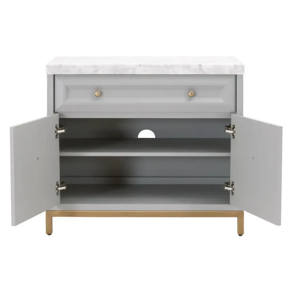 This gorgeous marble-topped media chest can function as a nightstand, media center, or accent cabinet. It is constructed with gray and white Italian marble and dove gray colored wood with brushed gold hardware. The back has a single hole, which is useful for cord management and tucking away unsightly wires. A felt-lined drawer and cabinet with adjustable shelving allow for ample storage space within this transitional-style cabinet. This would make a beautiful addition to any living room, bedroom or foyer.
