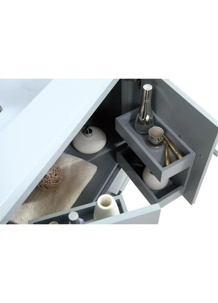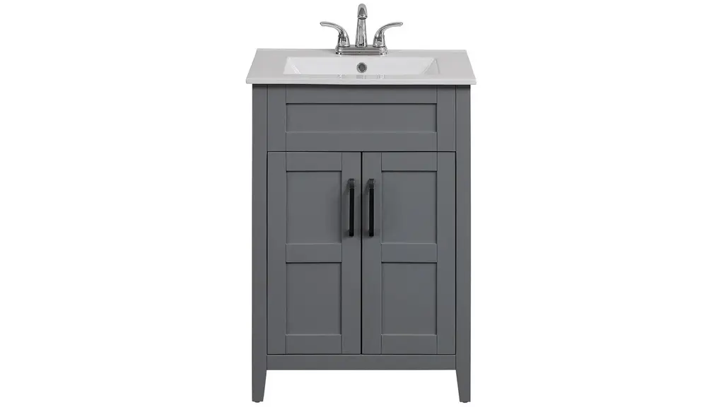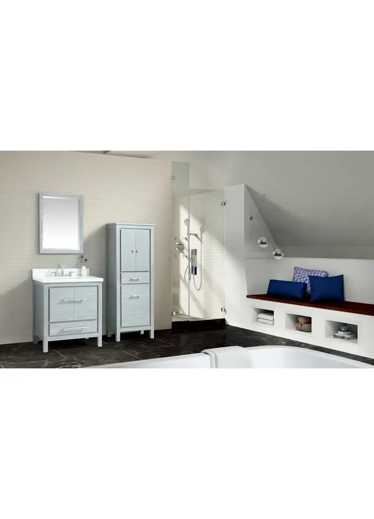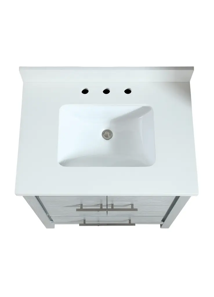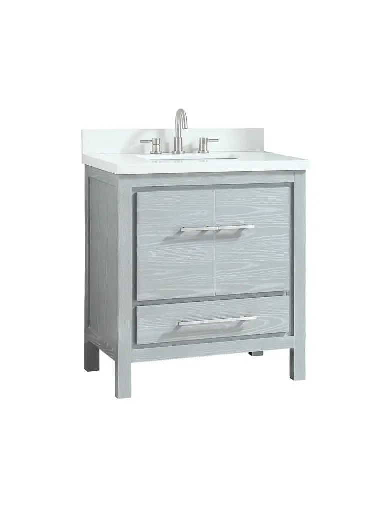 Elegant and functional. Those are the criteria that guided us in creating the Riley collection. With its clean transitional lines, rich sea-salt gray finish, pristine white engineered top, and refined brushed nickel hardware, Riley embodies a contemporary aesthetic that dazzles in multiple design settings. Generous storage features include soft-close doors and drawers with removable organizer trays. Match the Riley vanity ensemble with the complementary mirror and linen tower and you have a pretty and purposeful package. Put Riley in your bathroom and put your mind at ease.31W x 22D x 34.8H inchesSolid ash wood frame, plywood panelsSea salt gray finishBrushed nickel finish hardware2 soft-close doors and 1 soft-close drawer1.5 in. white engineered stone counter top with laminated edge and backsplashTop pre-drilled for 8 in. widespread faucetWhite vitreous china rectangular undermount sinkAdjustable height levelersFaucet not includedFully assembled with countertop and sink affixed to cabinet