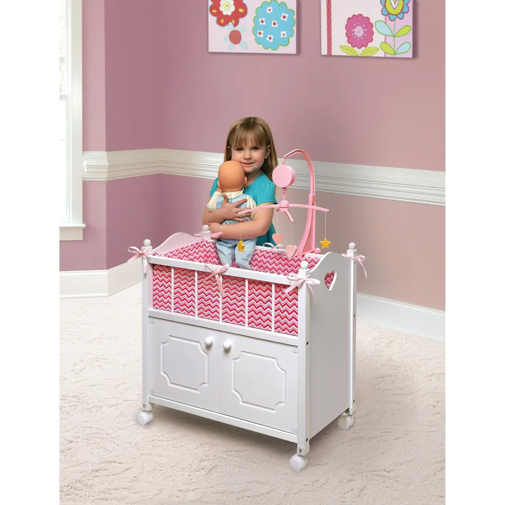 Frilly ribbons, spindles, bed knobs, and heart cutouts compliment the soft, fabric liner, blanket, and pillow. Musical mobile winds up and rotates (tunes vary, no batteries needed). The two cabinet doors with knobs open to reveal ample storage for your doll accessories. Concealed magnets hold the doors closed. Smooth rolling caster wheels.For dolls up to 22-inches. Fits 18-inch dolls such as American Girl, My Life As, Madame Alexander, and Our Generation; and fits 15-inch American Girl Bitty Baby dolls and 14.5-inch American Girl WellieWishers dolls. Made with wood, MDF, 100% Polyester fabric, plastic, and PVC decals with waterproof lamination.Overall assembled dimensions 24 inches L x 12.25 inches W x 24 inches H (40 inches H with the mobile). Interior of crib: 22.5 inches L x 10.25 inches W x 7.25 inches H. All measurements approximate. Spot clean or hand wash the fabric bedding. Wipe clean with a lightly dampened cloth and dry thoroughly. Do not use chemical cleaners on the peel-and-stick decals.Adult assembly required. Illustrated instructions included for assembly of the chair and application of the decals. This toy is for dolls only and is not for use with real infants or pets. /!\ WARNING: CHOKING HAZARD - Small parts. Not for children under 3 yrs. Tested to current safety standards. Doll and doll clothes/accessories not included. Product may vary slightly from shown and described. Props shown are for illustration purposes only and are not included with the product. Actual color/finish may vary slightly from screen display. This item ships in its original carton that may include a product photo.