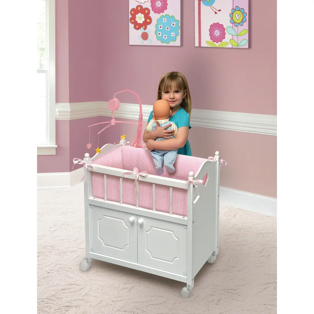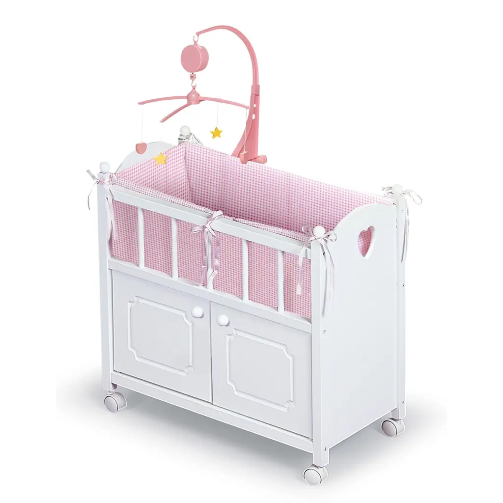 Frilly ribbons, spindles, bed knobs, and heart cutouts compliment the soft, fabric liner, blanket, and pillow. Musical mobile winds up and rotates (tunes vary, no batteries needed). The two cabinet doors with knobs open to reveal ample storage for your doll accessories. Concealed magnets hold the doors closed. Smooth rolling caster wheels.For dolls up to 22-inches. Fits 18-inch dolls such as American Girl, My Life As, Madame Alexander, and Our Generation; and fits 15-inch American Girl Bitty Baby dolls and 14.5-inch American Girl WellieWishers dolls. Made with wood, MDF, 100% Polyester fabric, plastic, and PVC decals with waterproof lamination.Overall assembled dimensions 24 inches L x 12.25 inches W x 24 inches H (40 inches H with the mobile). Interior of crib: 22.5 inches L x 10.25 inches W x 7.25 inches H. All measurements approximate. Spot clean or hand wash the fabric bedding. Wipe clean with a lightly dampened cloth and dry thoroughly. Do not use chemical cleaners on the peel-and-stick decals.Adult assembly required. Illustrated instructions included for assembly of the chair and application of the decals. This toy is for dolls only and is not for use with real infants or pets. /!\ WARNING: CHOKING HAZARD - Small parts. Not for children under 3 yrs. Tested to current safety standards. Doll and doll clothes/accessories not included. Product may vary slightly from shown and described. Props shown are for illustration purposes only and are not included with the product. Actual color/finish may vary slightly from screen display. This item ships in its original carton that may include a product photo.