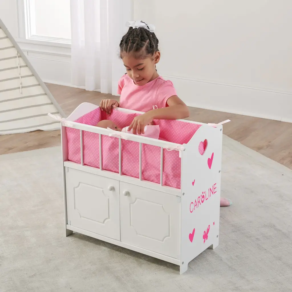 Badger Basket Storage Doll Crib With Bedding And Free Personalization Kit - White - 22" X 12.25" X 22" - White/pink - 22" X 12.25" X 22"