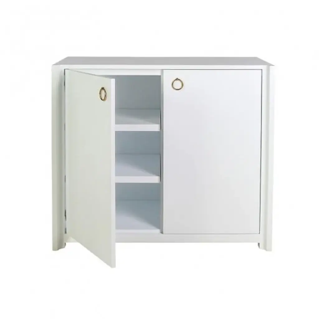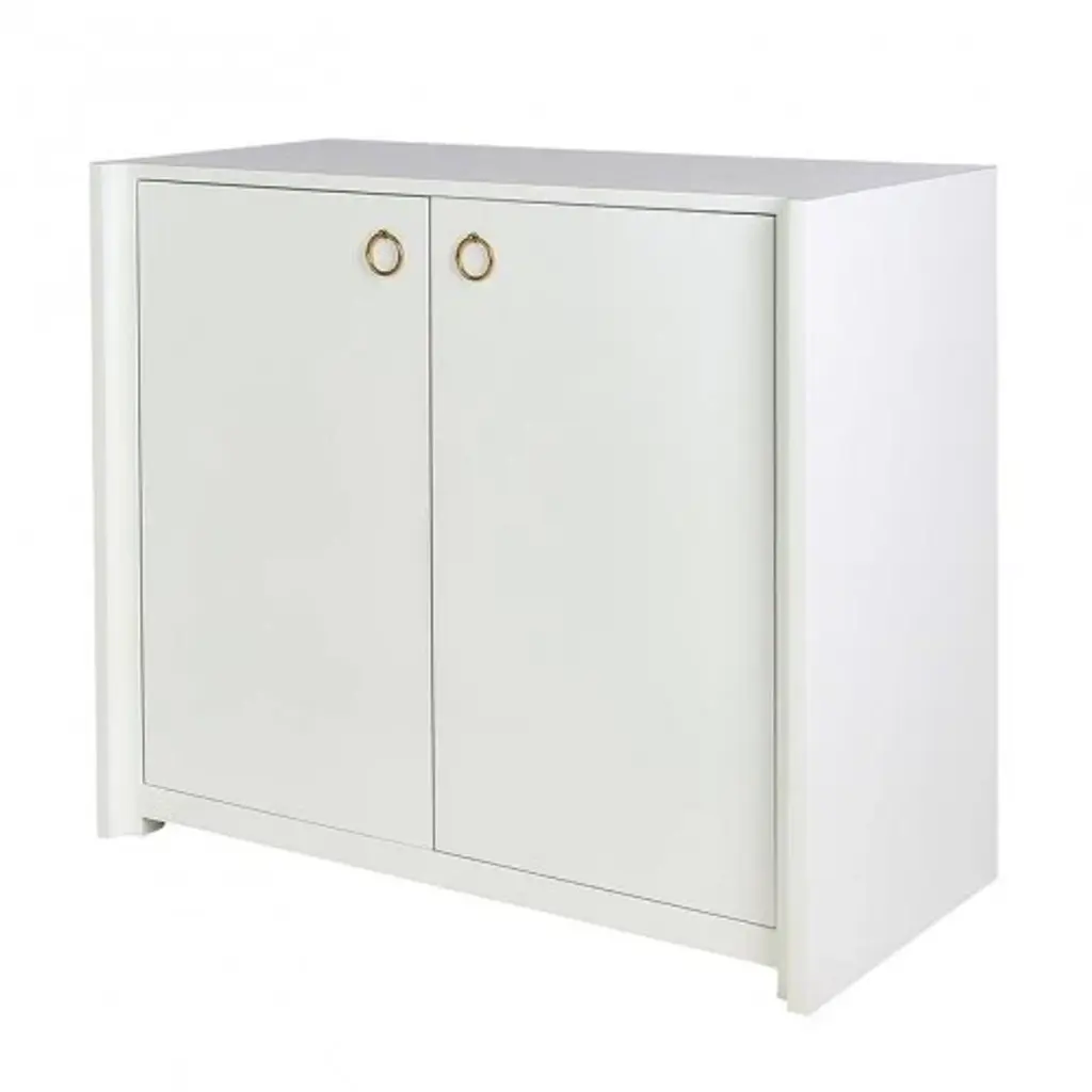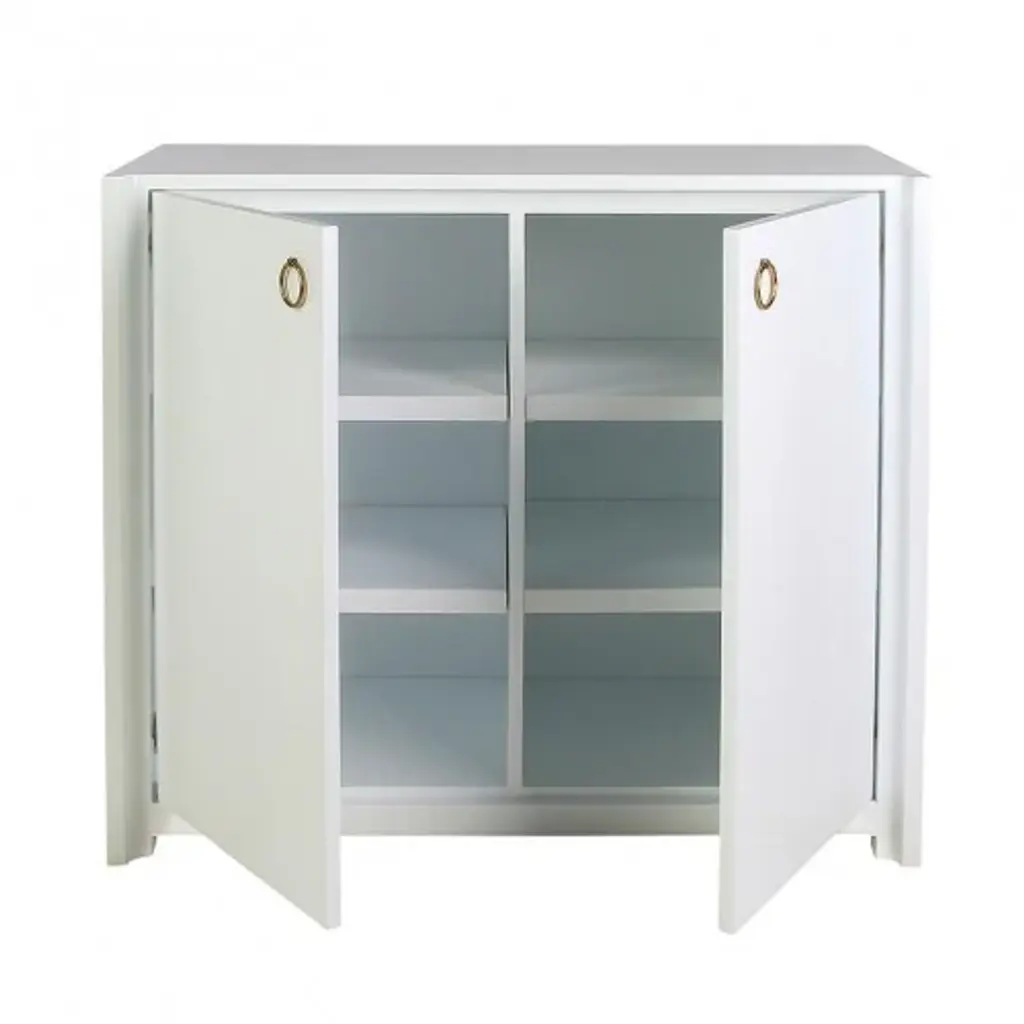 Made from birch wood, two cabinet doors are ready to store and conceal your items. Boasting a simplistic silhouette, this two-door cabinet will improve your living room or home office. Finish: White Painted Lacquer Material: Birchwood 38”w x 18.5”d x 32.5” 15 lbs 2 doors, 6 shelves Free Shipping in the U.S.