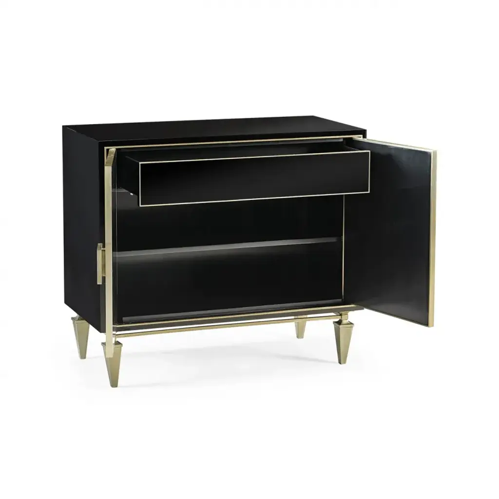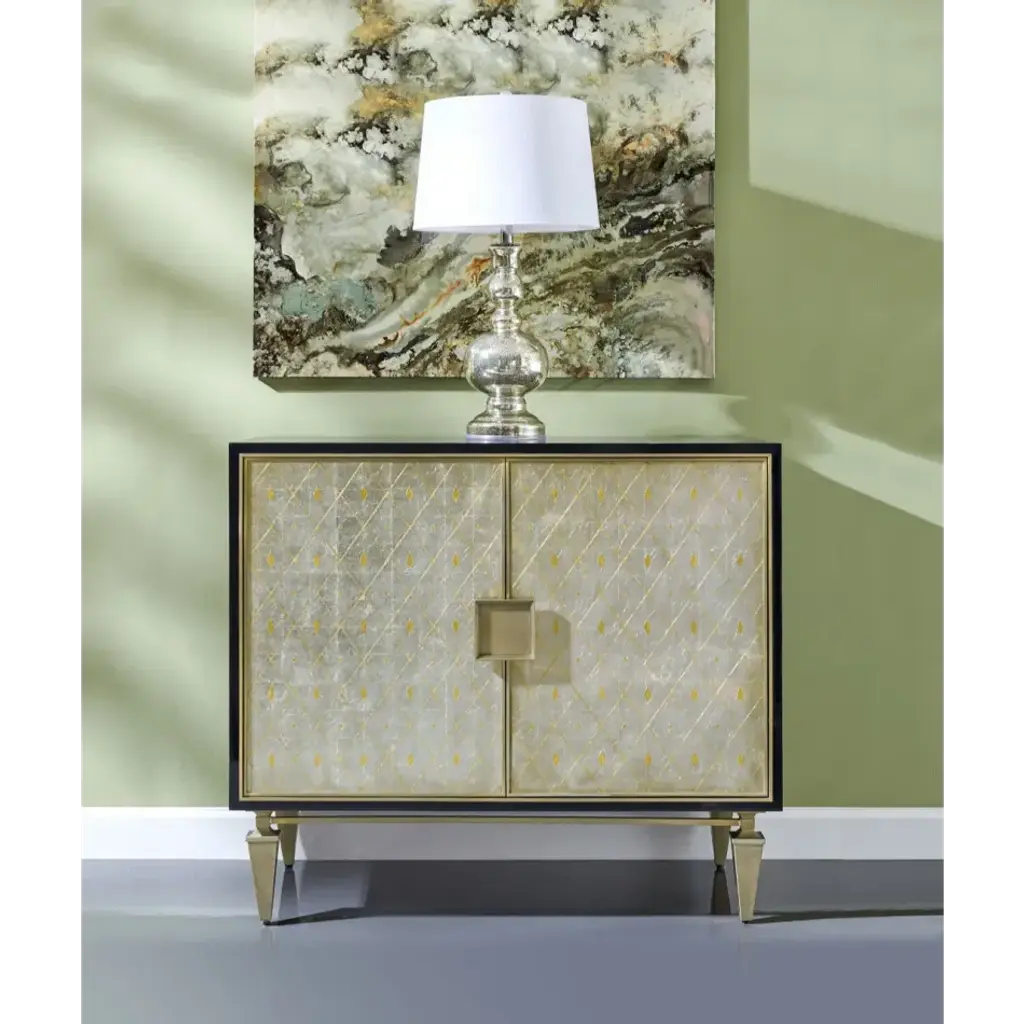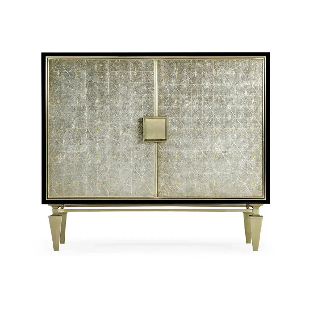 496070-PSG Inspired by French eglomise, the doors feature antiqued gold and silver leaf in a traditional harlequin pattern. Case is finished in a hand rubbed black lacquer. The base and hardware are cast in our foundry and finished in a light champagne patina.