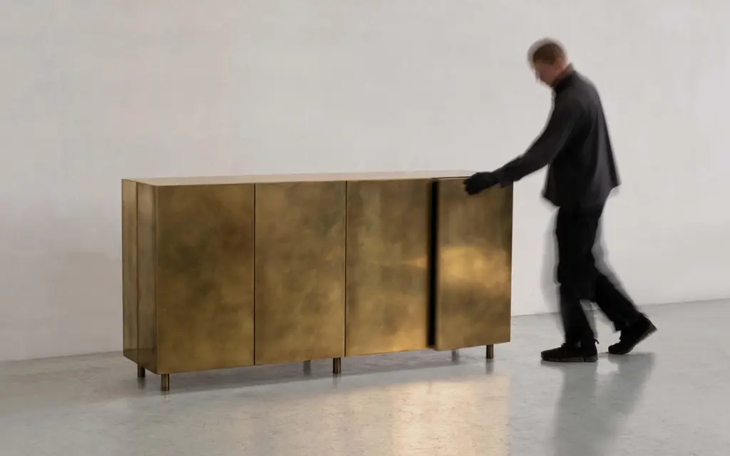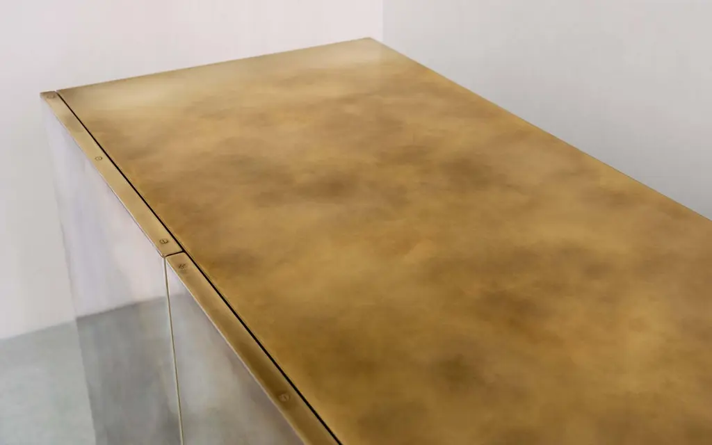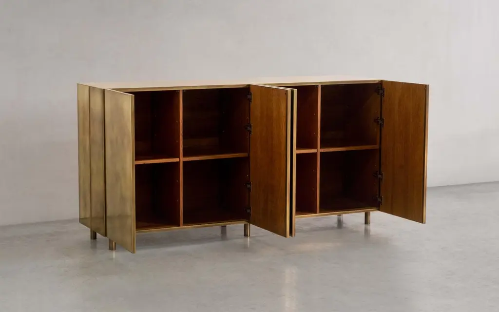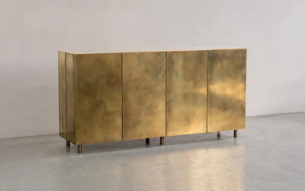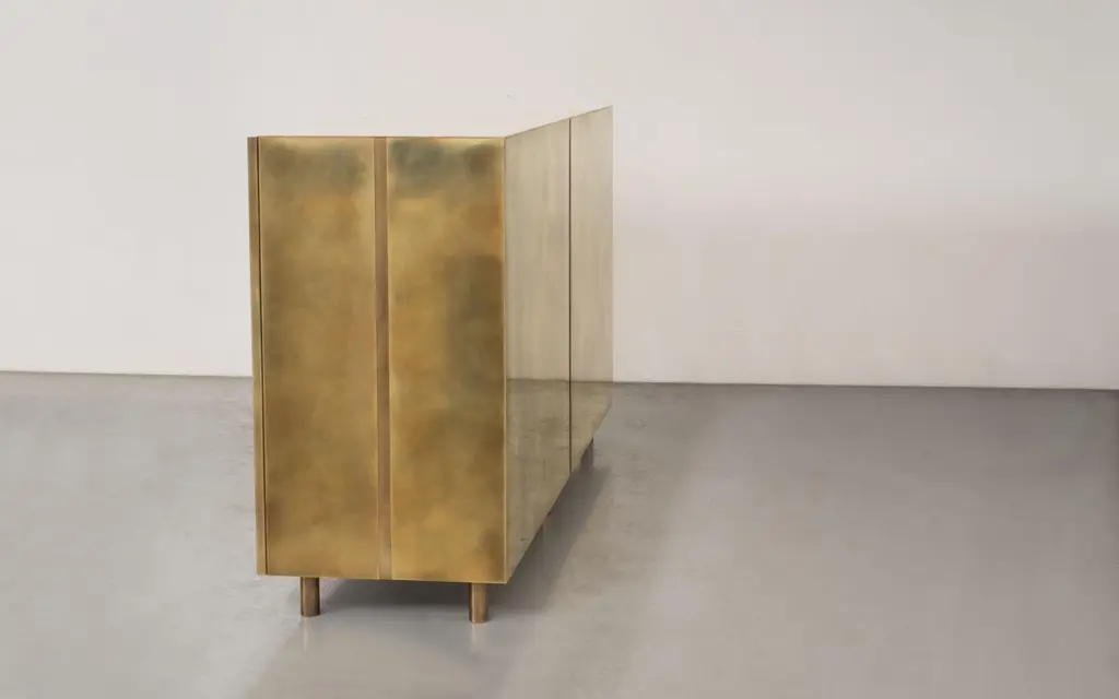 A four-doored sideboard in hand-patinated brass. Each door operates on push-to-open, soft-close hinges.Handcrafted in the North to order, this sideboard can be commissioned in bespoke sizes, configurations and finishes.Measures: 100cm height x 200cm width x 52cm depth.Custom sizes available upon request. Made to order in 12-16 weeks.Price excludes VAT.