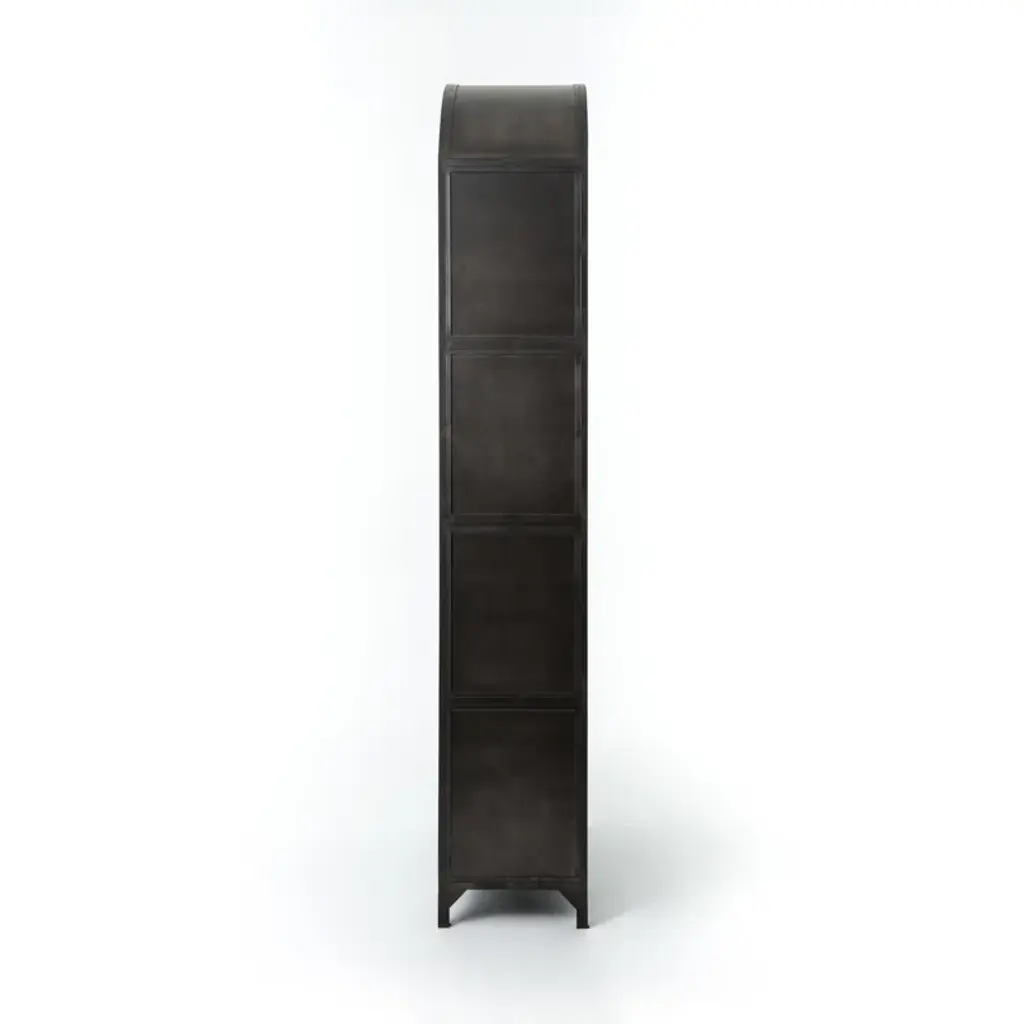 Arch appeal. Show off your favorite treasures with our industrial-inspired bookcase, featuring an eye-catching arched design. Crafted from solid iron sheeting in a soft matte finish, this piece boasts four spacious shelves with a 40 lb. weight capacity each. Glass doors with contrasting hardware protect your items while keeping them on display. Plus, a tip-over restraint device is included for added safety. Arrives fully assembled.