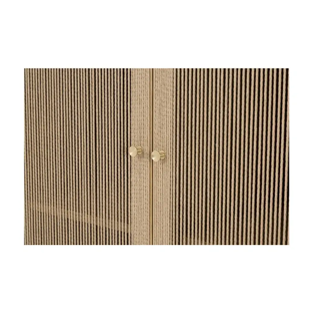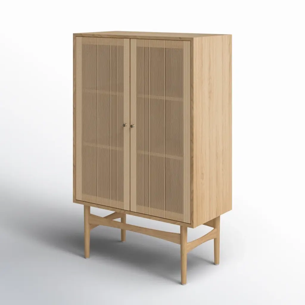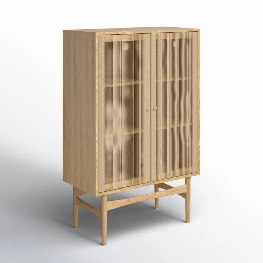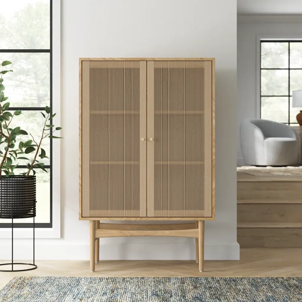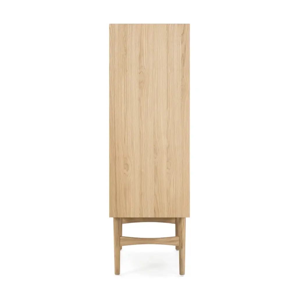 The cabinet is a fresh take on classic mid-century modern design. A solid, FSC-certified oak case is supported by a turned wood leg frame with sculpted crossbars. 2 hinged doors with intricately woven Danish paper cord detailing conceal adjustable shelves.