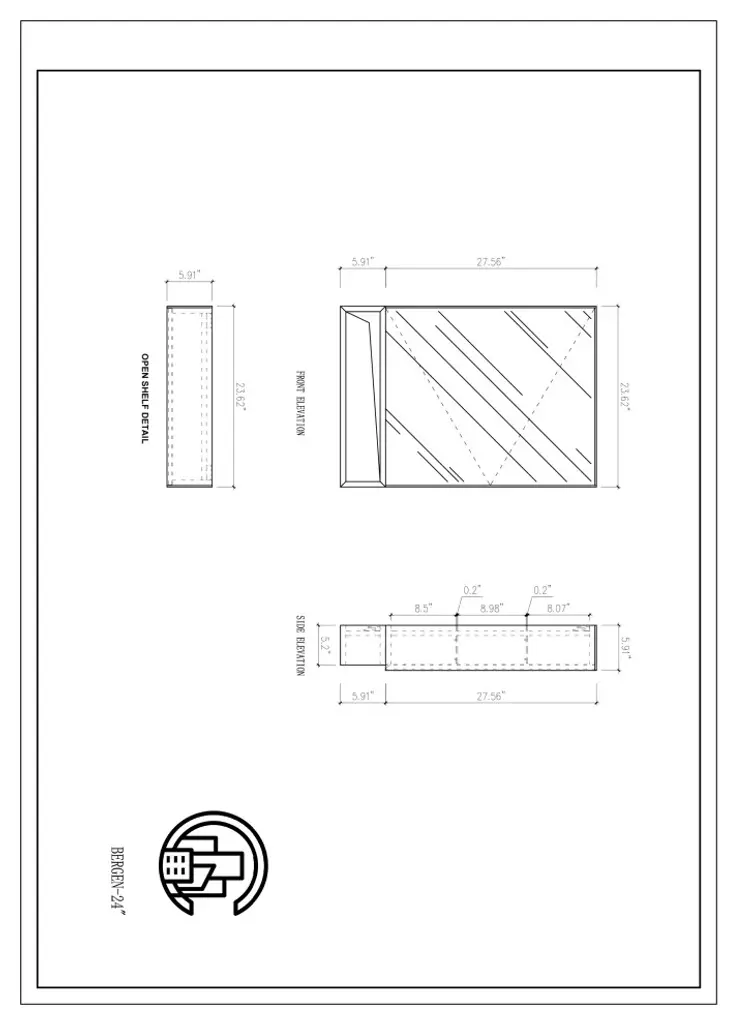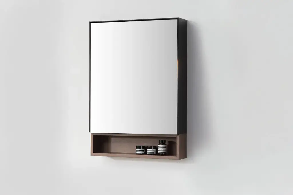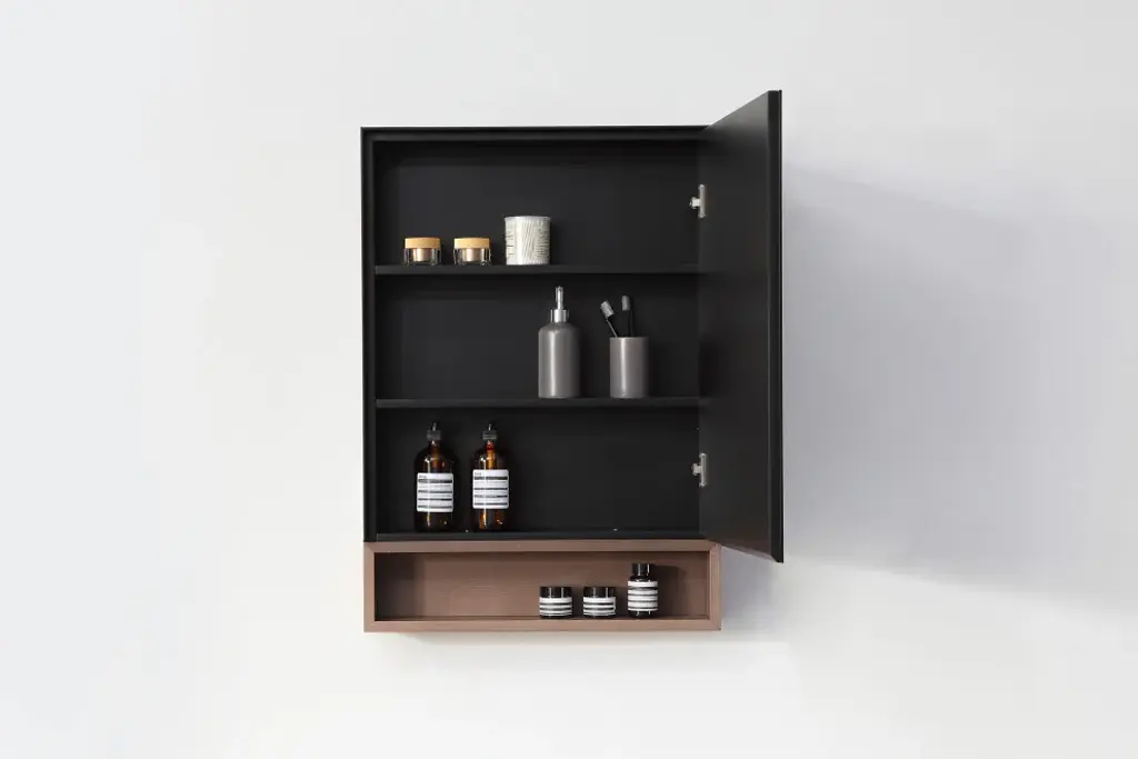 Product DescriptionCartisan Design is pleased to announce the Bergen medicine cabinet, shown in 24-inch Matte Black/Chestnut Oak. The elegant mirrored door opens easily to reveal three shelves with ample storage space. Underneath, an additional sturdy shelf made of high quality wood emphasizes the unit''s utility. The clean lines and high quality build will bring a sense of organization and warmth to your bathing space.The medicine cabinet is assembled and easy to installPremium metal frame in smooth matte black finishing colorElegant hardwood finishing for the bottom open shelf in chestnut colorWall mounted medicine cabinet with enough storage spacesLarge frame in detailed design with squared edge mirrorComes with metal inset hangers attached to the back of the cabinetMedicine cabinet can only be installed as shown in the pictureColor: Matte Black/Chestnut OakDimension:Upper Cabinet: 23.62"(Width) x 27.56" (Height) x 5.91" (Depth)Lower Open Shelf: 23.62"(Width) x 5.91" (Height) x 5.2" (Depth)Total: 23.62"(Width) x 33.47" (Height) x 5.91" (Depth)