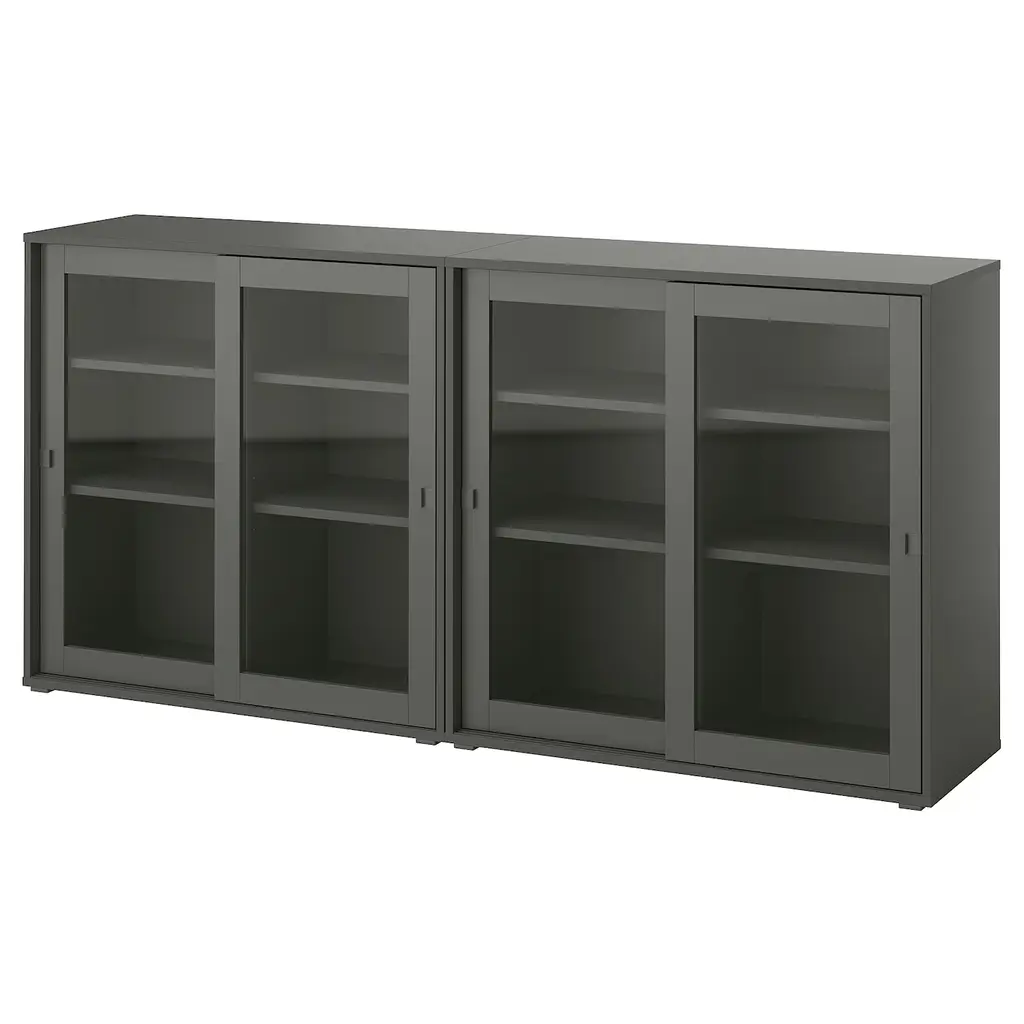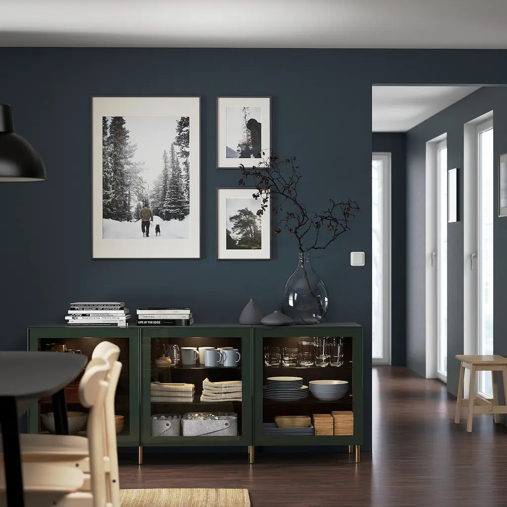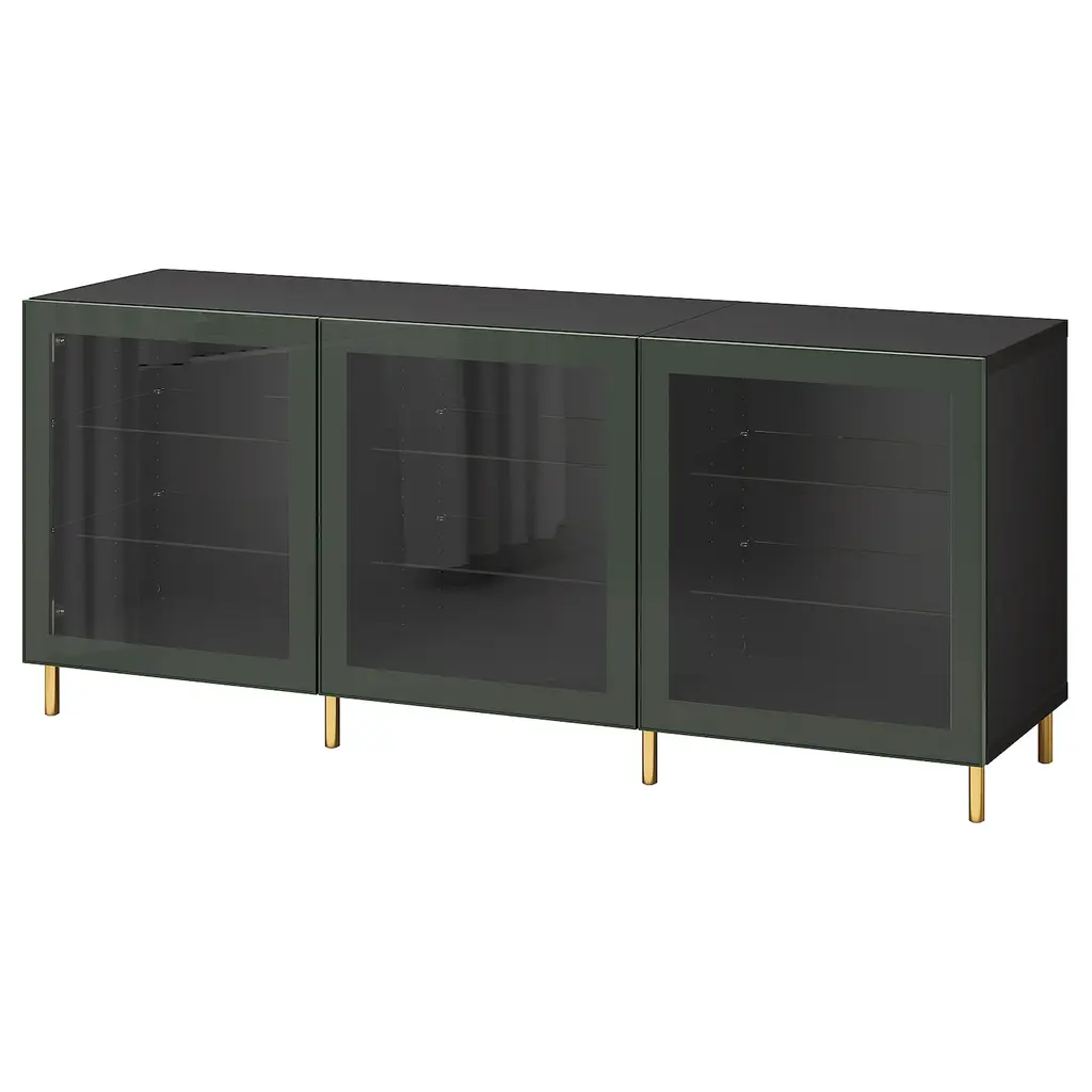 BESTÅ Storage combination with doors - black-brown Glassvik/Ösarp/dark olive-green clear glass 70 7/8x16 1/2x29 1/8 ". Adjustable hinges allow you to adjust the door horizontally and vertically. Adjustable shelves, so you can customize your storage as needed.